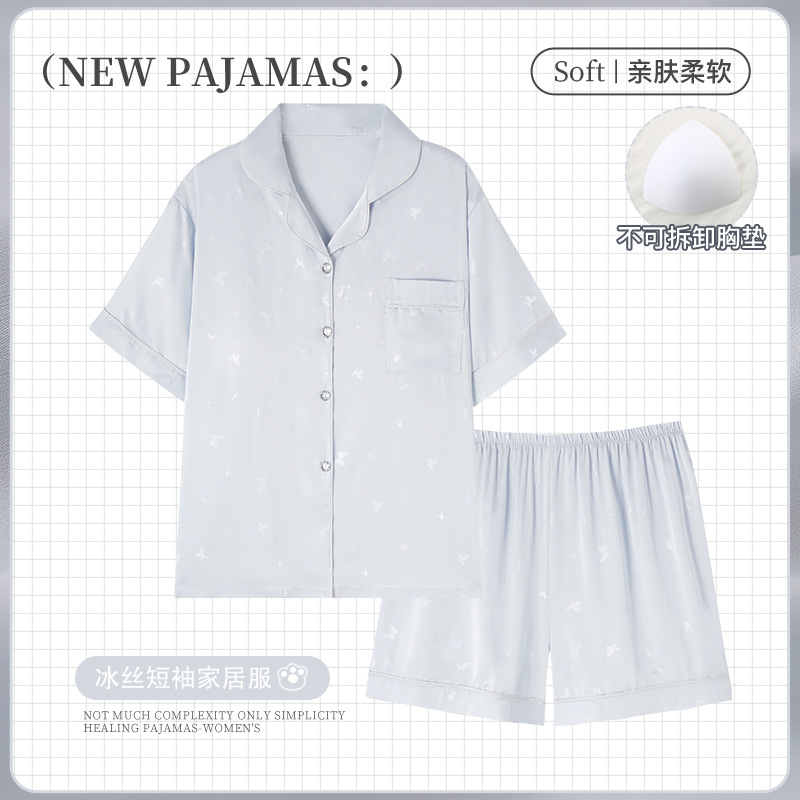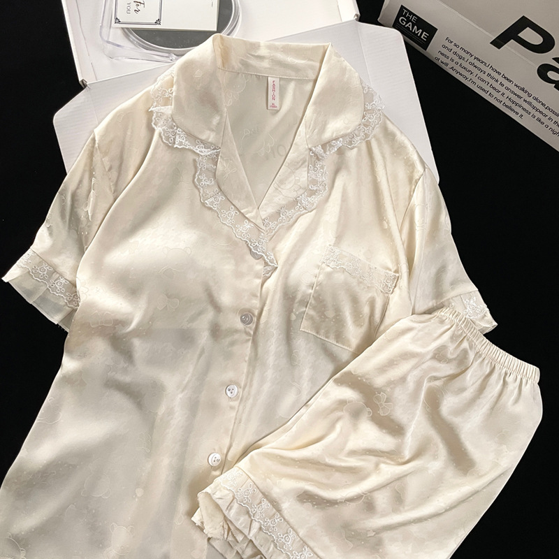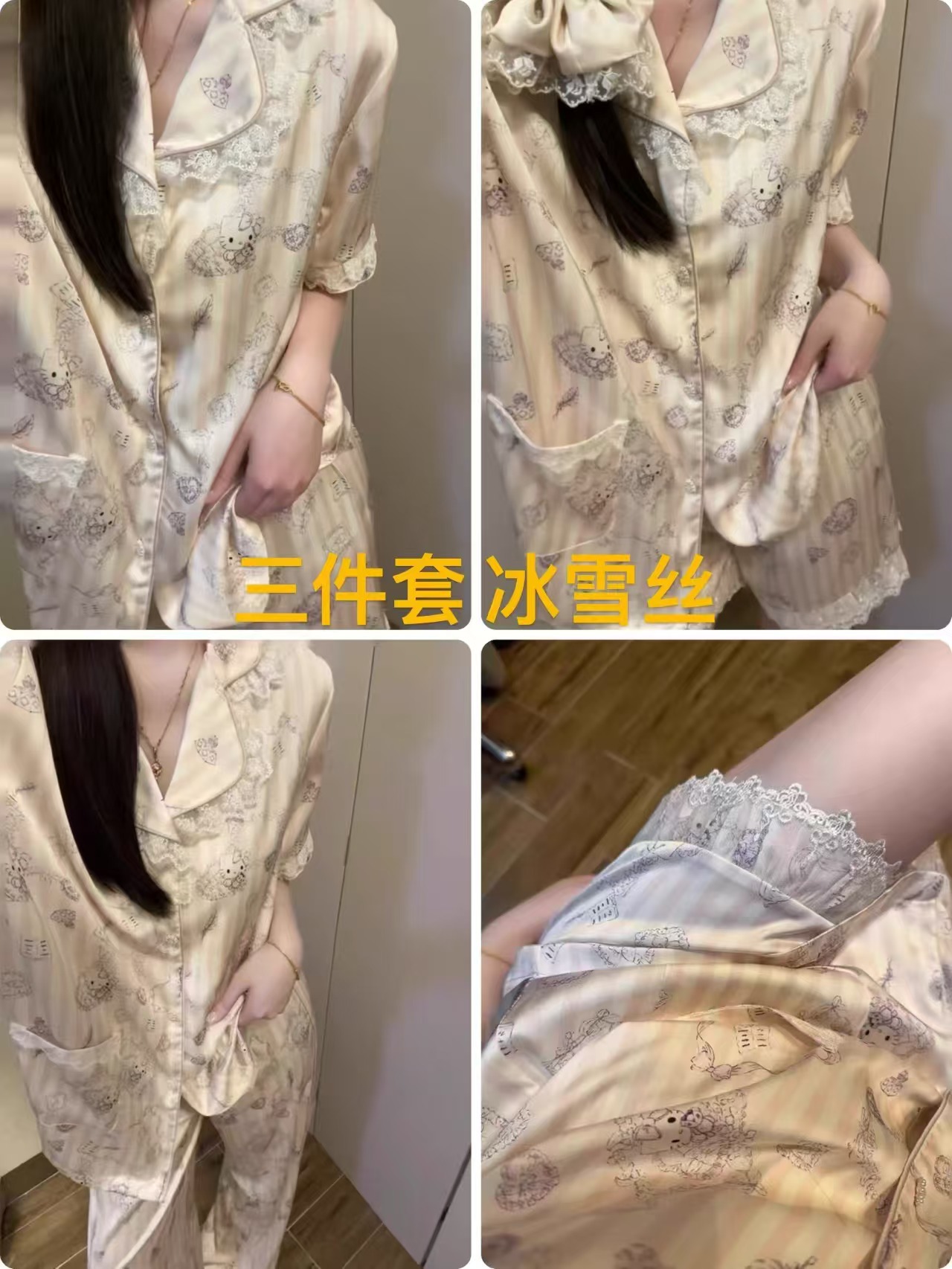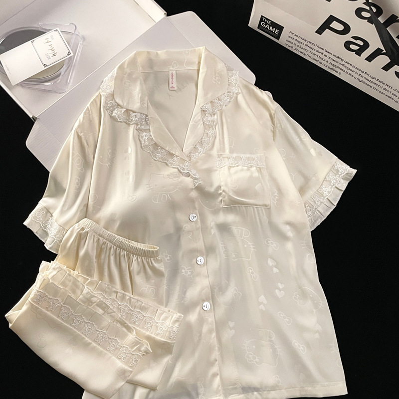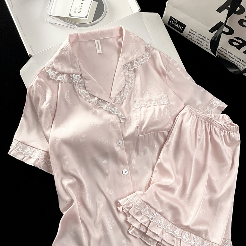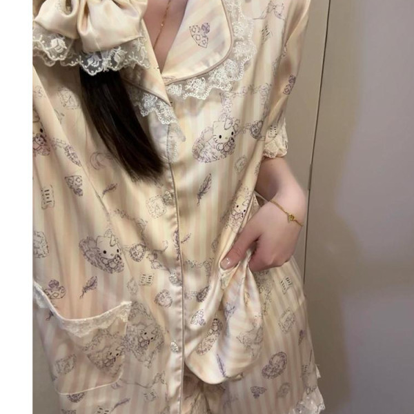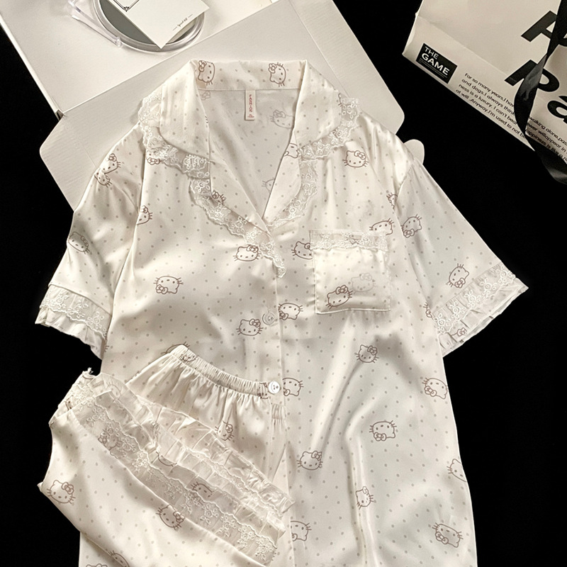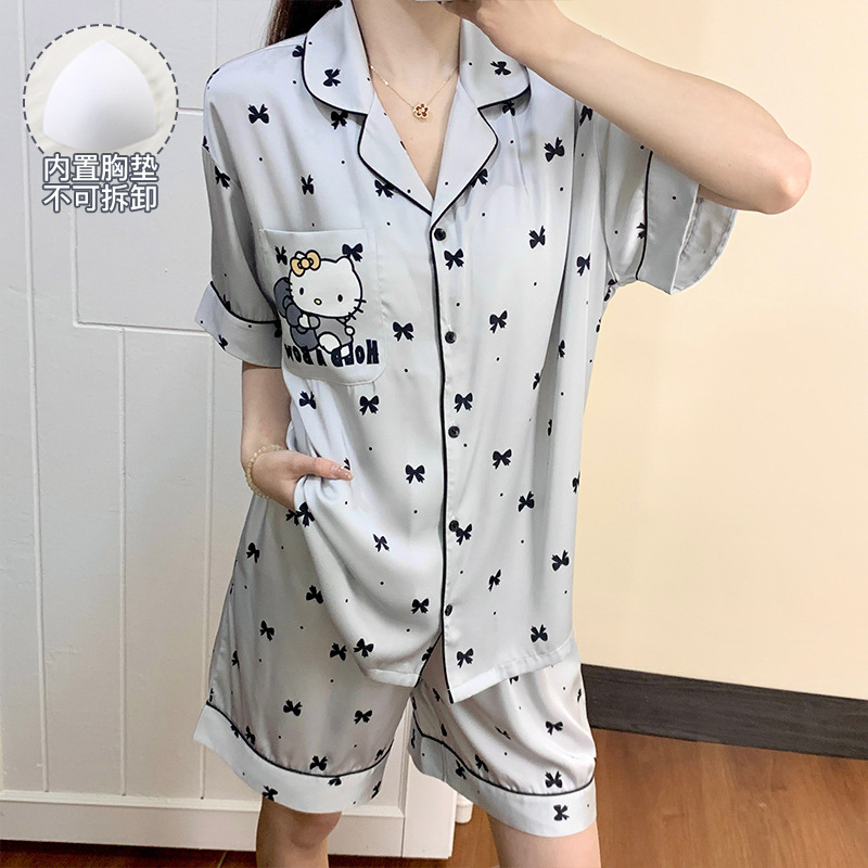여성을위한 귀여운 KT 고양이 얼음 실크 잠옷 여름 옷깃 반팔 반바지 달콤한 실크 하이 엔드 홈웨어 세트