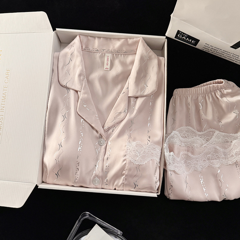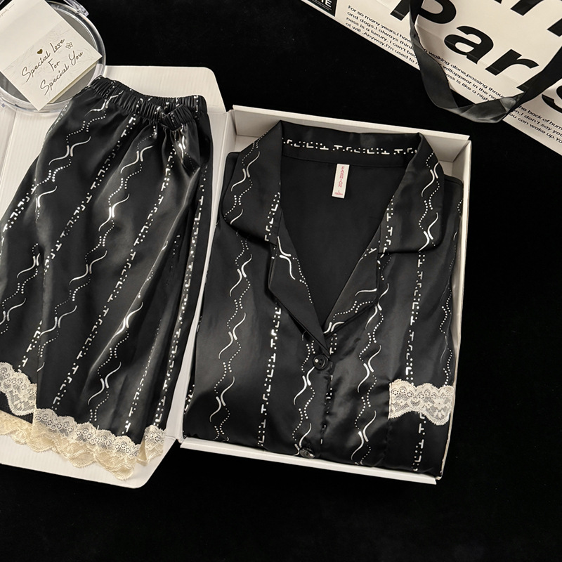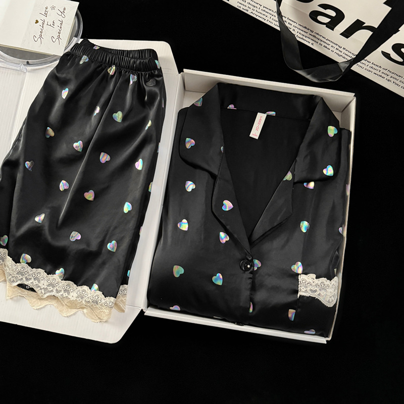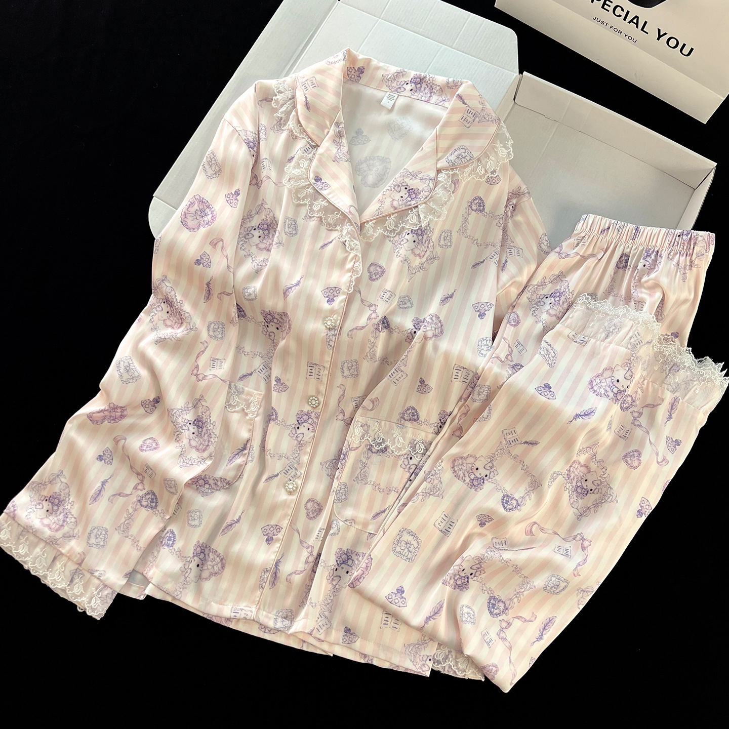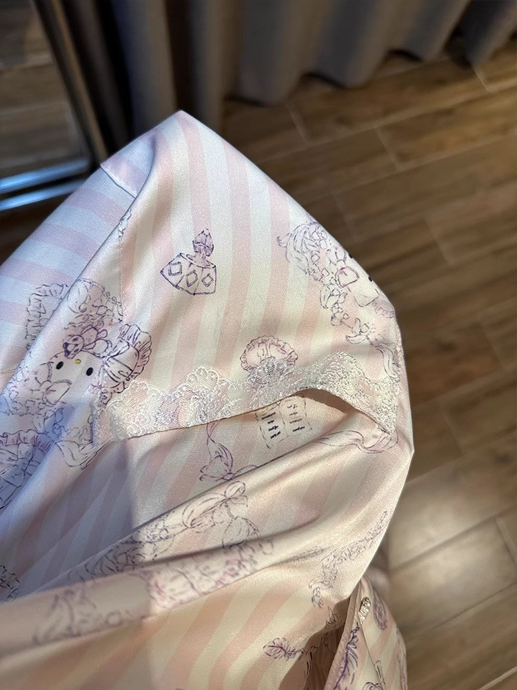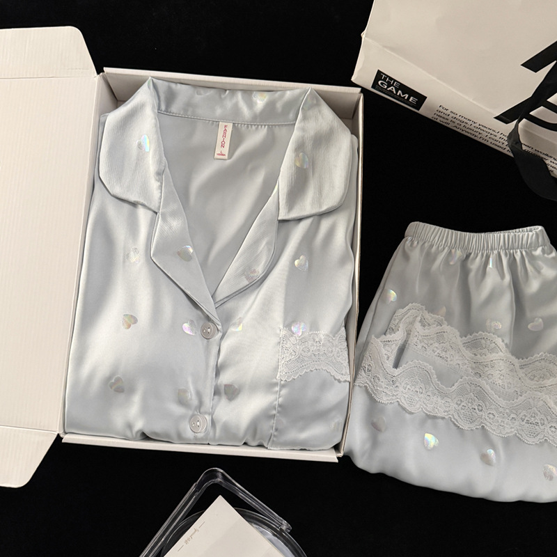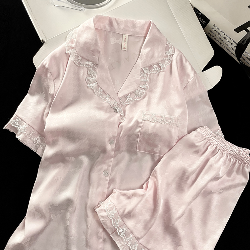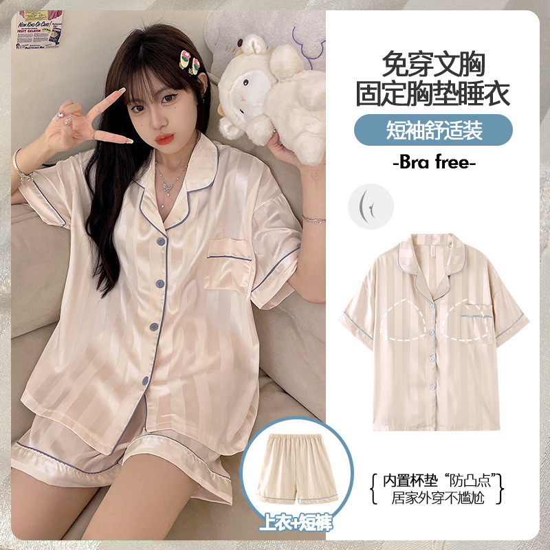 여성을위한 귀여운 KT 고양이 얼음 실크 잠옷 여름 옷깃 반팔 반바지 달콤한 실크 하이 엔드 홈웨어 세트