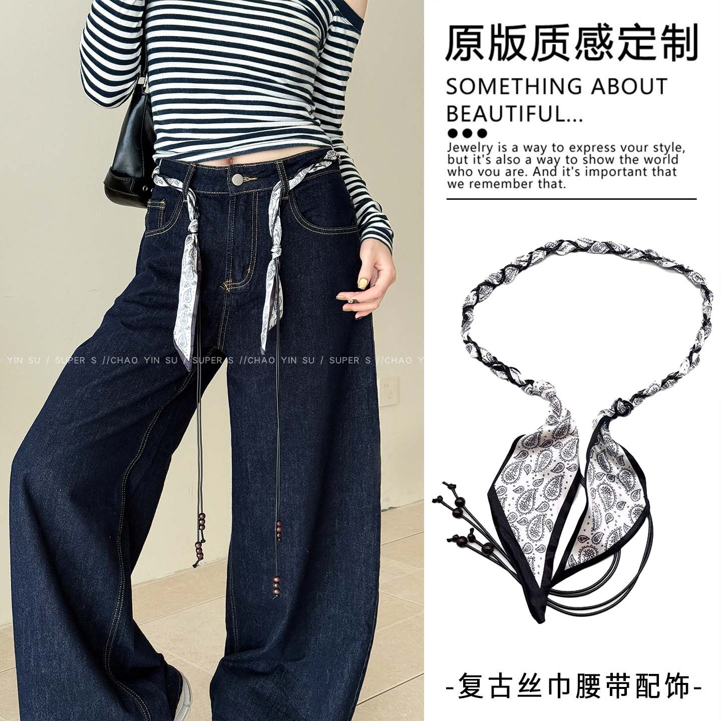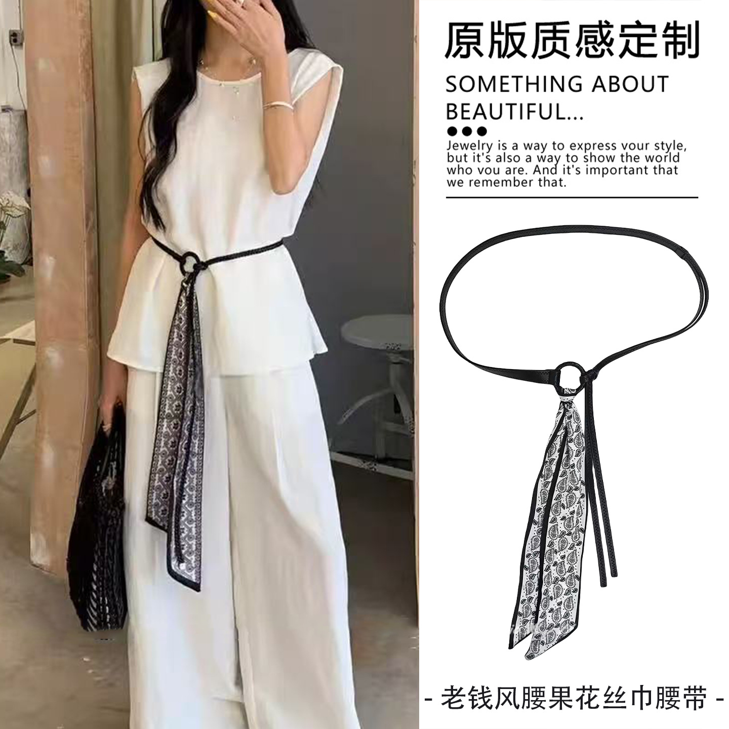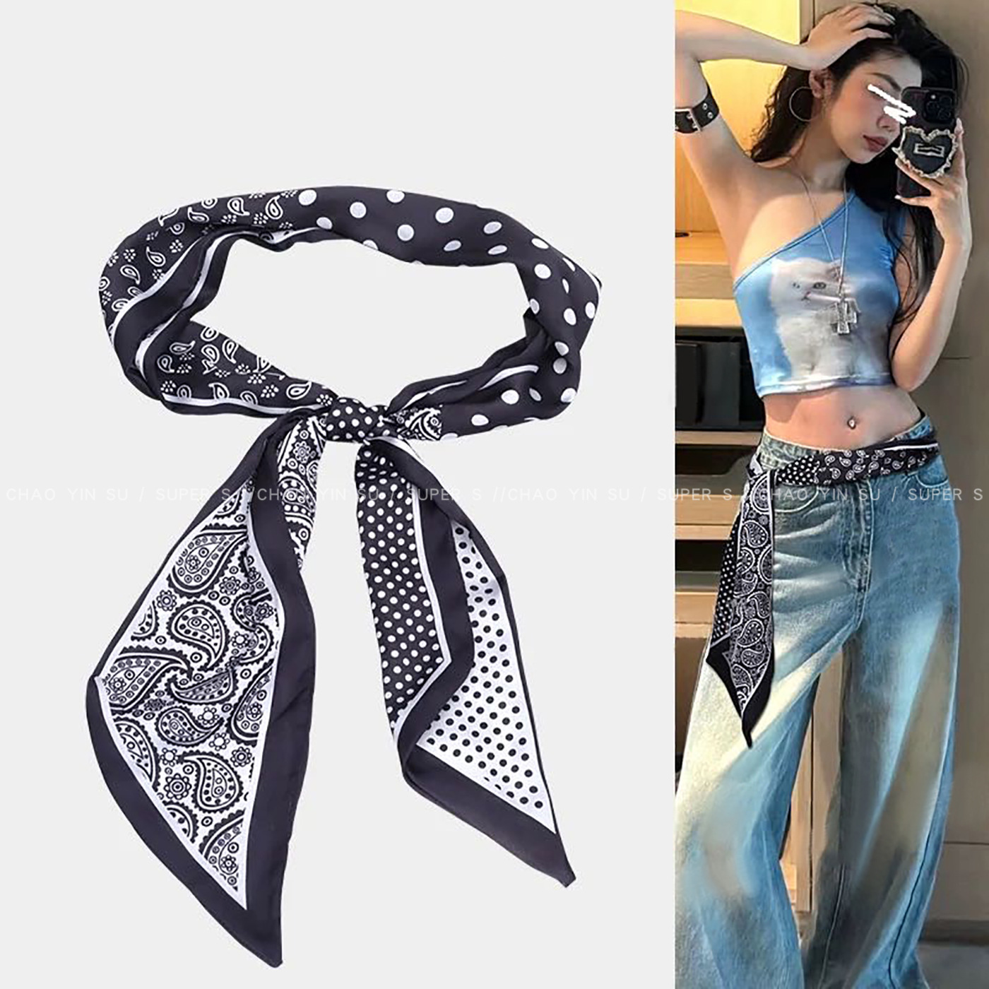 • 흑백 데이지 실크 스카프 비즈 허리끈 - 110cm