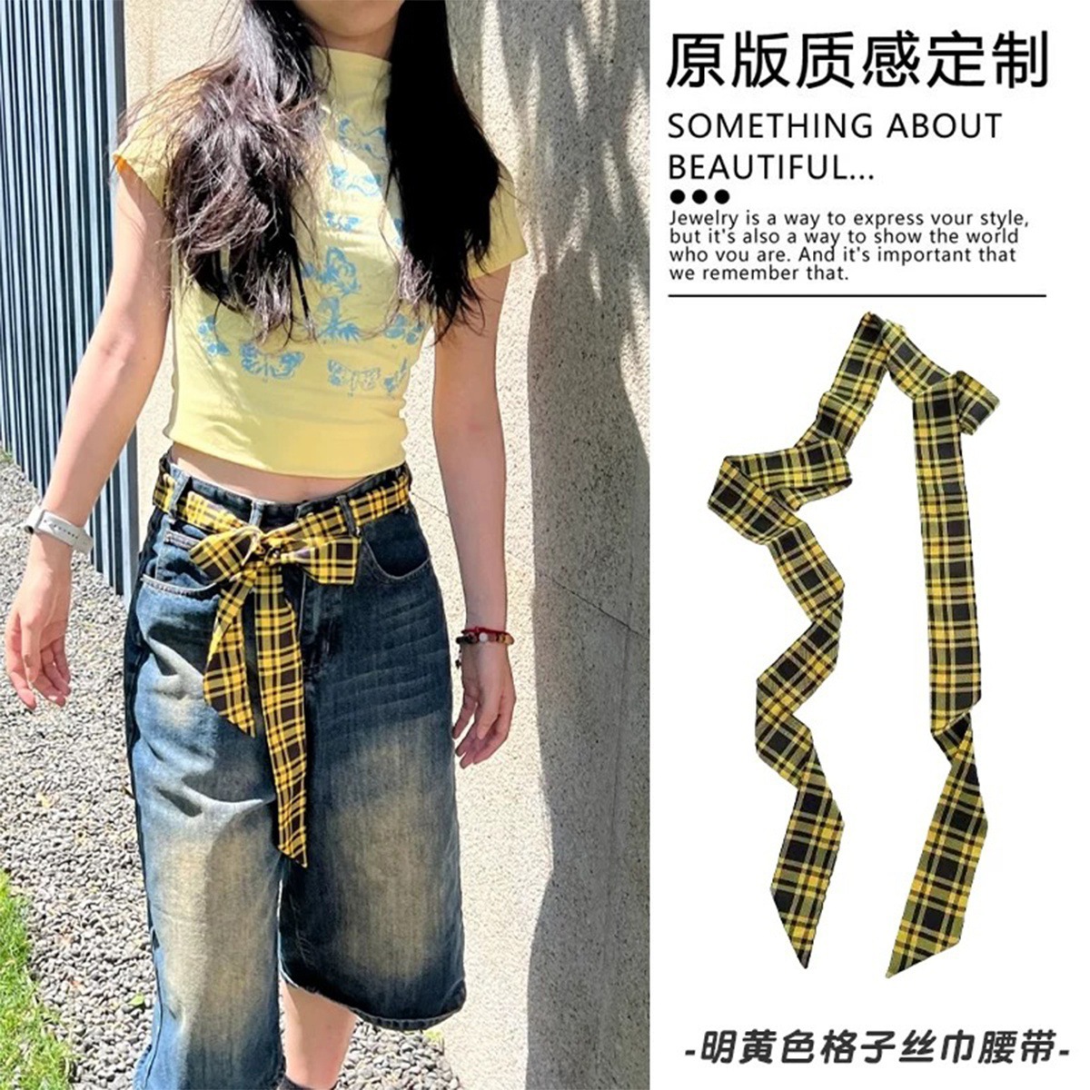 • 블랙과 옐로우 컬러의 패치워크 패브릭 체크무늬 벨트-136CM