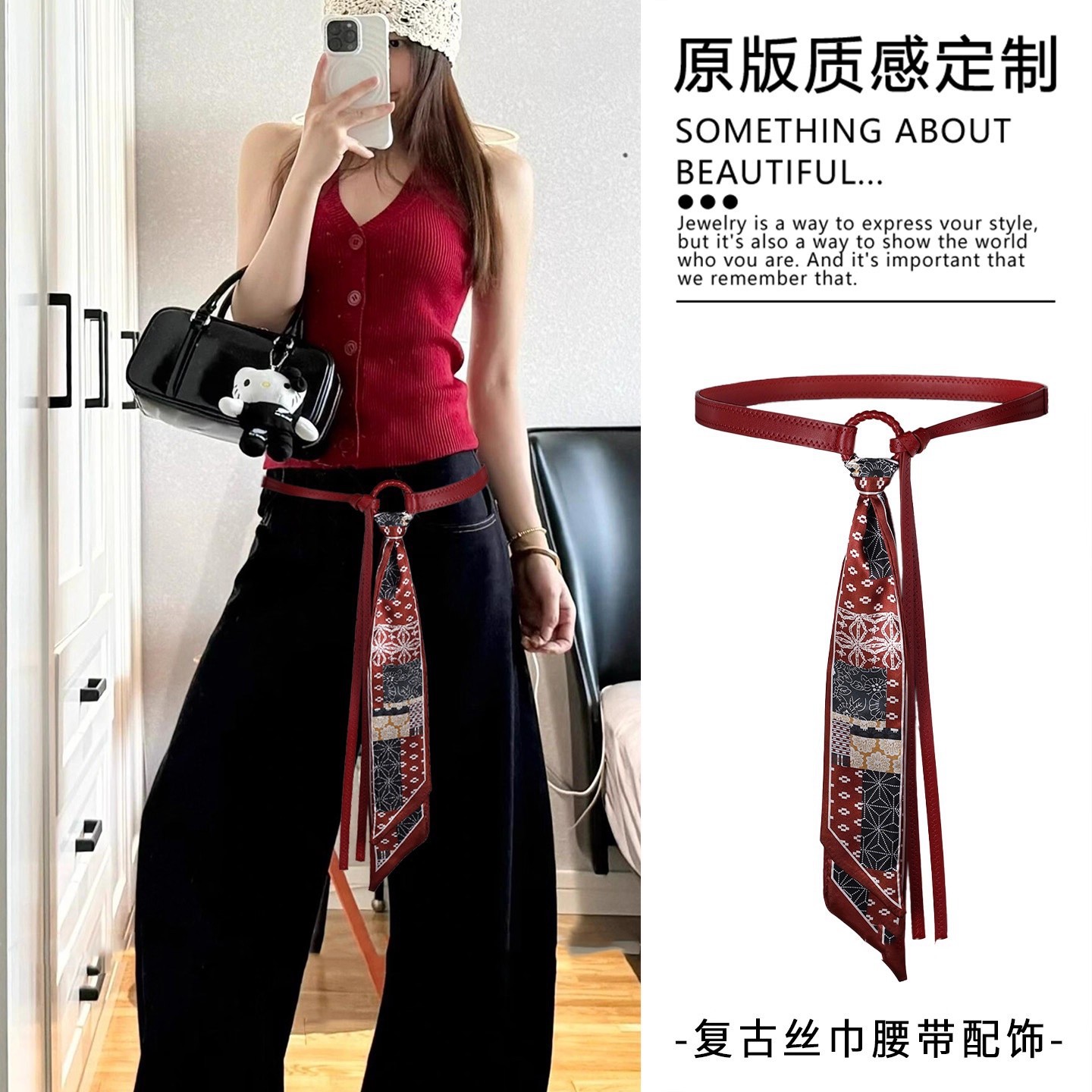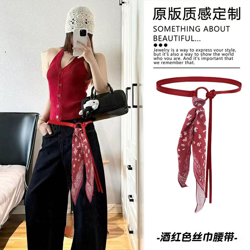 • 레드 리본 캐슈 플라워 실크 스카프 벨트 - 136cm