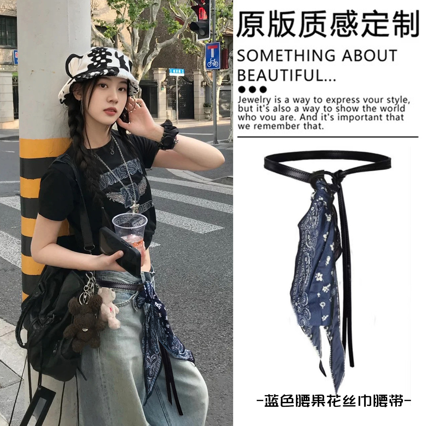 • 블루 리본 캐슈 플라워 실크 스카프 벨트-136cm