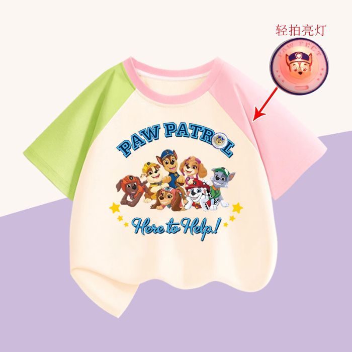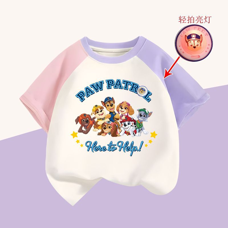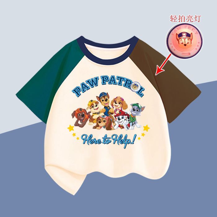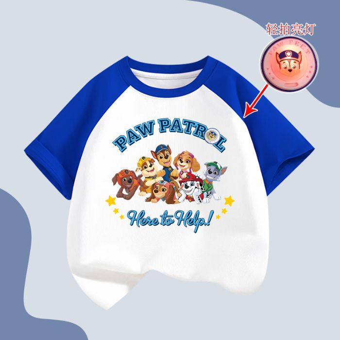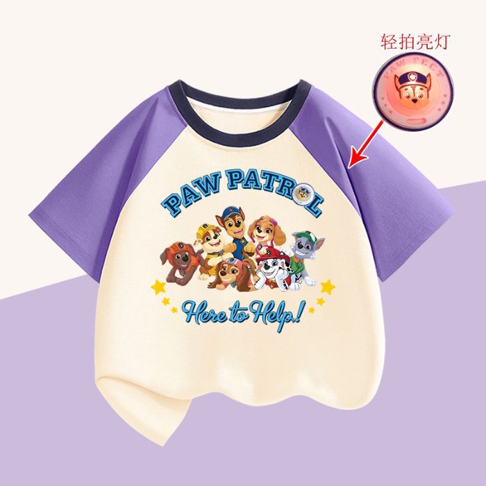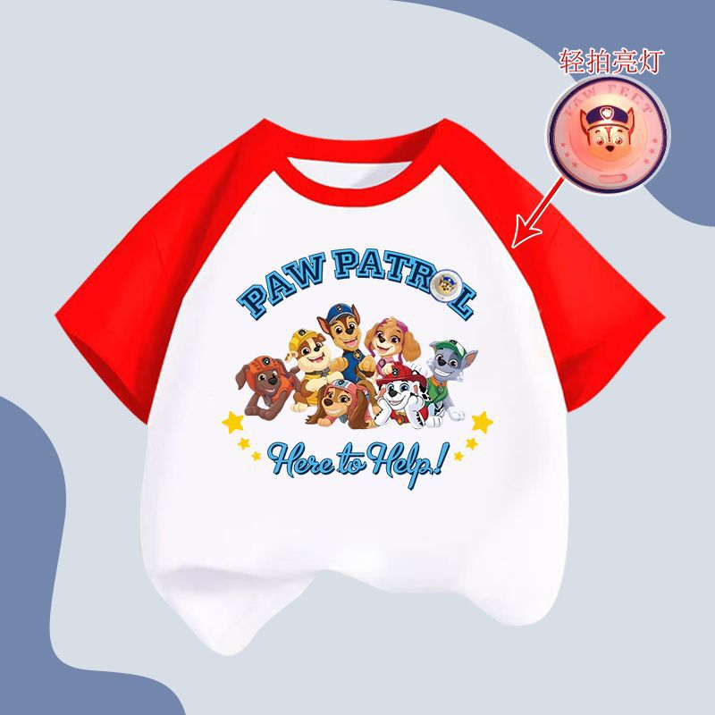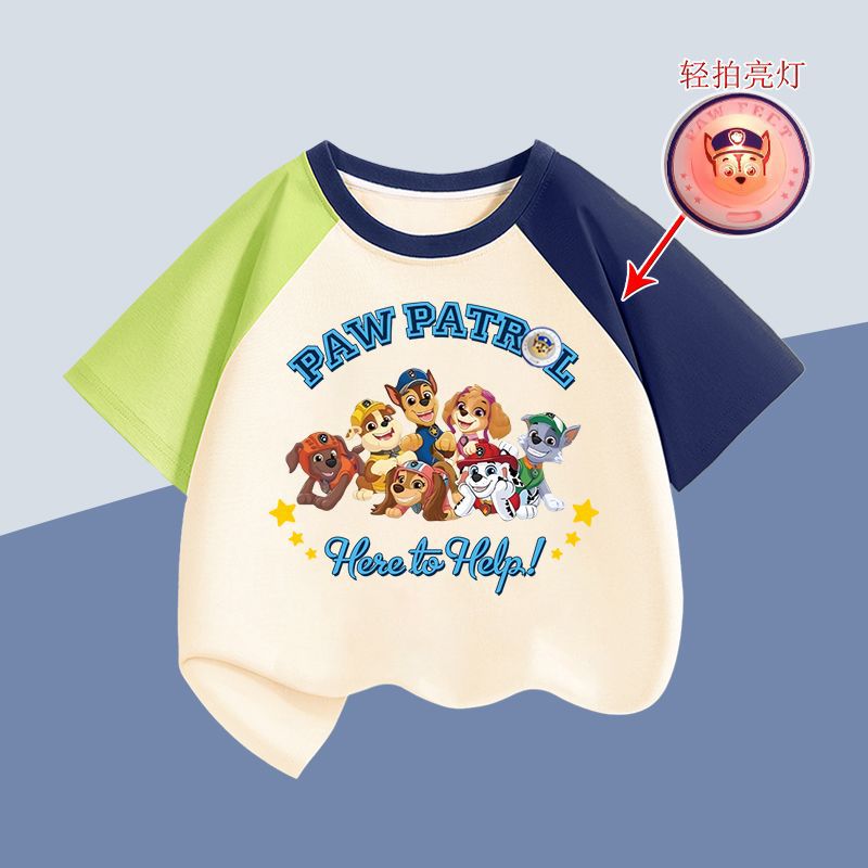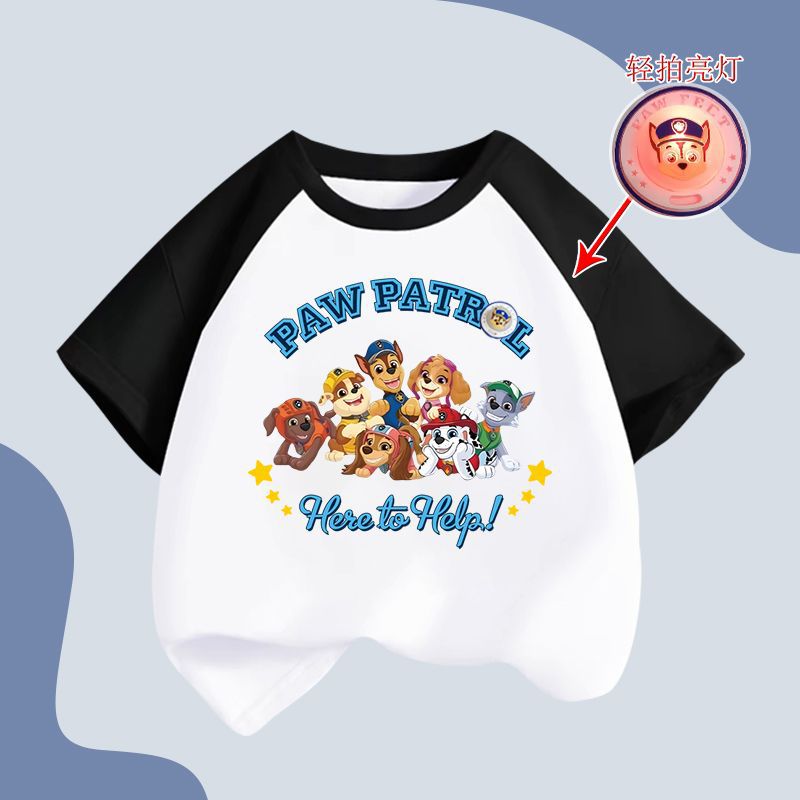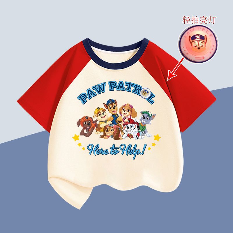 소년과 소녀 Paw Patrol 조명 반팔 티셔츠 여름 중대형 어린이 만화 패턴 순수 코튼 라글란 탑