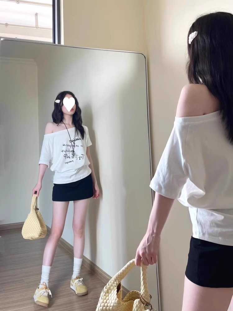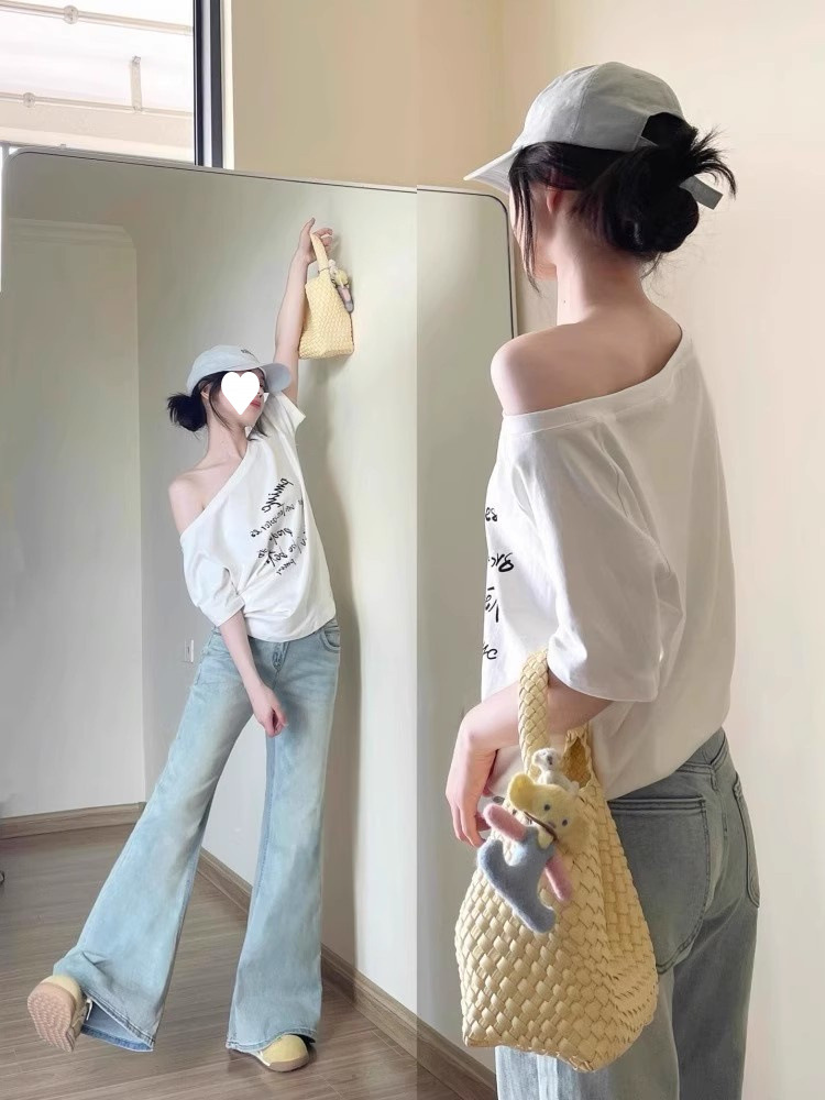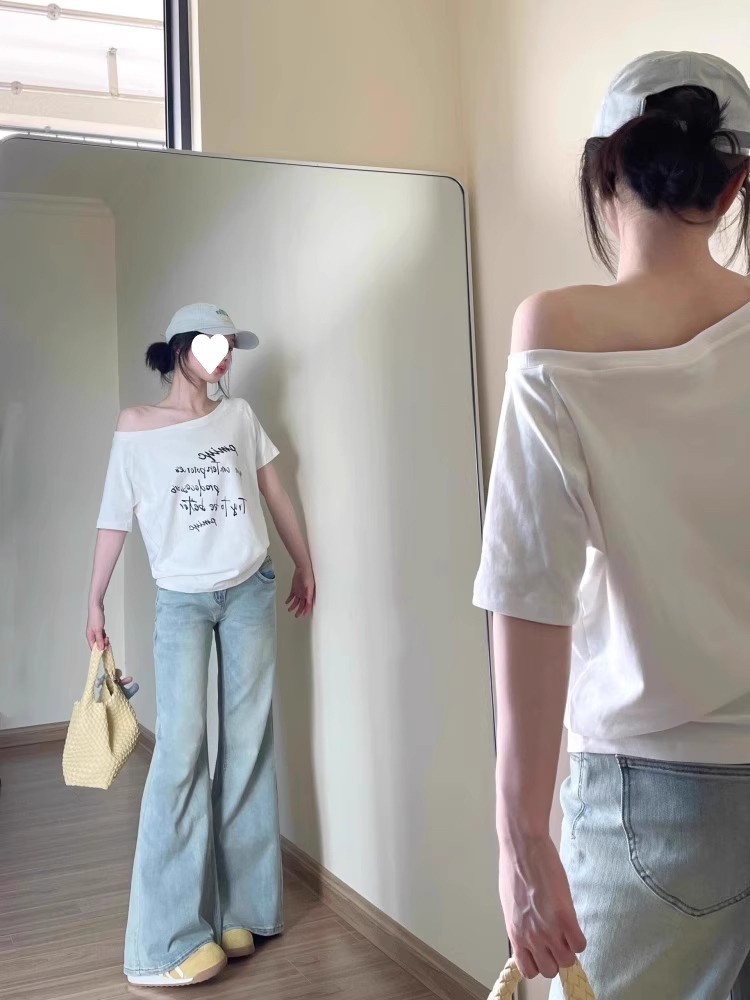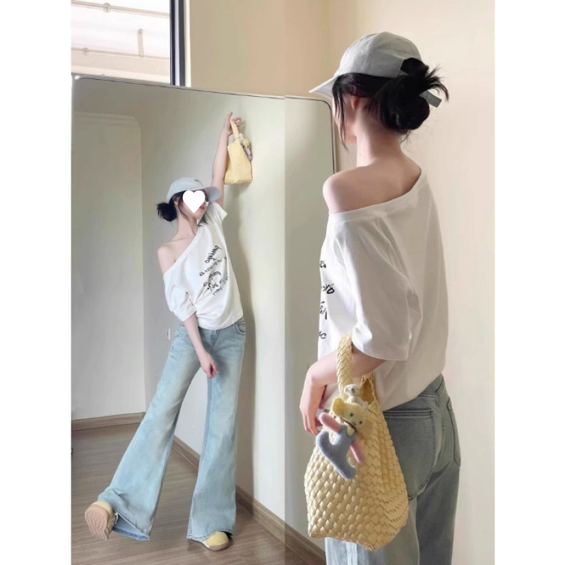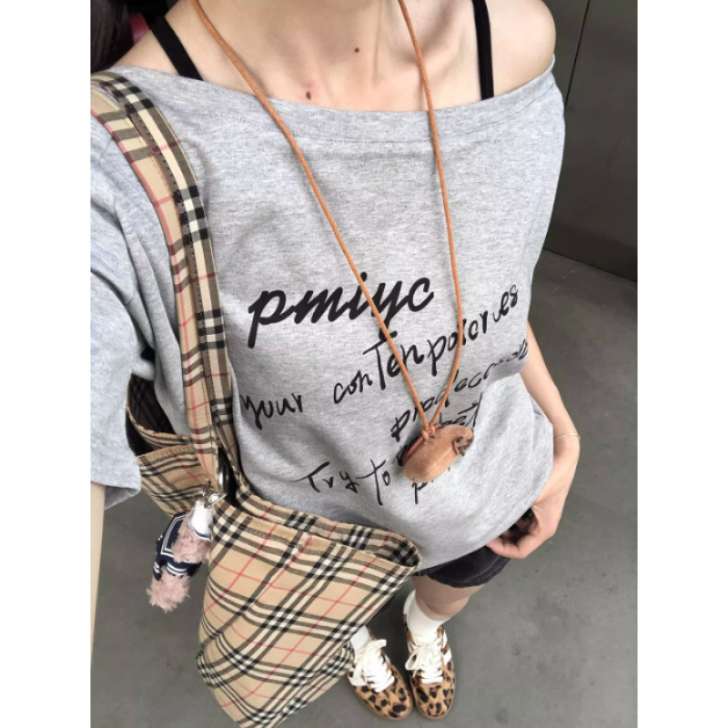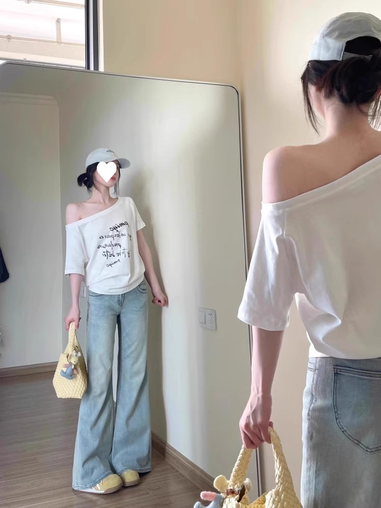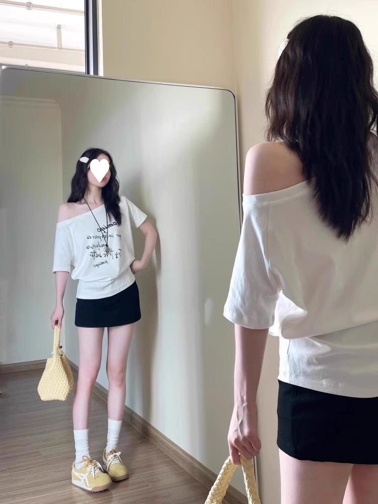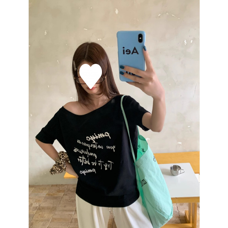 화이트 오프숄더 한국 시크 레터 프린트 여성용 반팔 티셔츠 시크한 여름 디자인 오프숄더 니치 탑스토어 가기