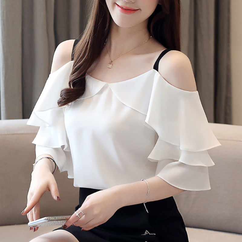 여성용 쉬폰 셔츠, 새로운 여름 스타일의 작은 셔츠, 디자인 화이트 반팔 러플 셔츠, 다용도 서스펜더 탑스토어 가기