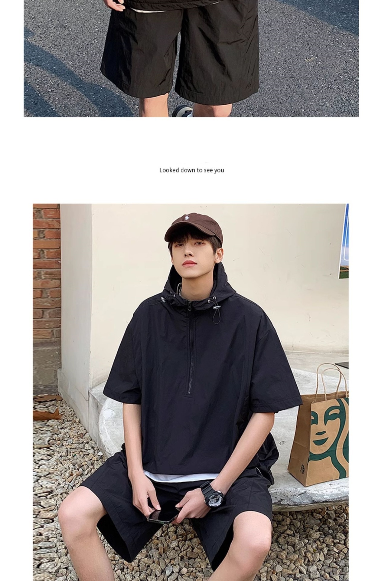 여름 신작 작업복 트렌디 브랜드 캐주얼 스포츠 정장 남성용 아이스 느낌 하프 지퍼 후드 다용도 속건 반팔 반바지스토어 가기