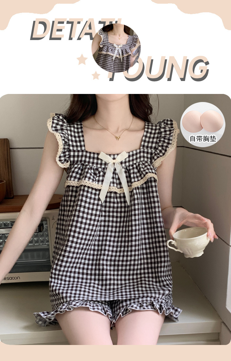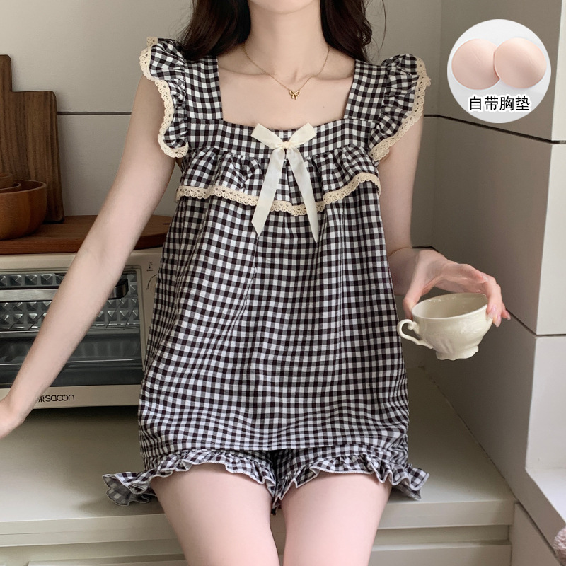 여름 여아용 한국식 체크무늬 잠옷, 가슴 패드가 있는 소녀용 나비넥타이, 조끼 드레스, 루즈한 작은 플라잉 슬리브 홈웨어 세트