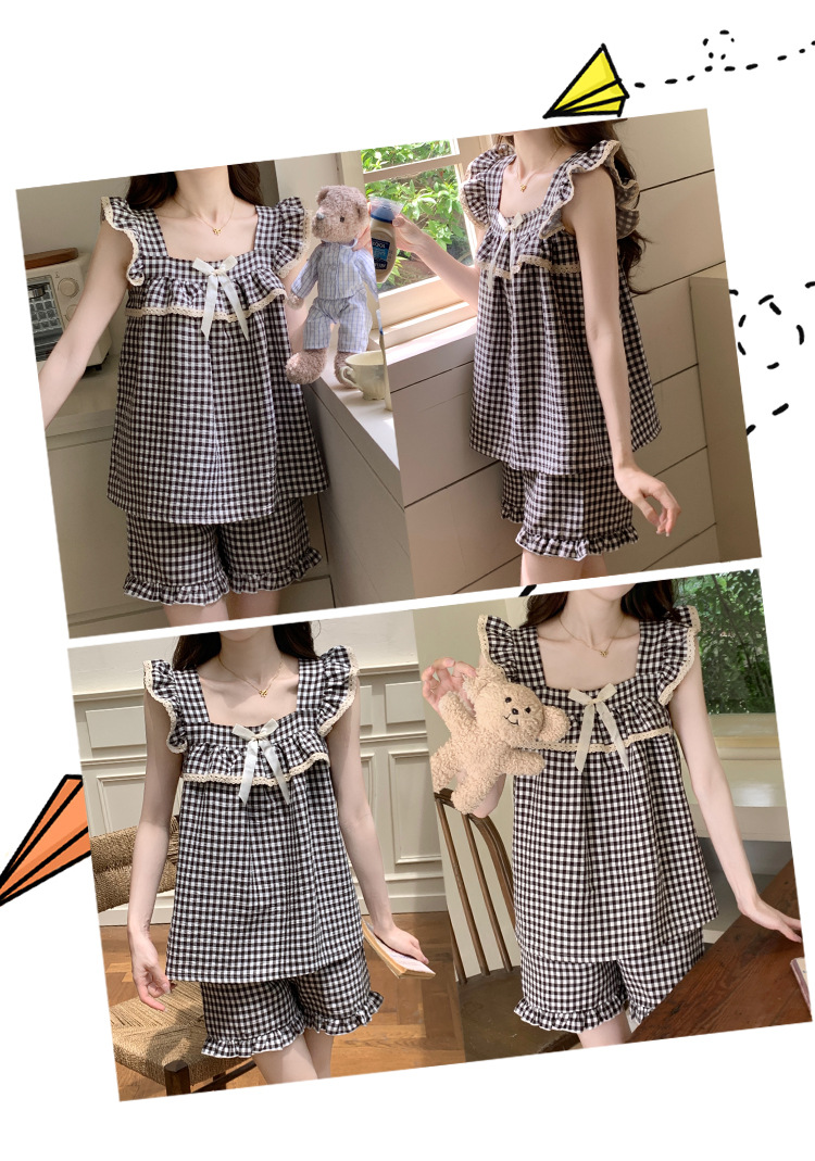 여름 여아용 한국식 체크무늬 잠옷, 가슴 패드가 있는 소녀용 나비넥타이, 조끼 드레스, 루즈한 작은 플라잉 슬리브 홈웨어 세트스토어 가기