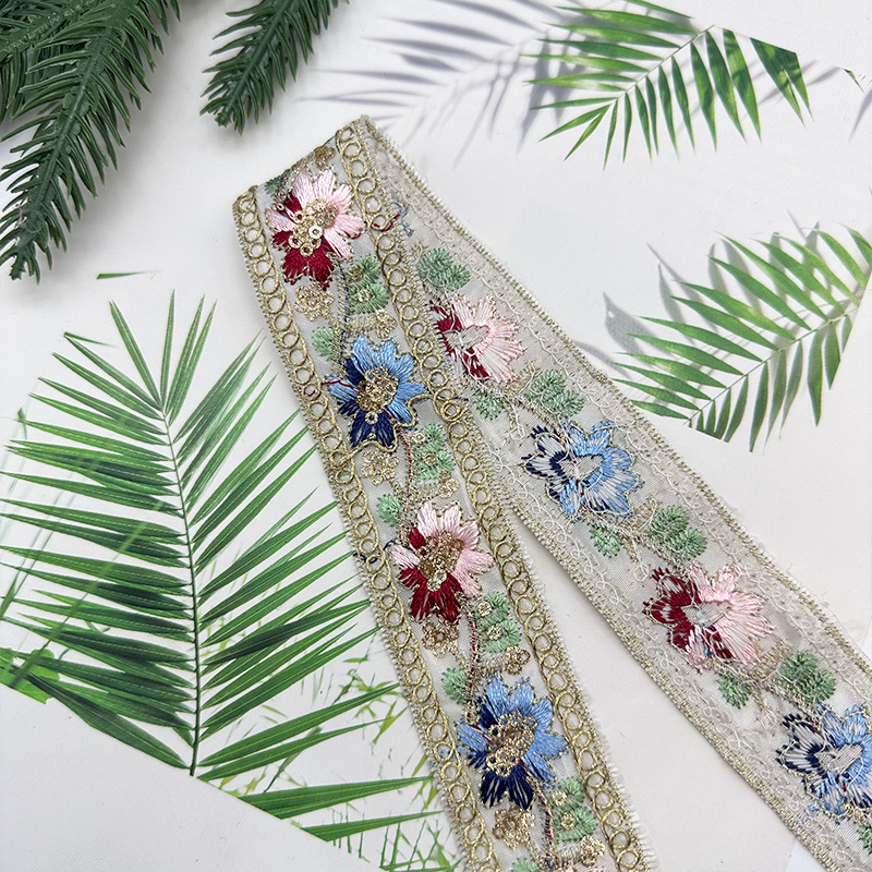 중국 스타일의 다채로운 꽃 자수 레이스 Dai 의류 칼라 스커트 액세서리 바코드 스트립 로프 스팽글 자수스토어 가기