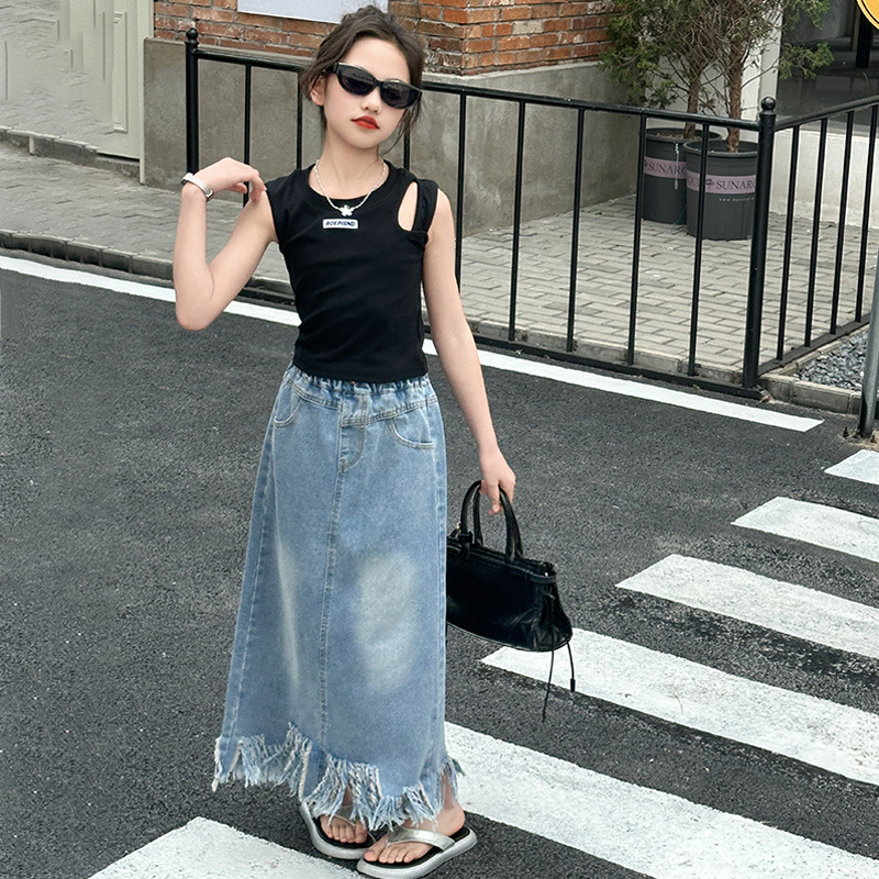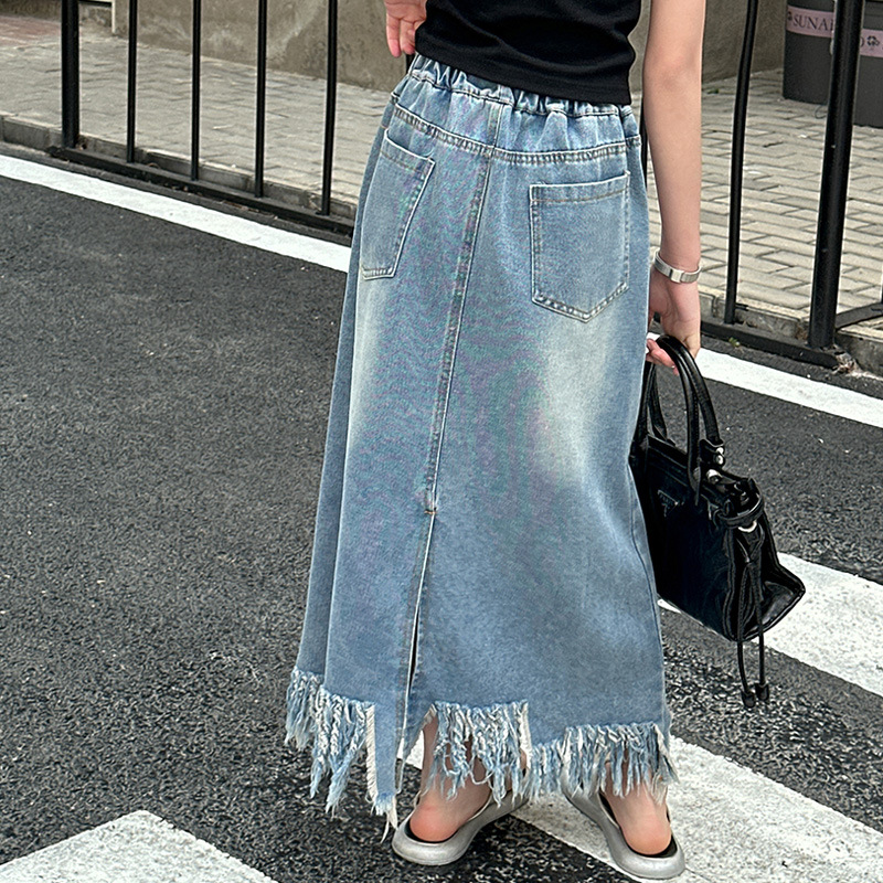 여자 데님 스커트 여름 스커트 2025 새로운 스타일 어린이 태슬 스커트 여자 여름 스타일 롱 스커트
