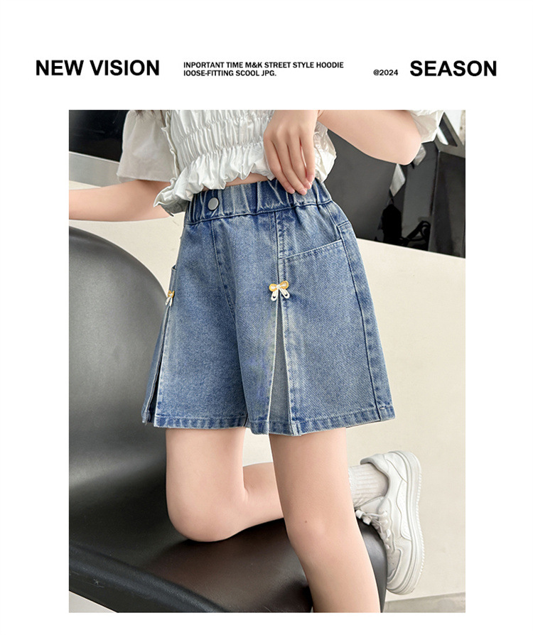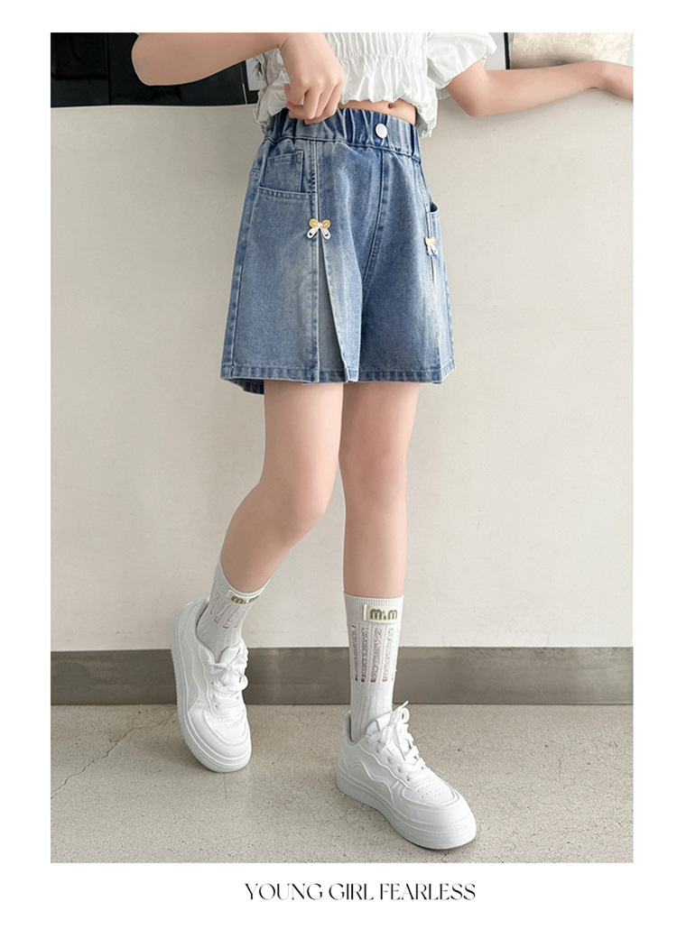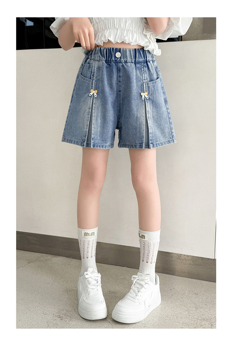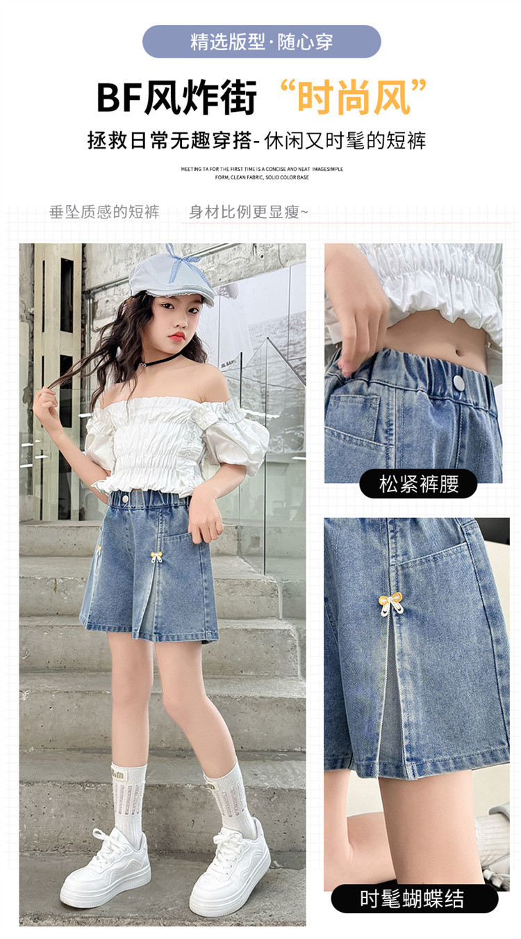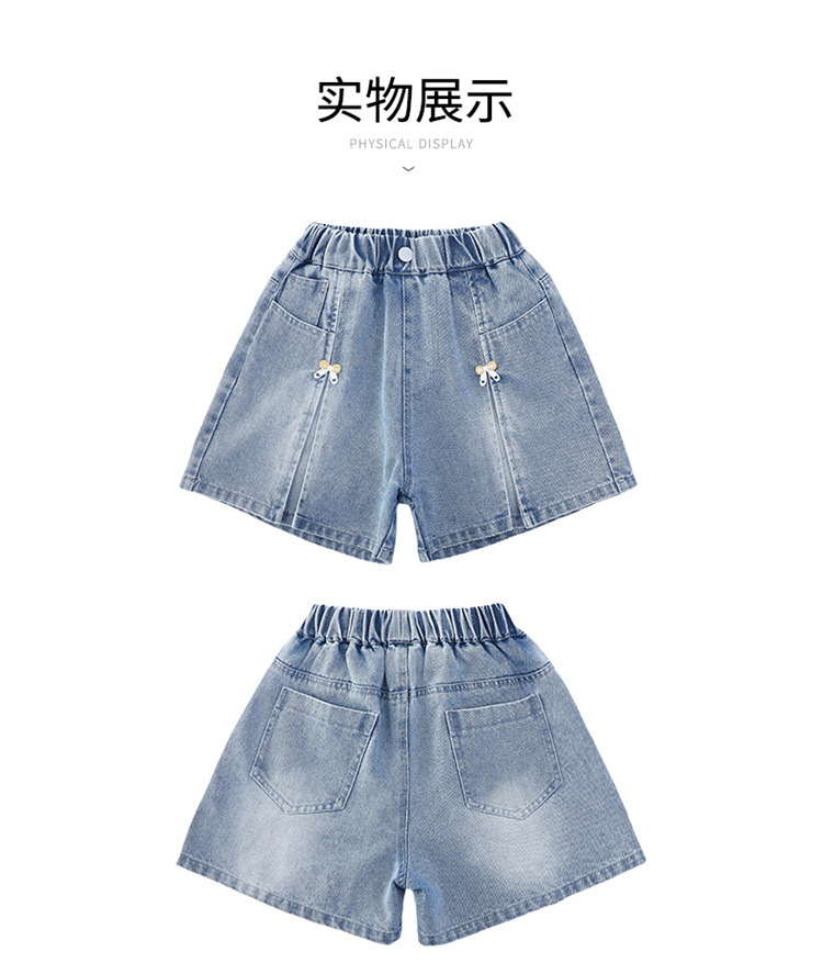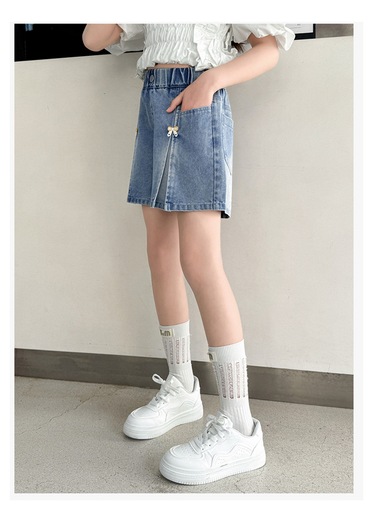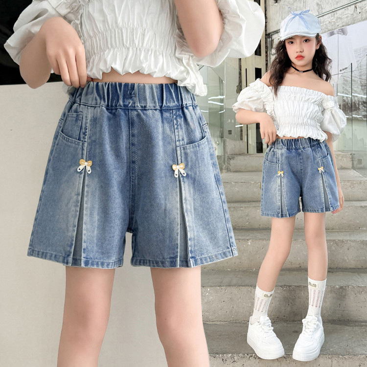 여름 여아 데님 반바지, 여름 옷, 중대형 아동 한국식 리본 핫팬츠, 여름 얇은 치마바지 도매