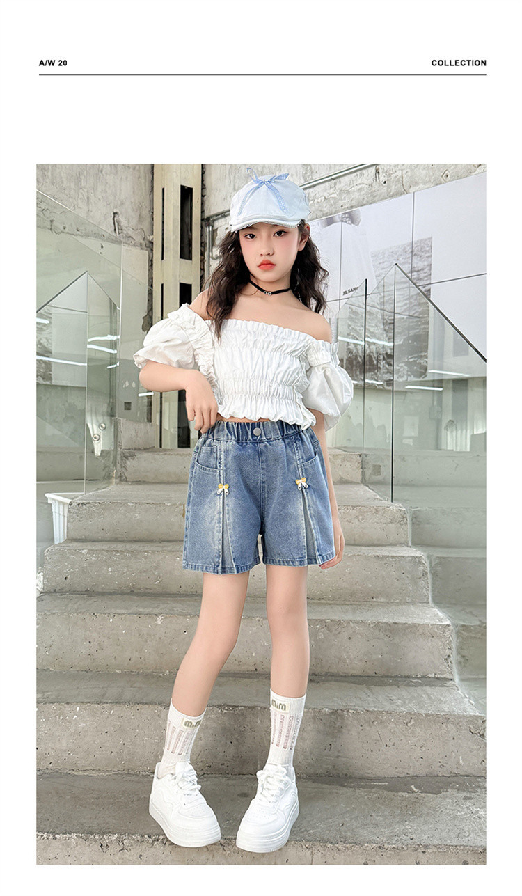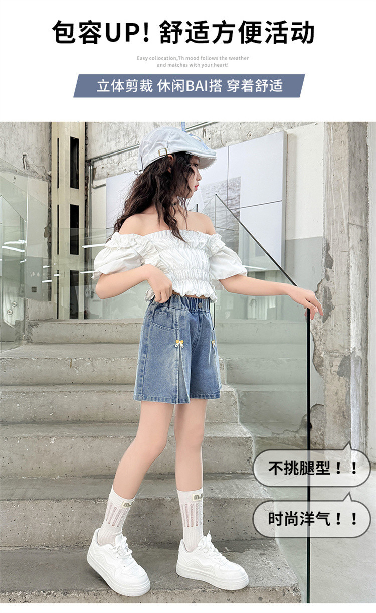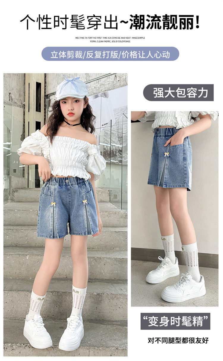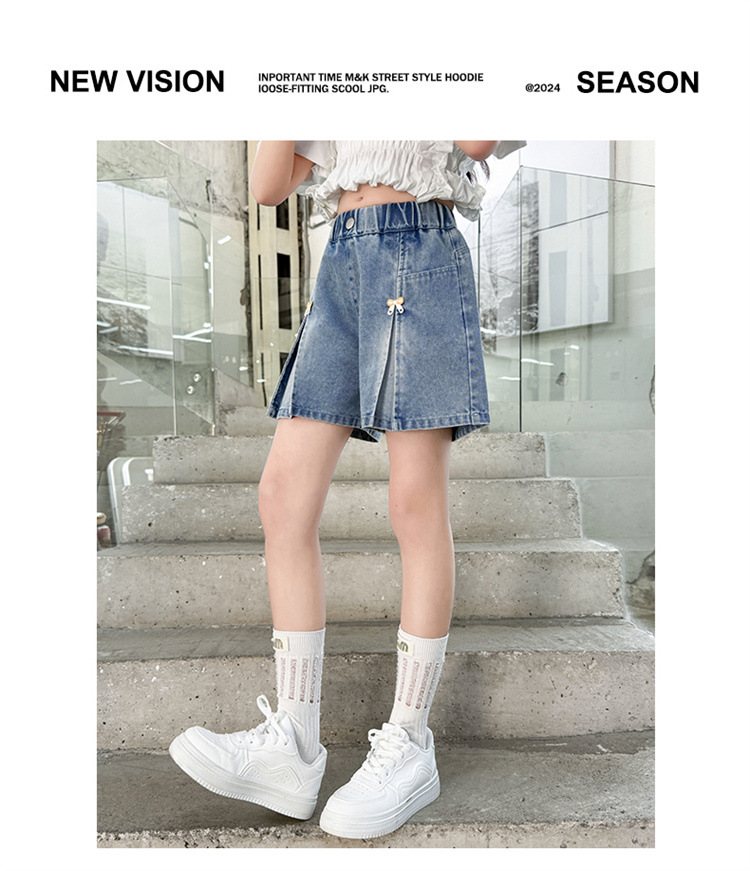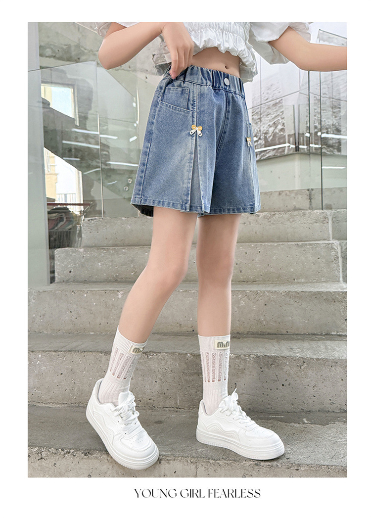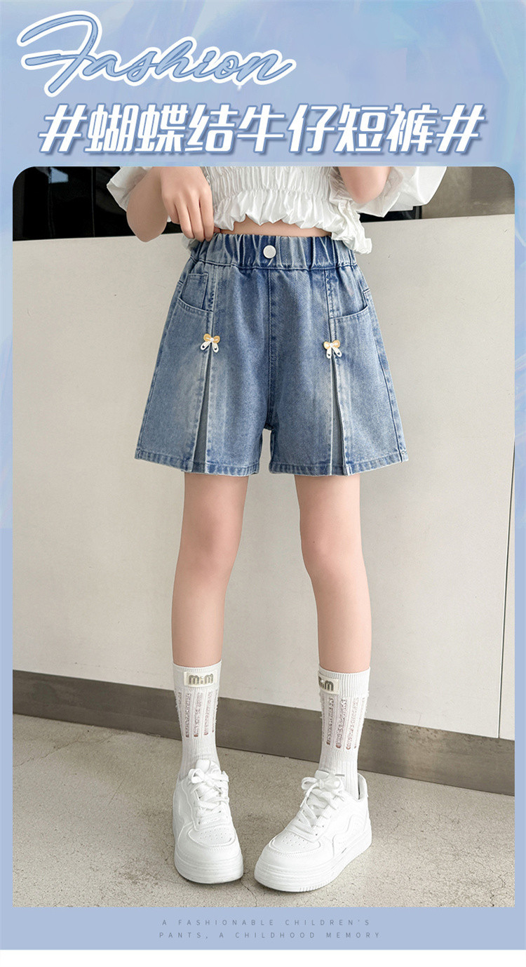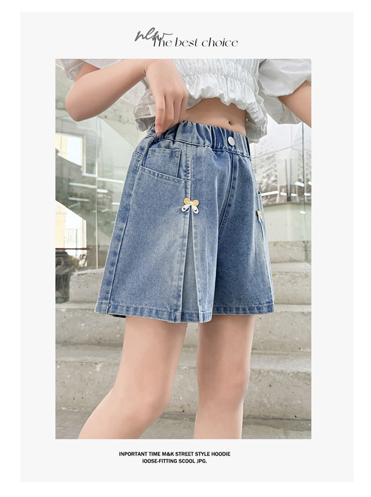 여름 여아 데님 반바지, 여름 옷, 중대형 아동 한국식 리본 핫팬츠, 여름 얇은 치마바지 도매