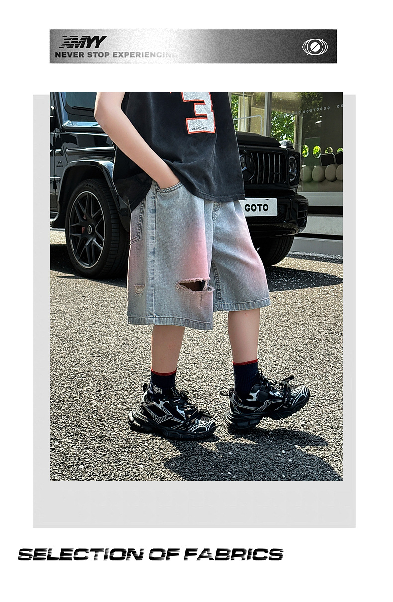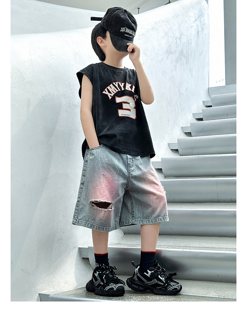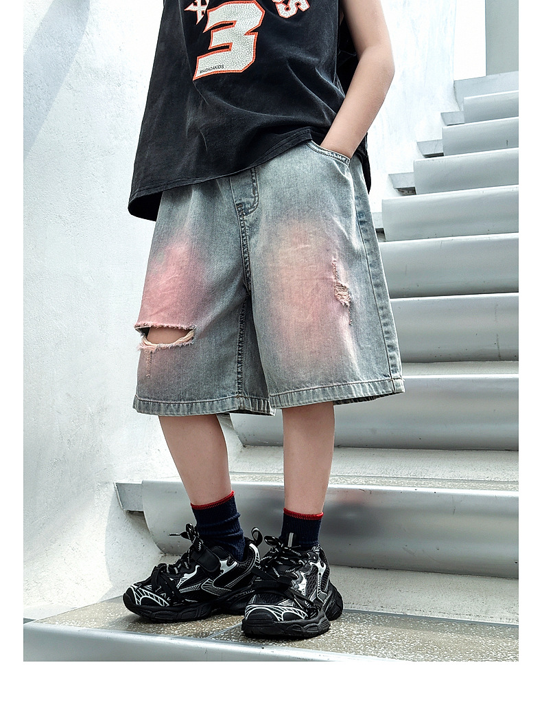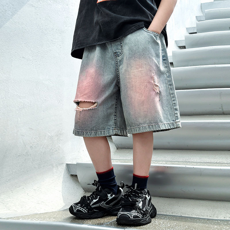 Panda Yuanyuan 여름 어린이 찢어진 데님 반바지 얇은 2025 여름 새 스타일 소년 5부 바지 여름 착용
