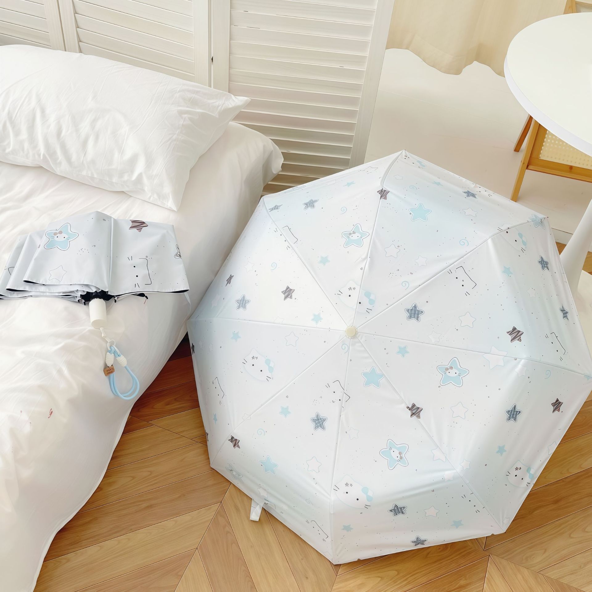 • 파란색 끈 + 바다 소금 별 헬로 키티 수동 파라솔 - 두꺼워짐
