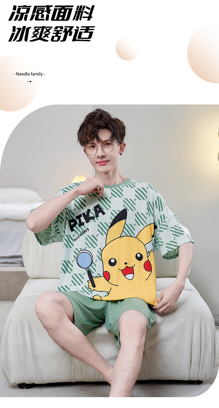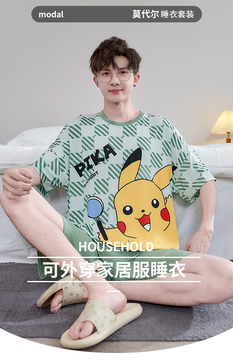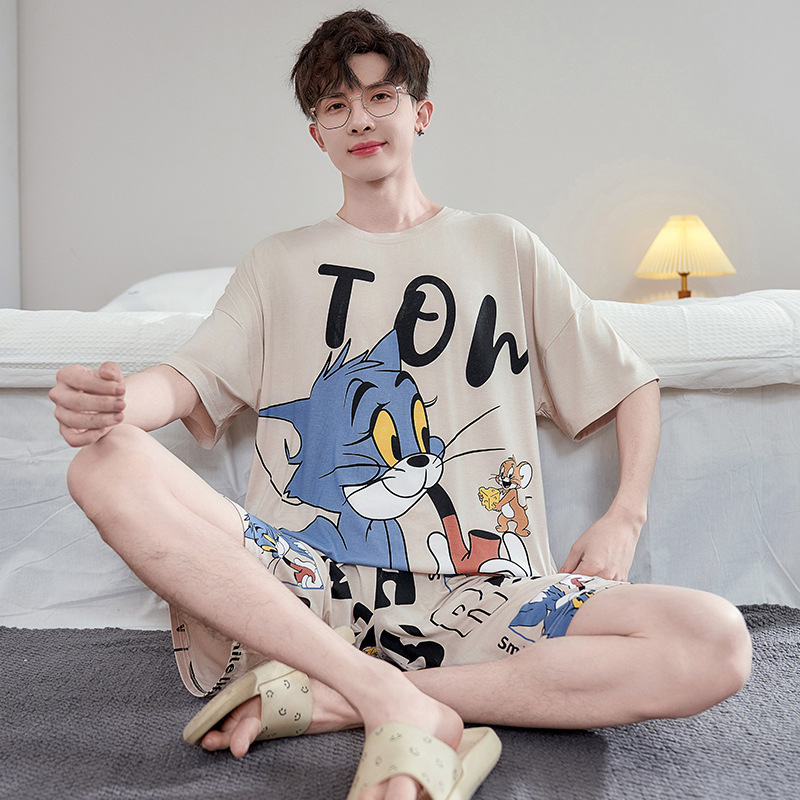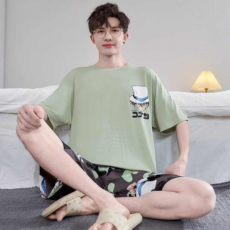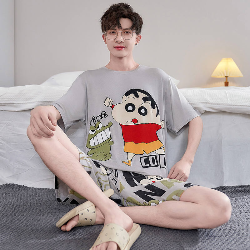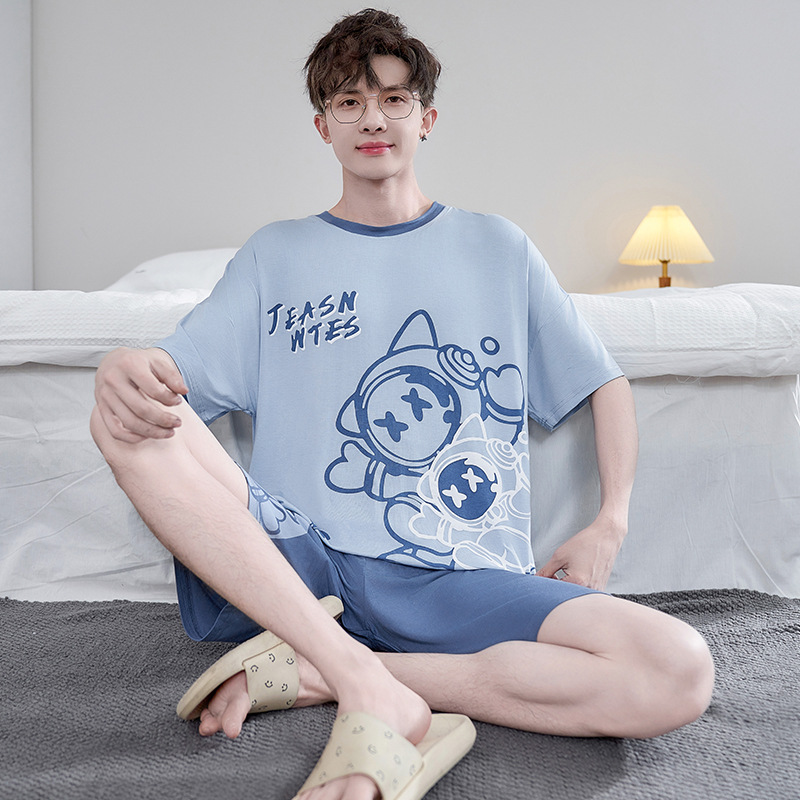여름 모달 시원한 남성용 반팔 반바지 잠옷, 루즈하고 큰 청소년 만화, 집 밖에서 입을 수 있는 옷스토어 가기