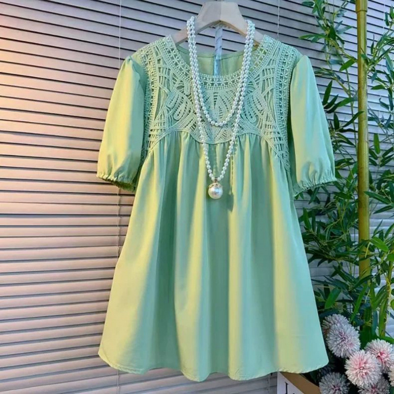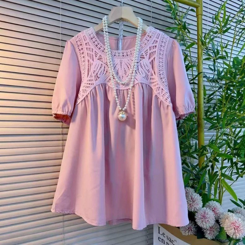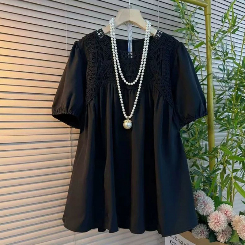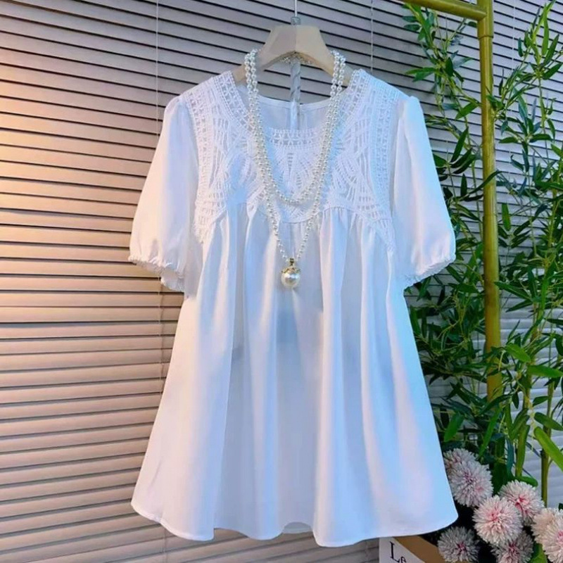 150kg 플러스 사이즈 뚱뚱한 여름 패션 느슨한 라운드 넥 스플 라이스 레이스 프렌치 중간 길이 반소매 쉬폰 셔츠 여성