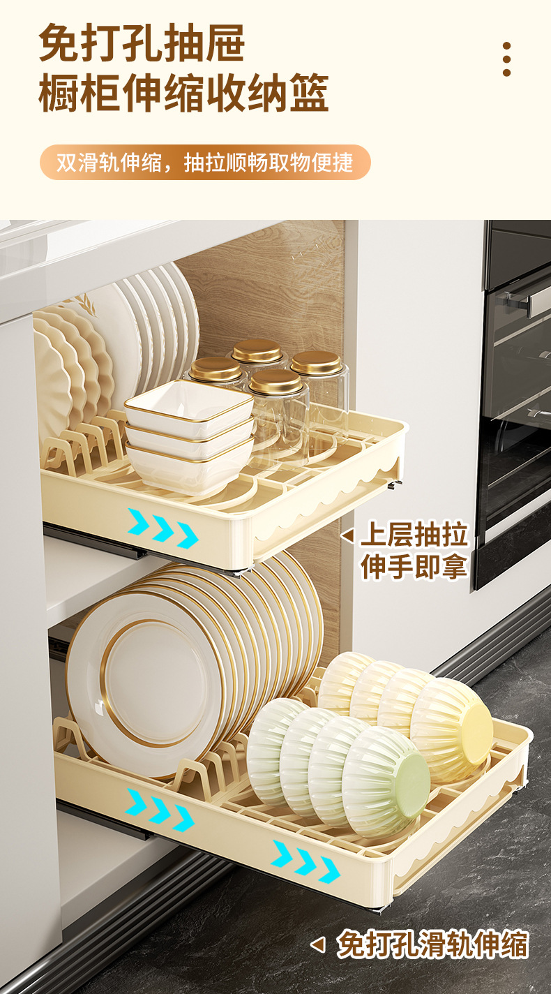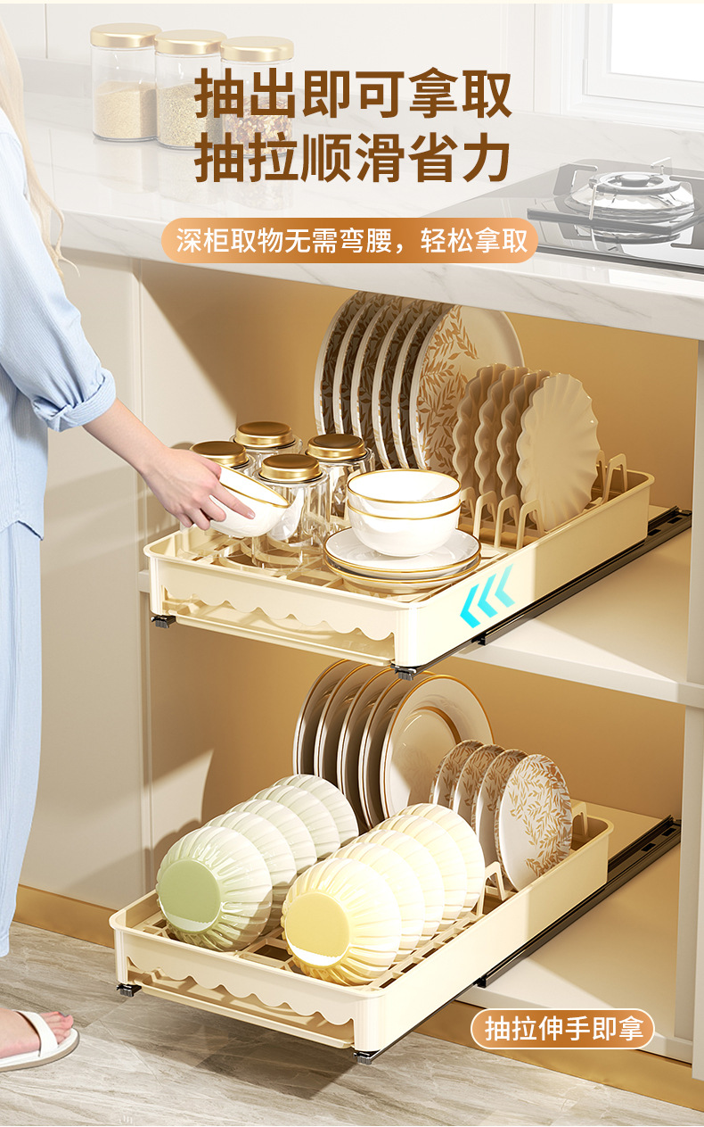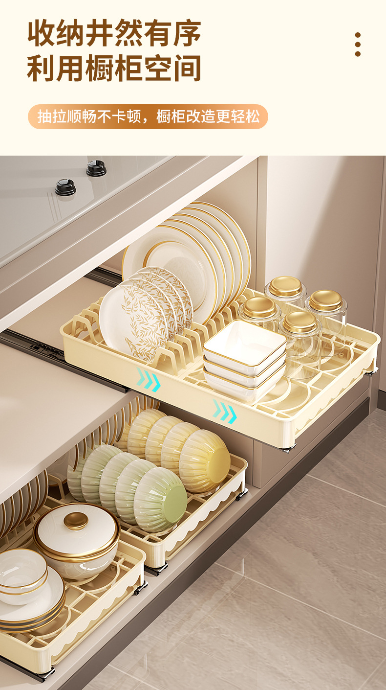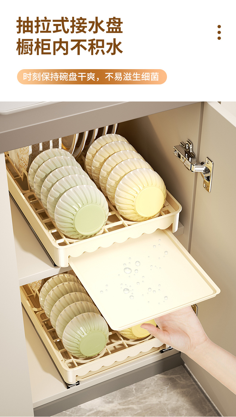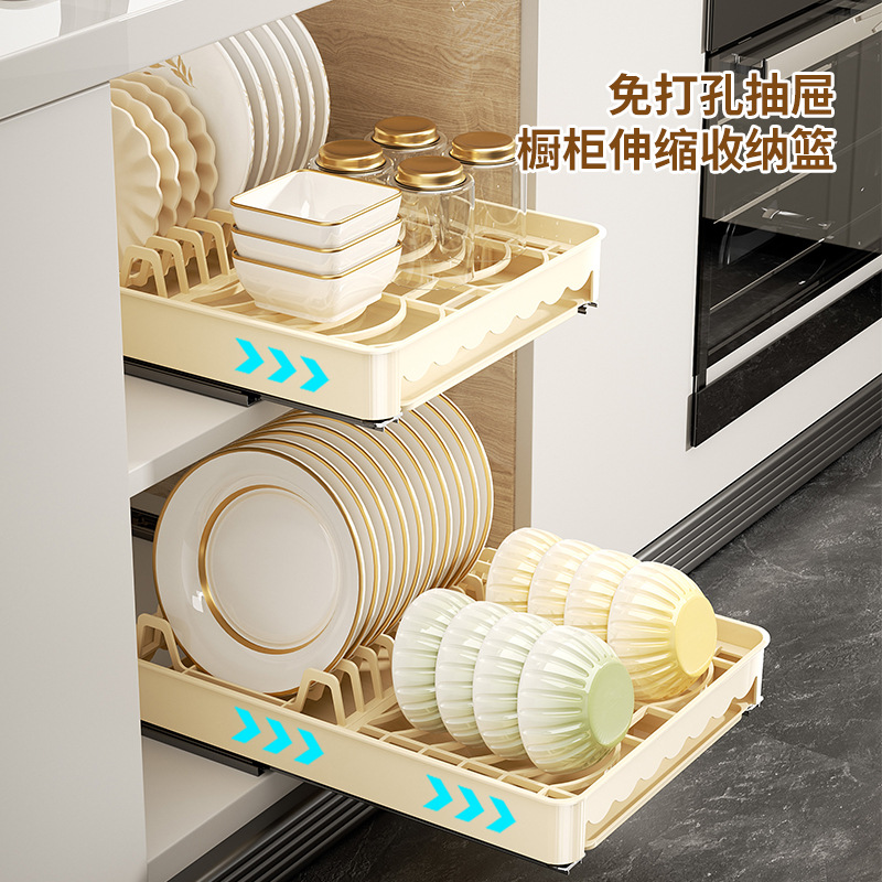 주방 캐비닛 내부에 펀칭 없이 물기를 흘리지 않고 식기류를 보관할 수 있는 풀아웃 수납 선반과 싱크대 아래에 있는 깊은 캐비닛 식기 보관함스토어 가기