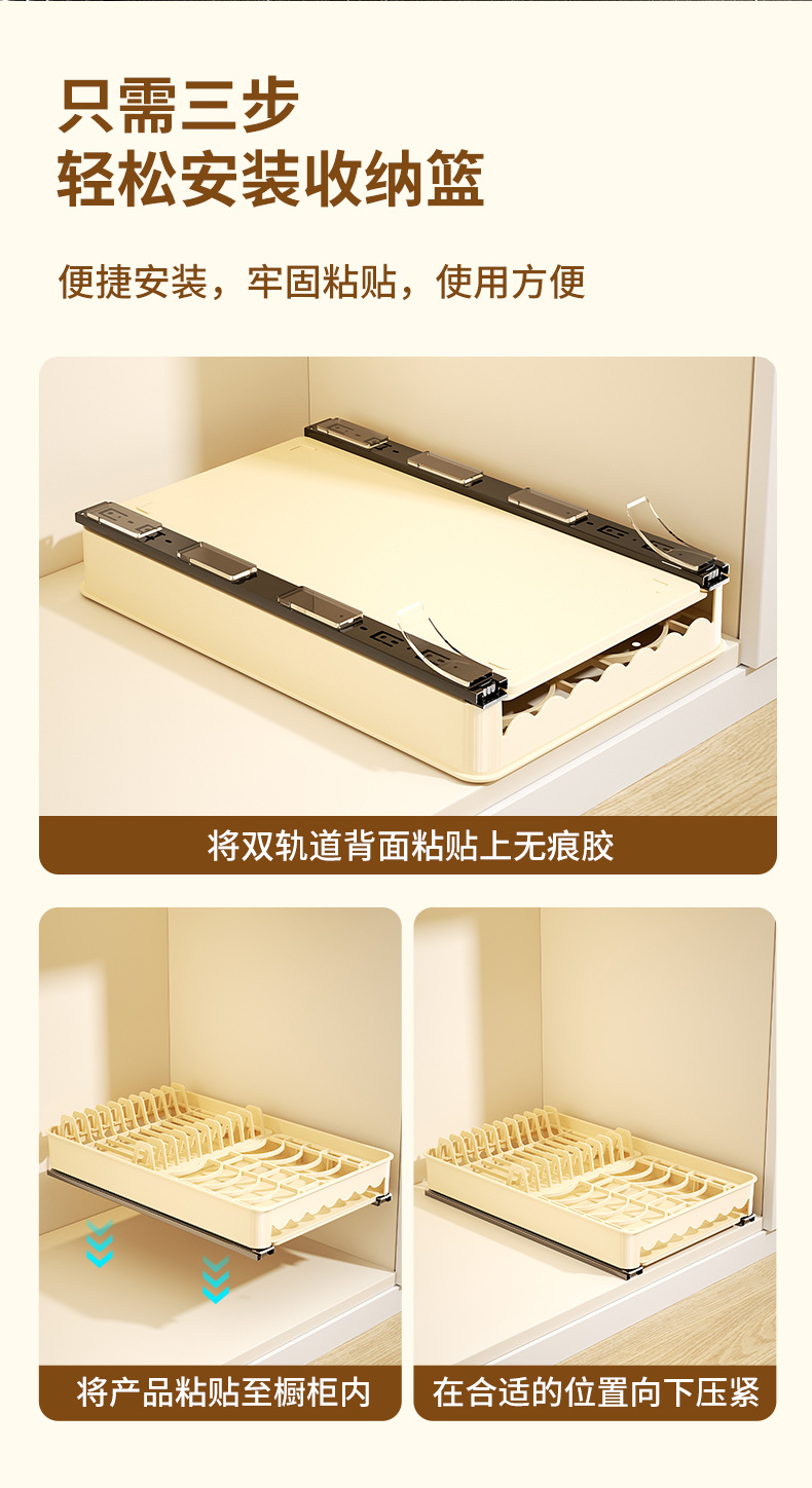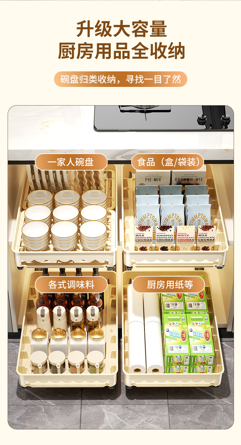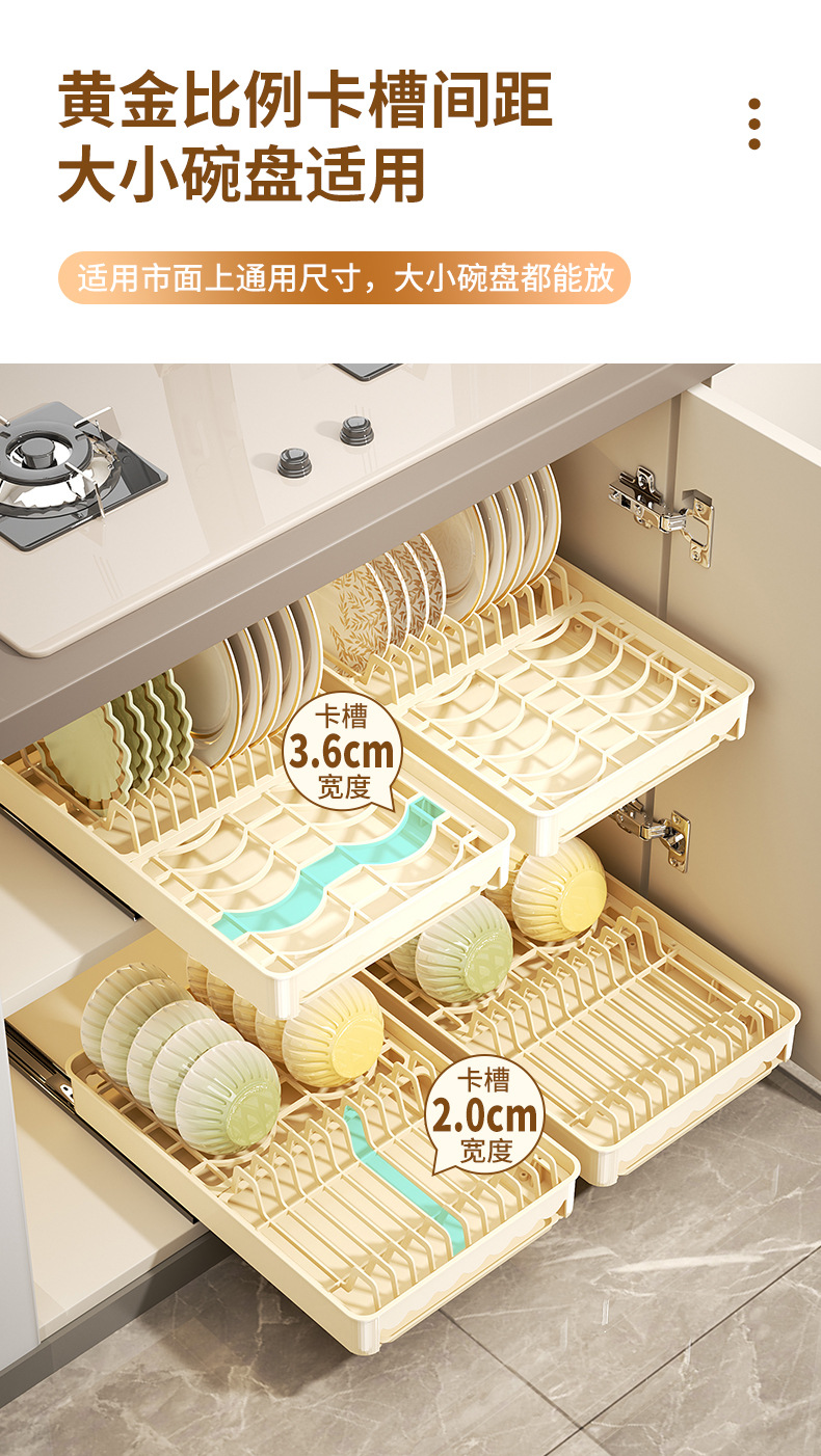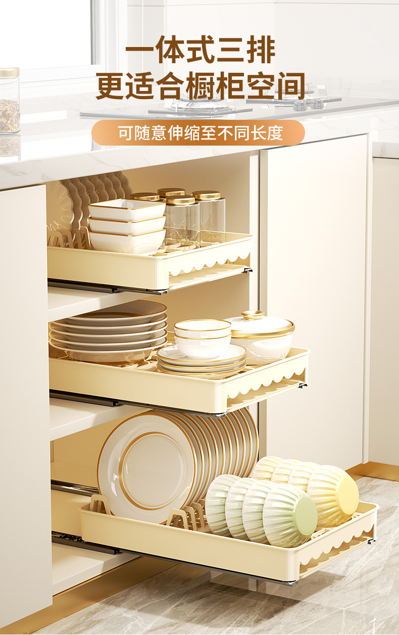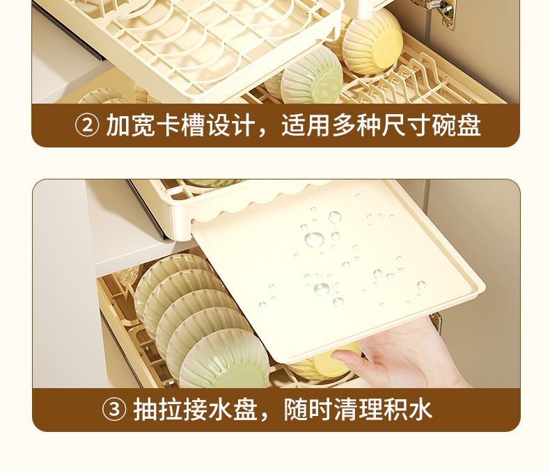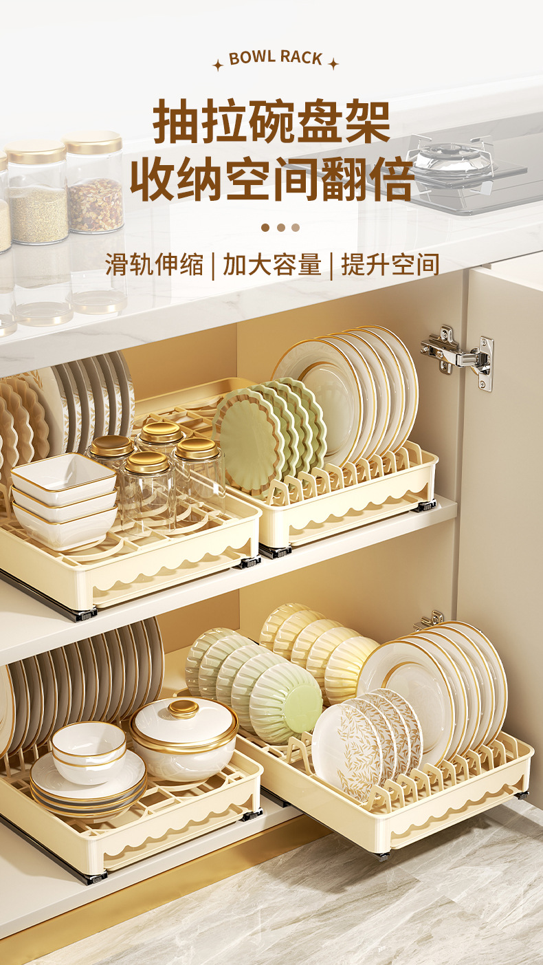 주방 캐비닛 내부에 펀칭 없이 물기를 흘리지 않고 식기류를 보관할 수 있는 풀아웃 수납 선반과 싱크대 아래에 있는 깊은 캐비닛 식기 보관함스토어 가기
