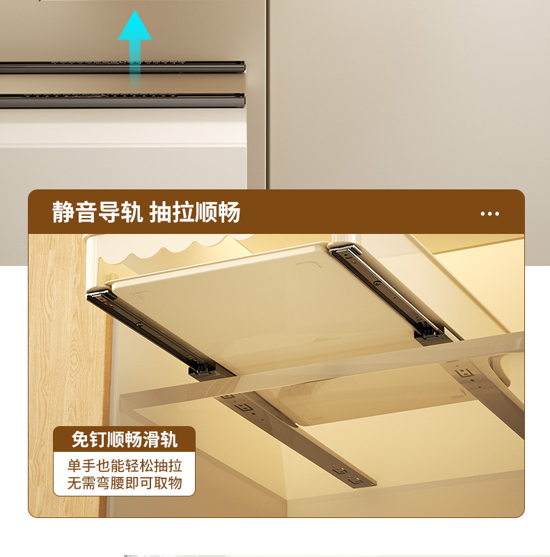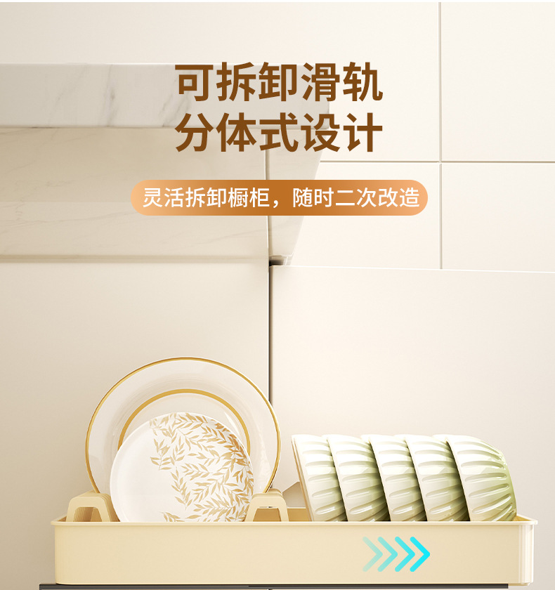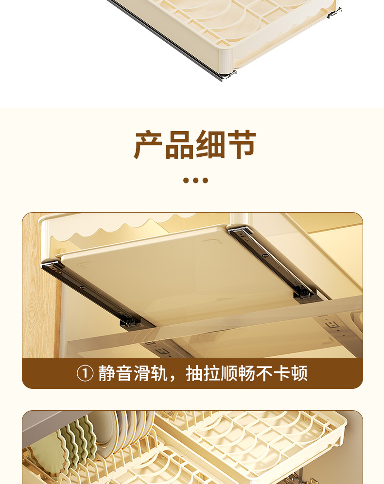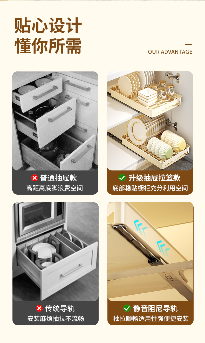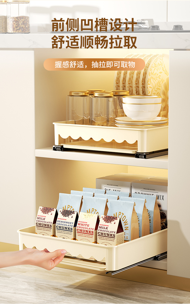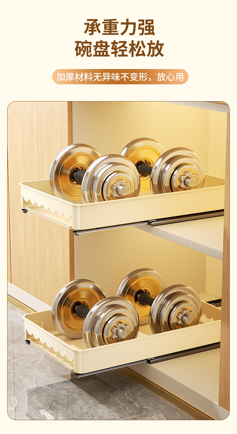 주방 캐비닛 내부에 펀칭 없이 물기를 흘리지 않고 식기류를 보관할 수 있는 풀아웃 수납 선반과 싱크대 아래에 있는 깊은 캐비닛 식기 보관함스토어 가기