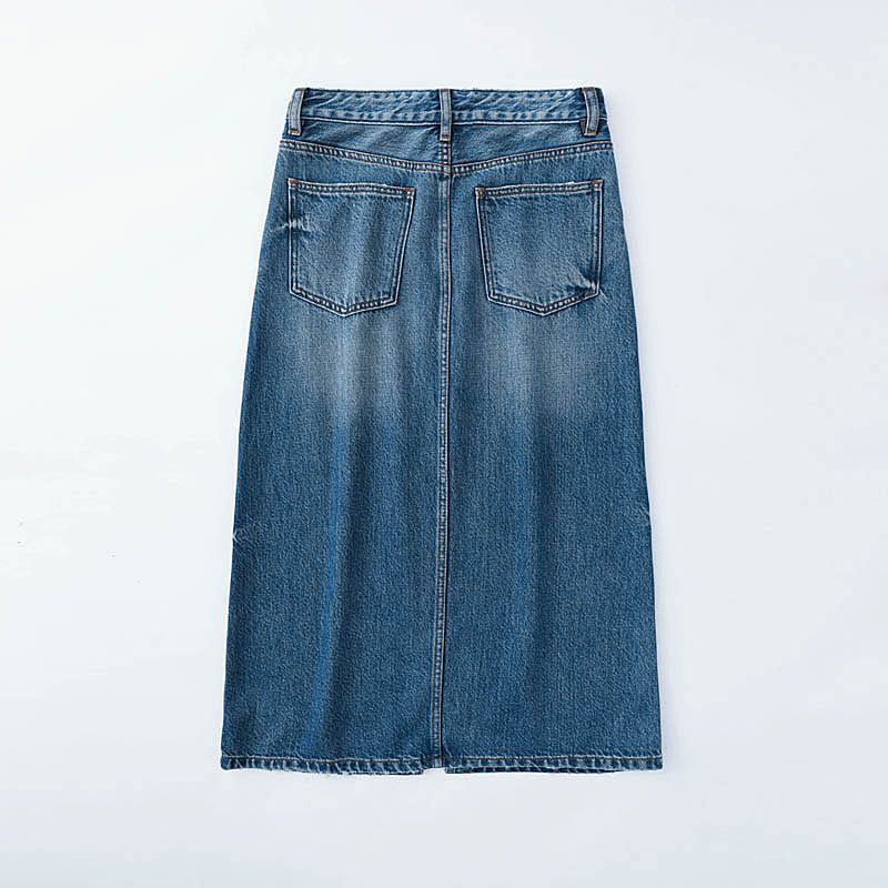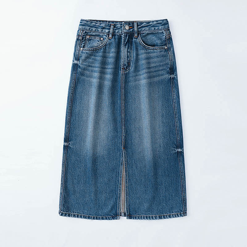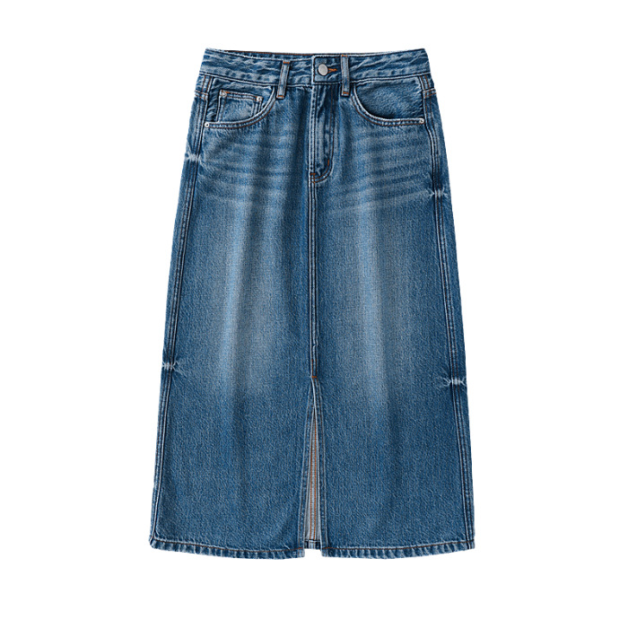 Kumeipai 2025 봄 하이 엔드 데님 스커트 여성 슬림 다용도 스커트 퓨어 코튼 프론트 슬릿 워시 미디 스커트