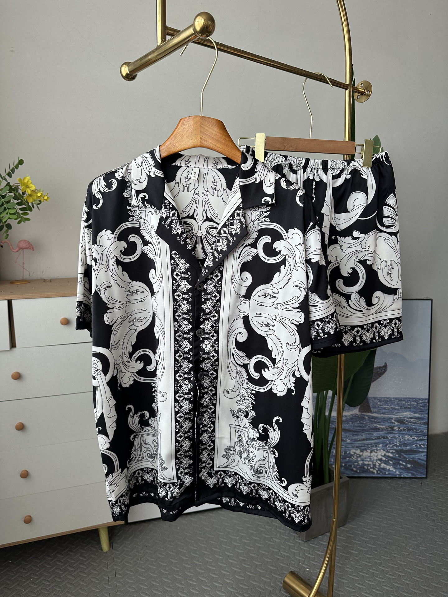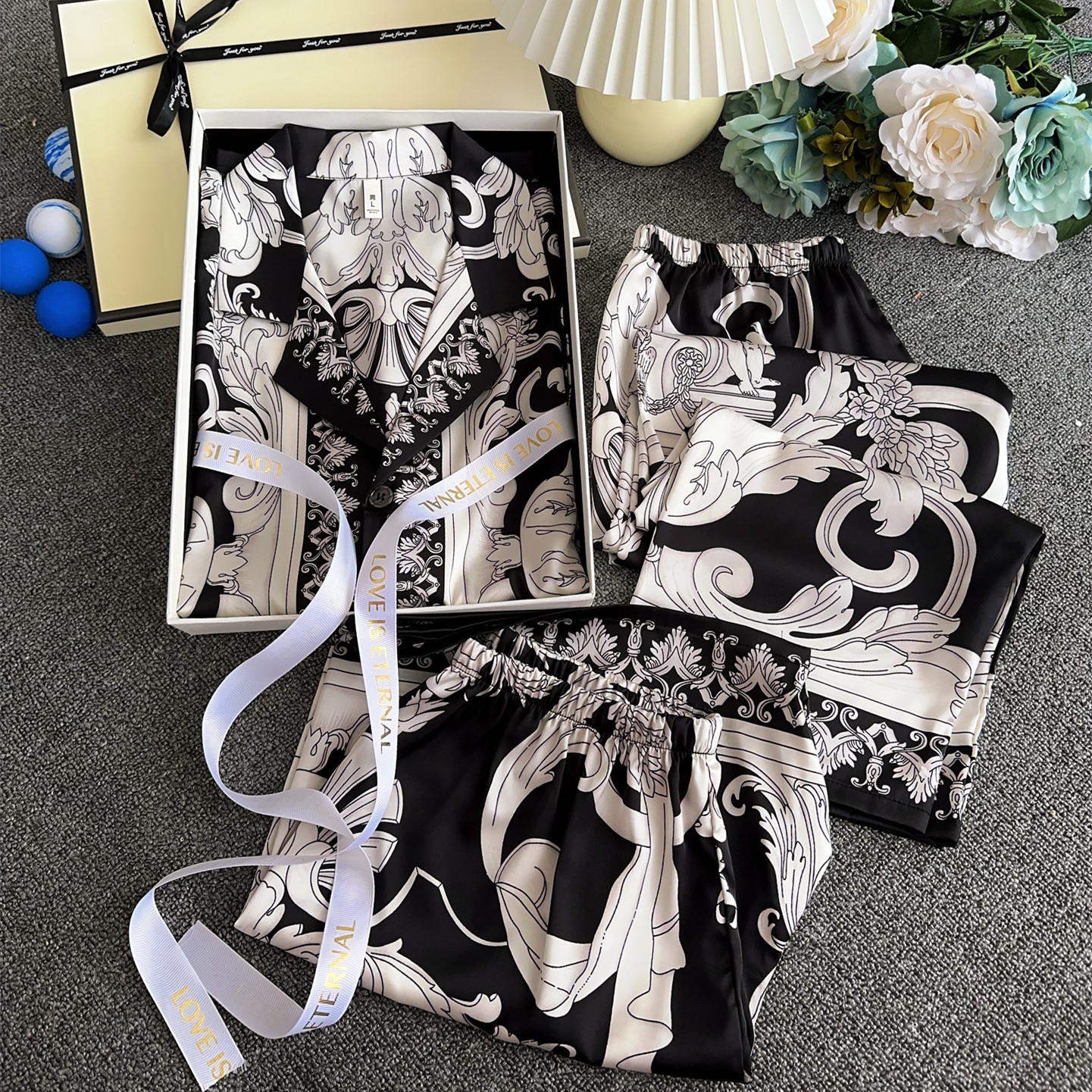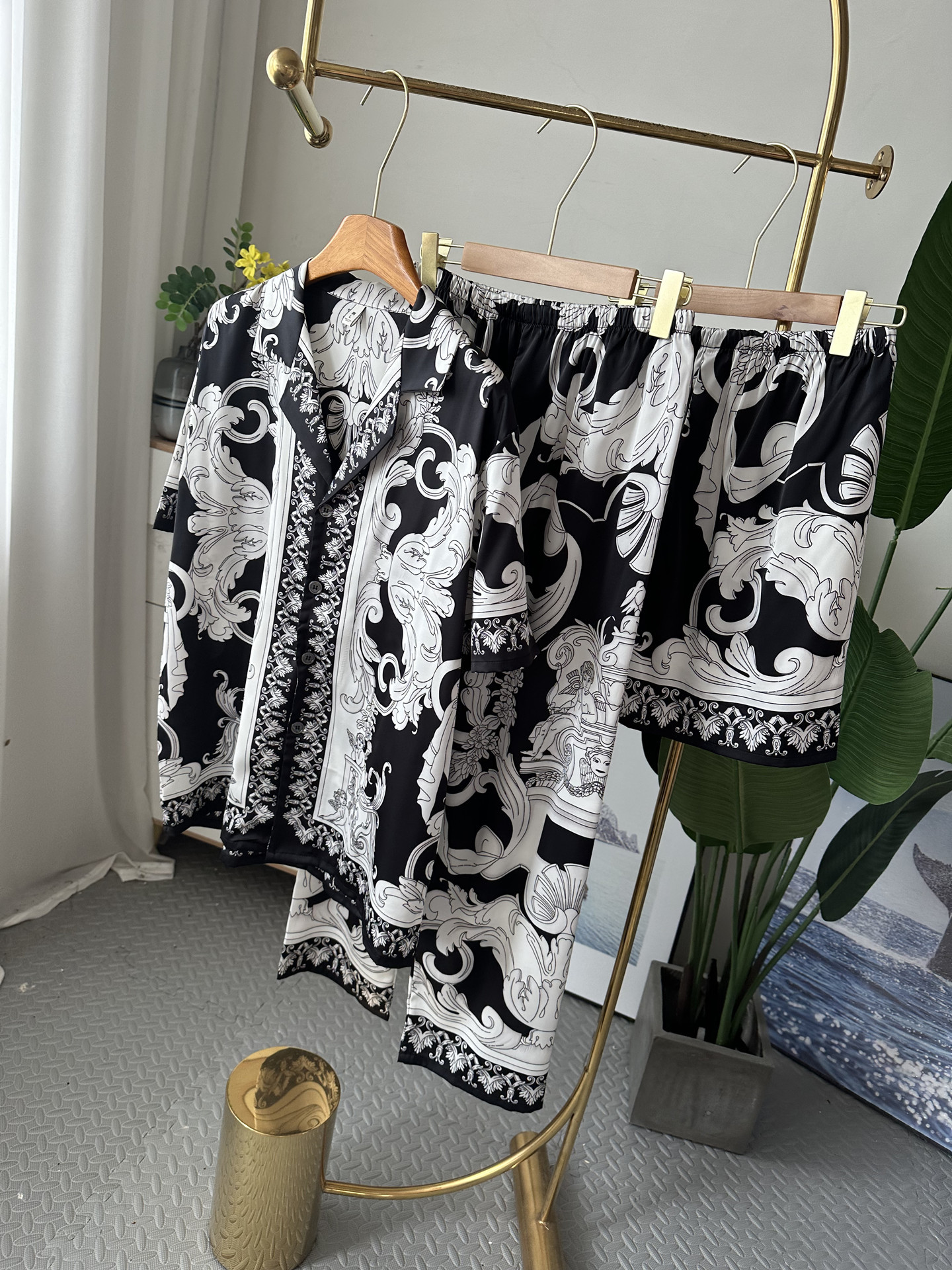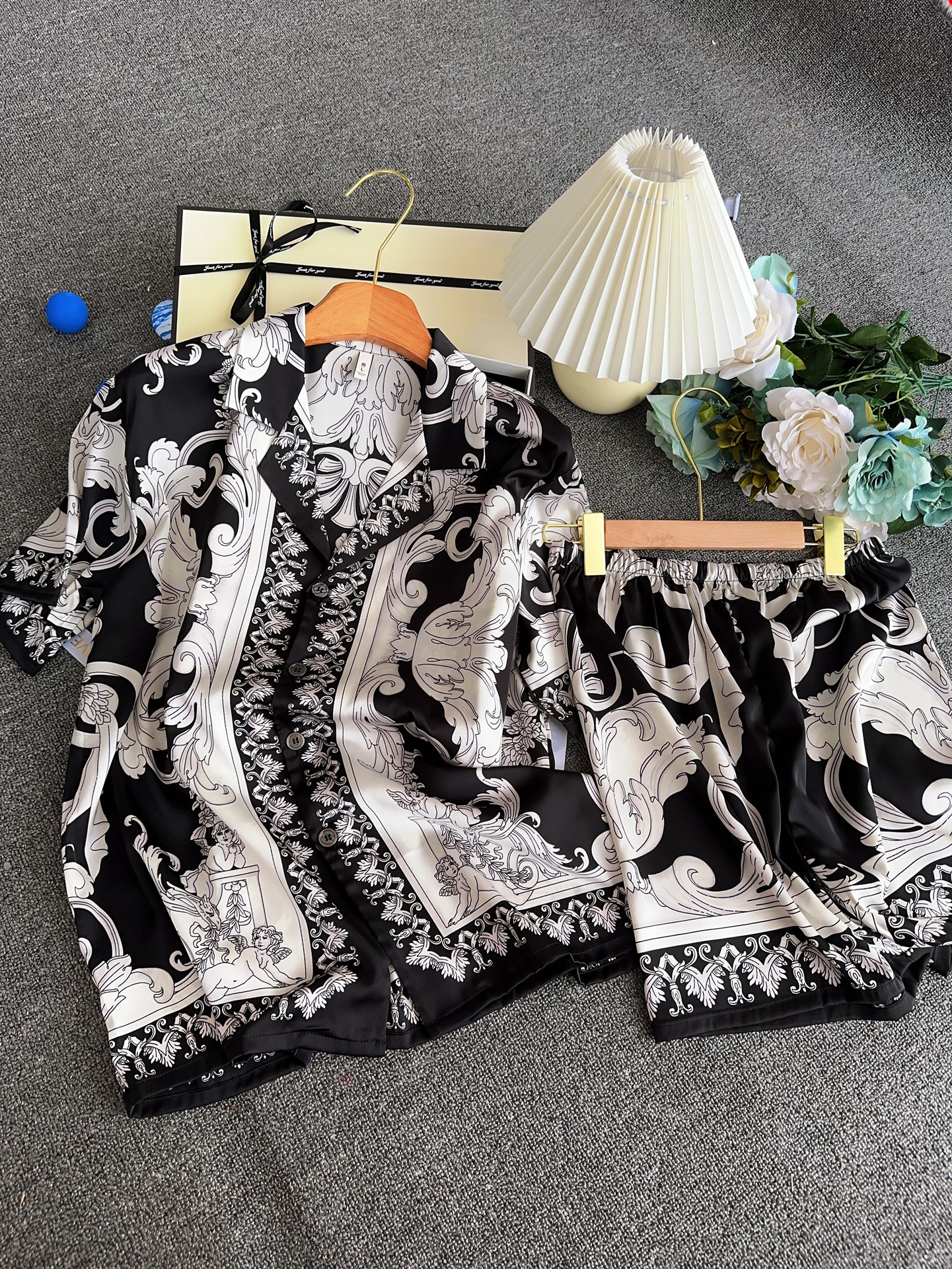 유럽과 미국 스타일의 복고풍 남성용 얼음 실크 잠옷 반팔 3피스 세련된 패턴 시뮬레이션 실크 여름 홈웨어 세트