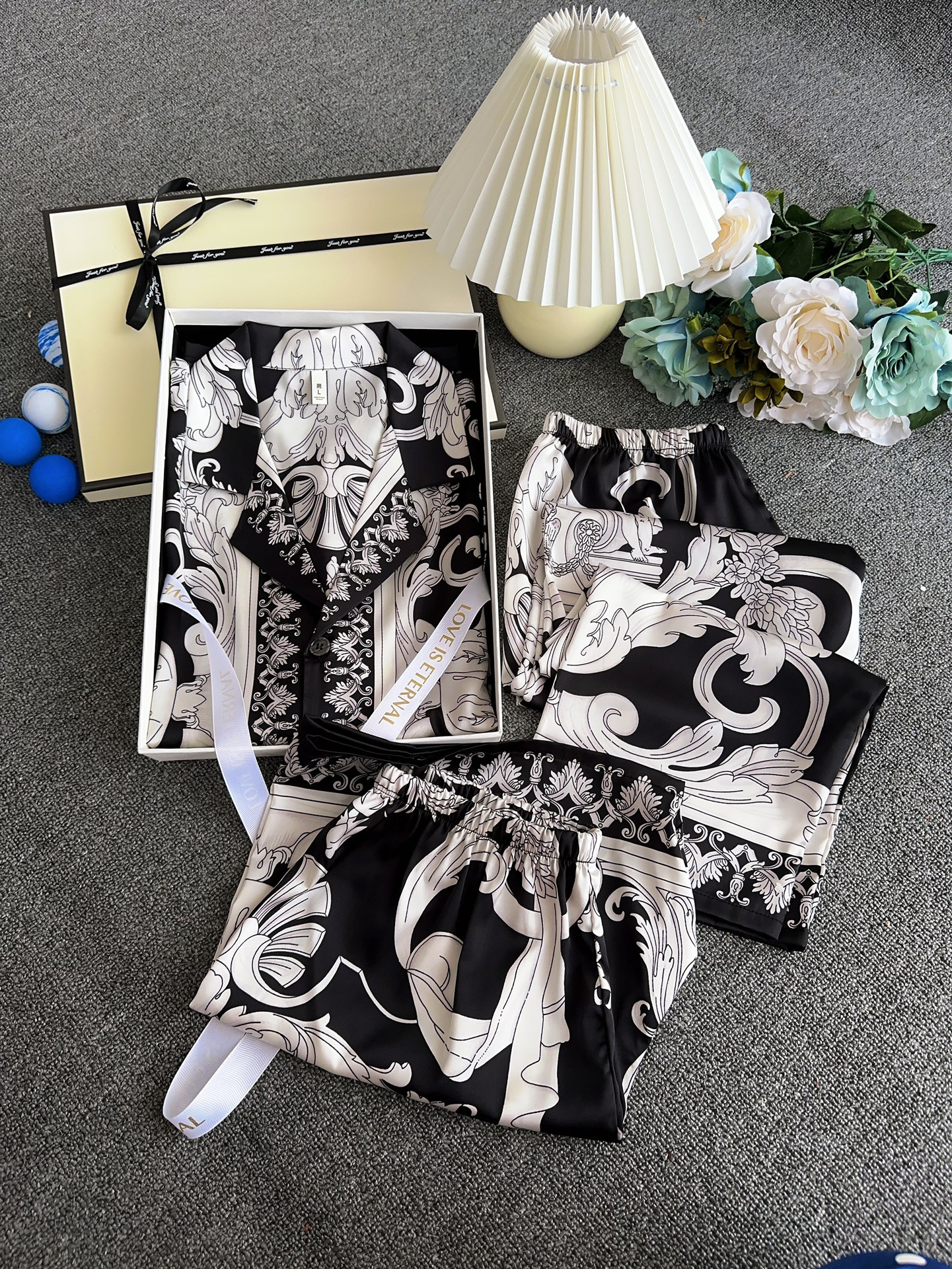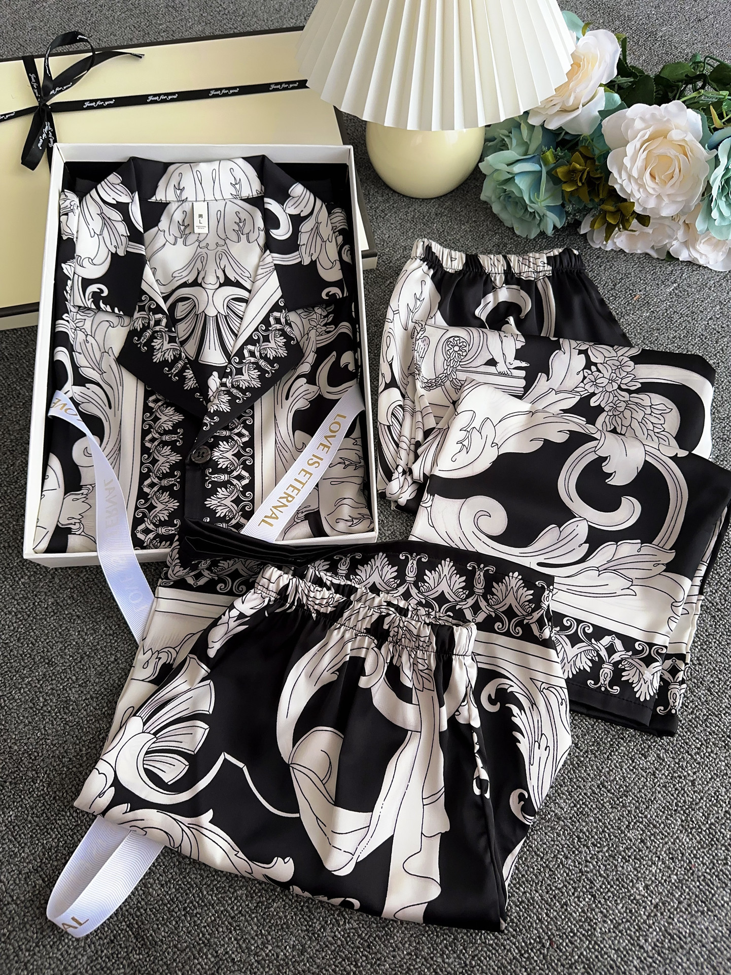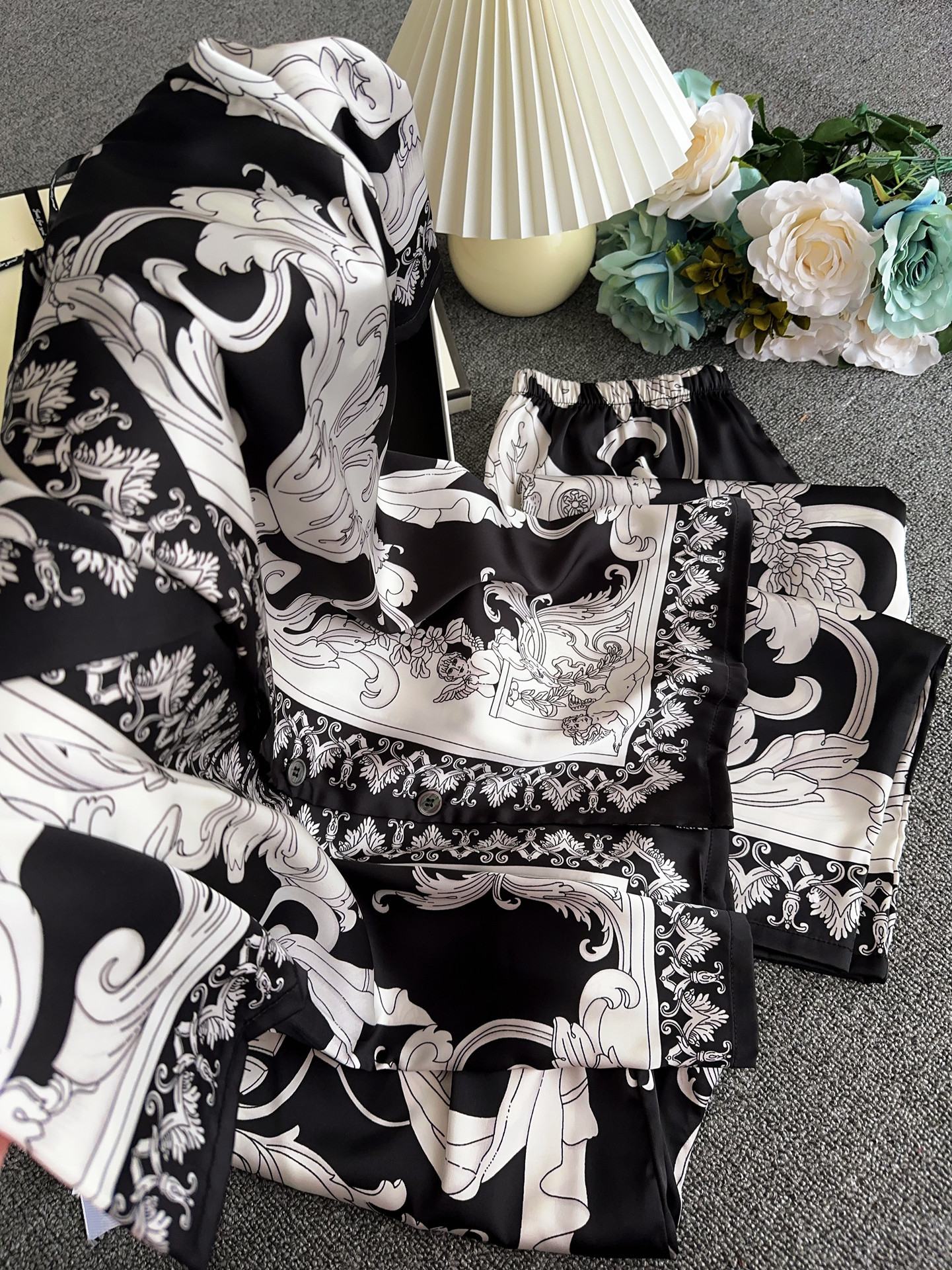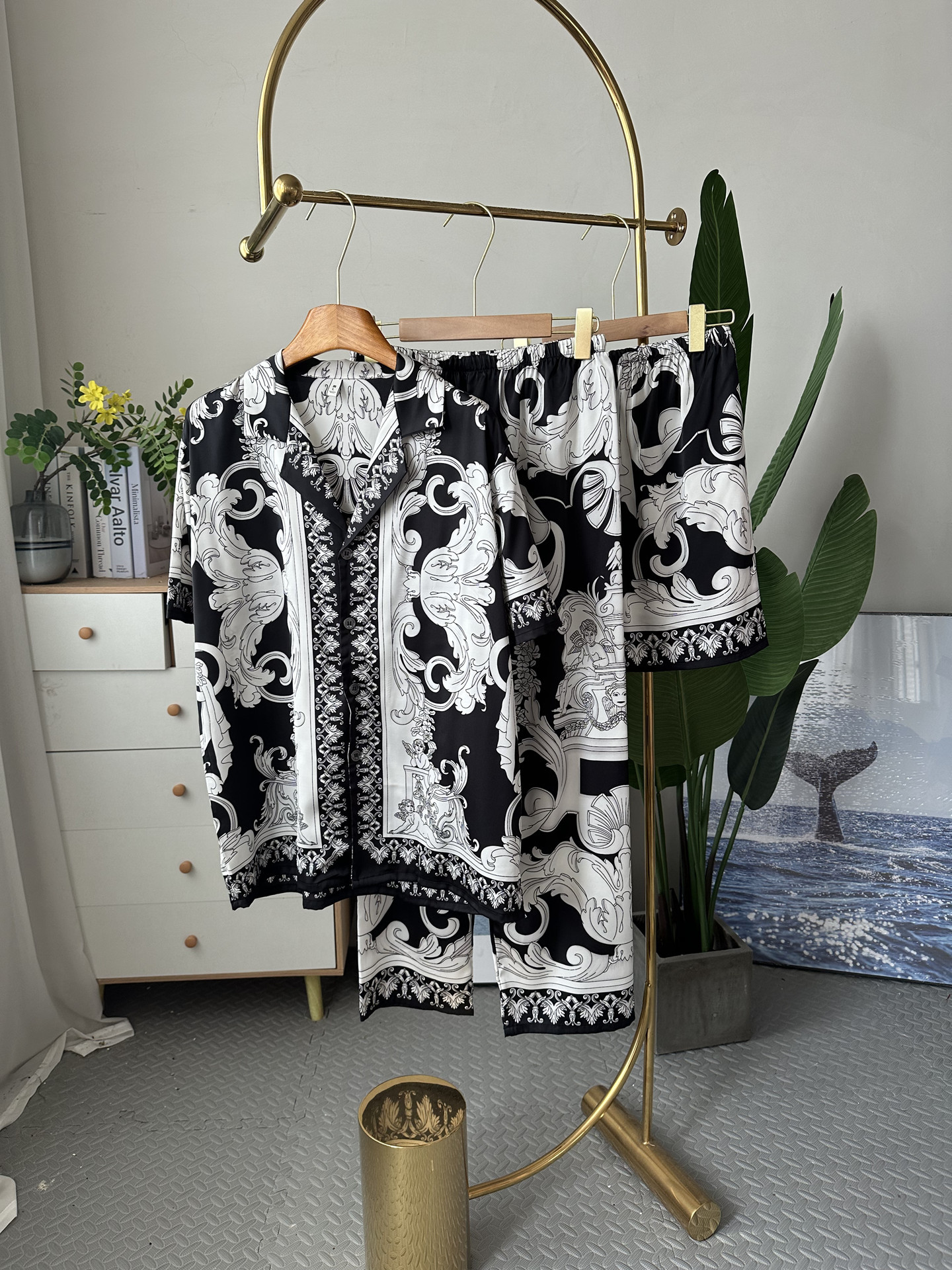 유럽과 미국 스타일의 복고풍 남성용 얼음 실크 잠옷 반팔 3피스 세련된 패턴 시뮬레이션 실크 여름 홈웨어 세트