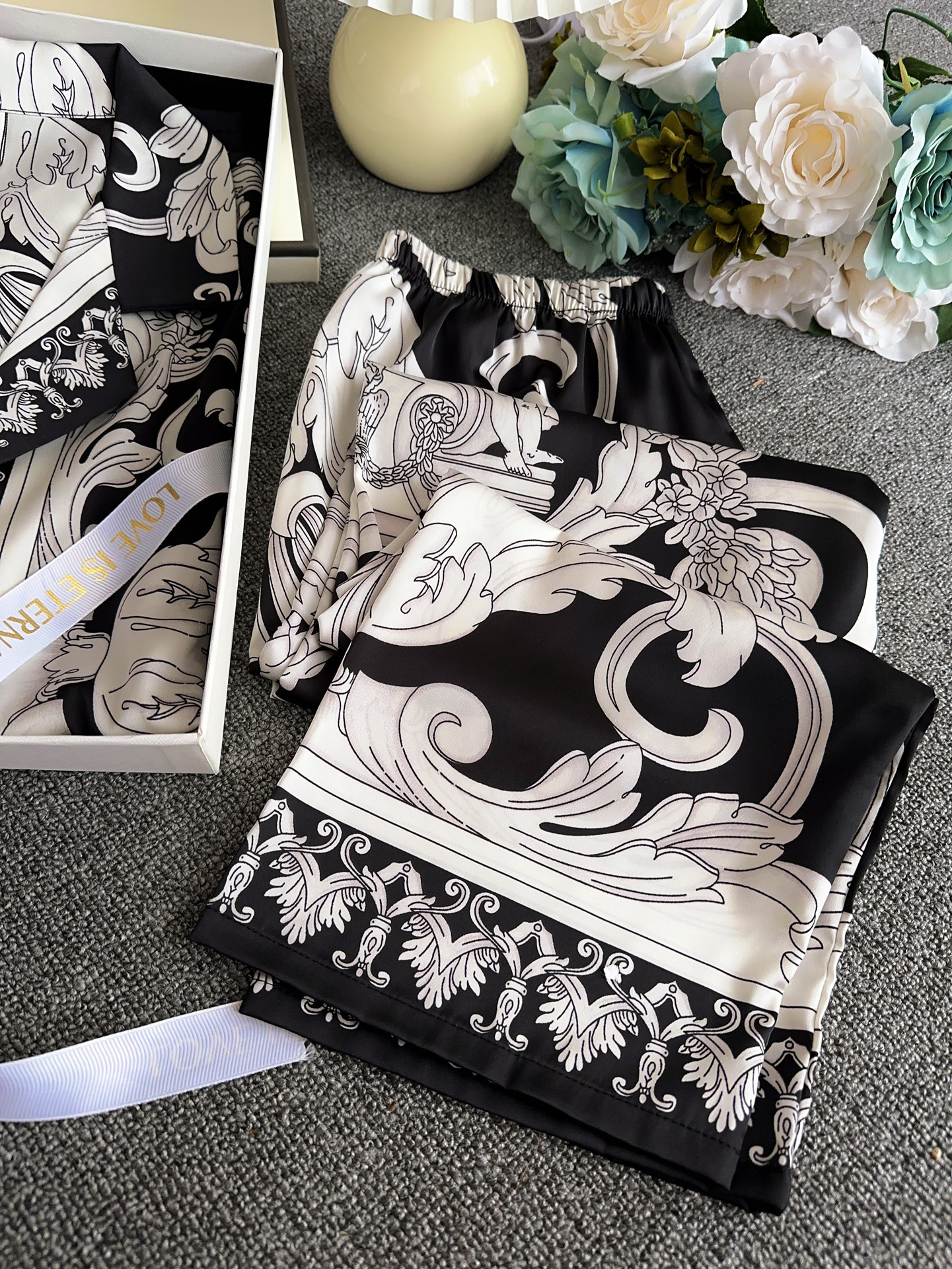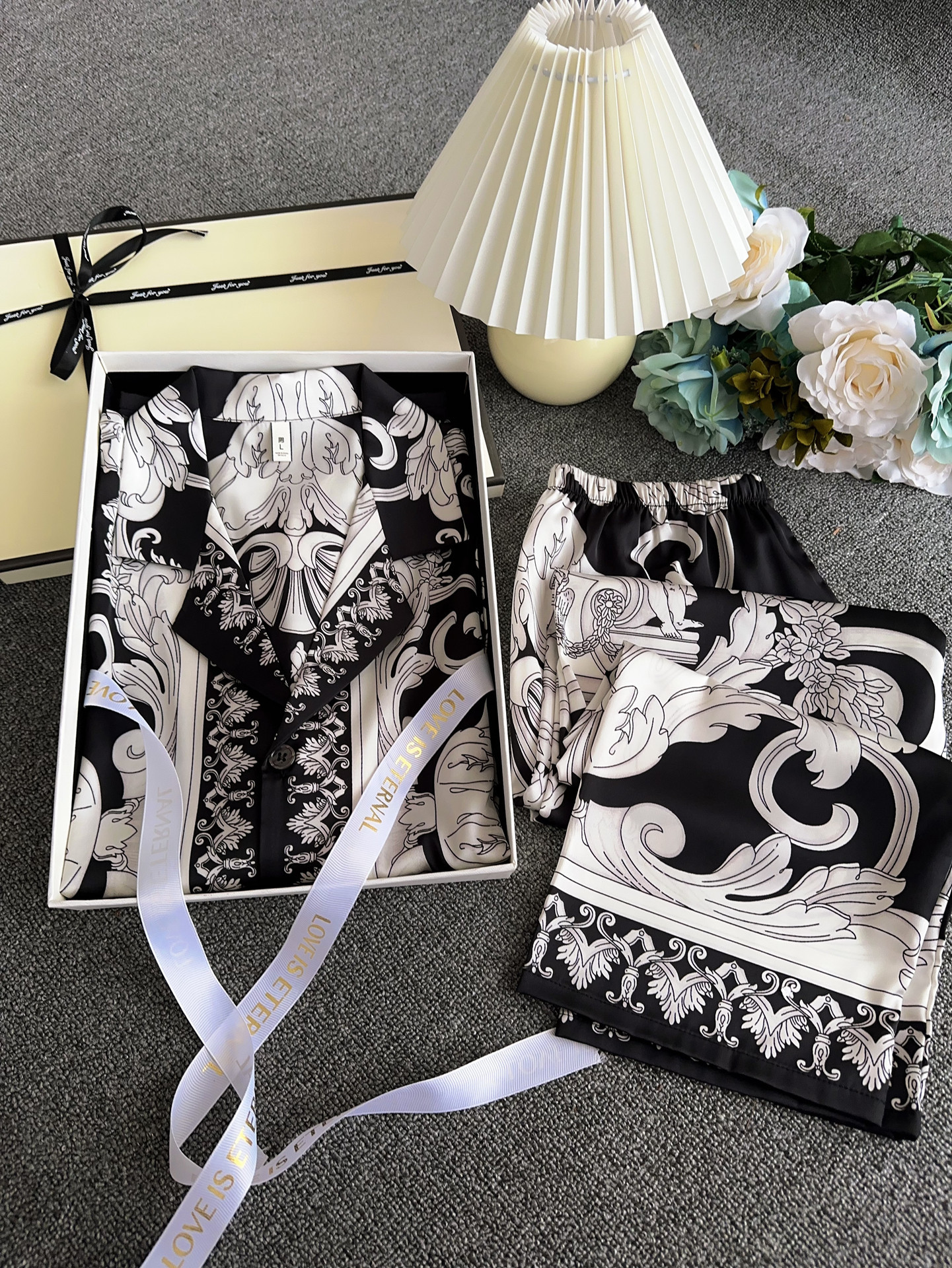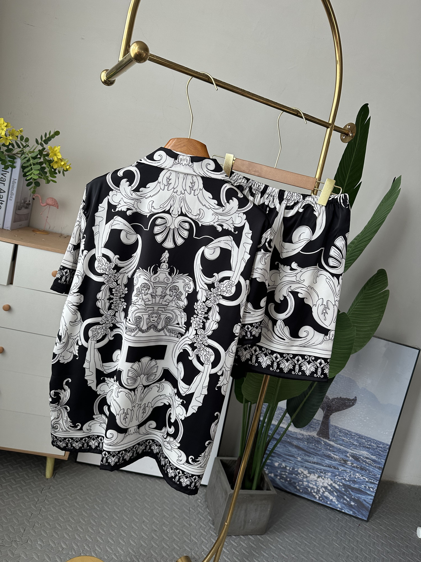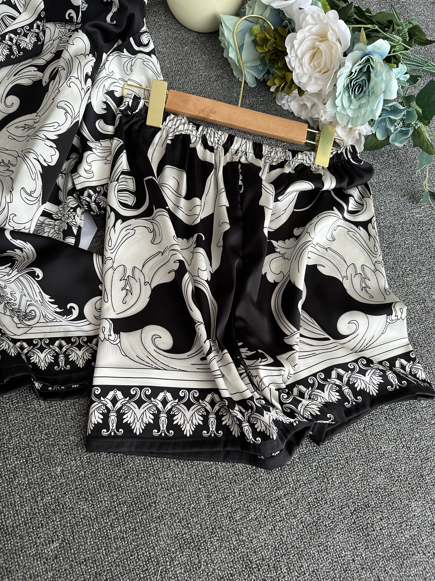 유럽과 미국 스타일의 복고풍 남성용 얼음 실크 잠옷 반팔 3피스 세련된 패턴 시뮬레이션 실크 여름 홈웨어 세트
