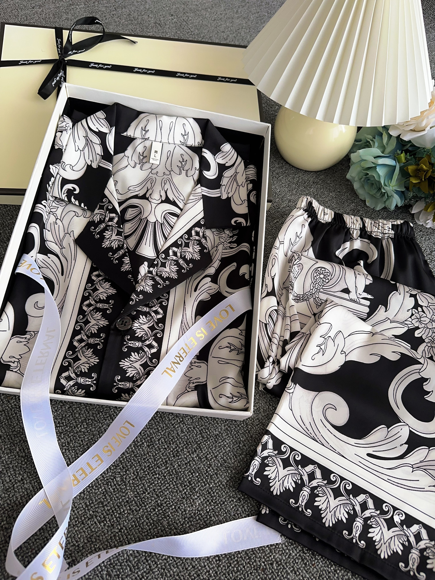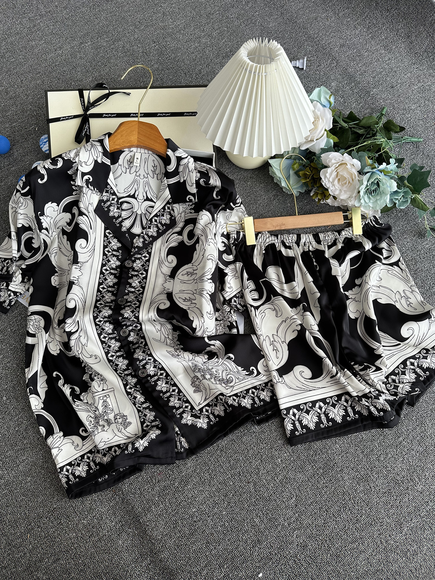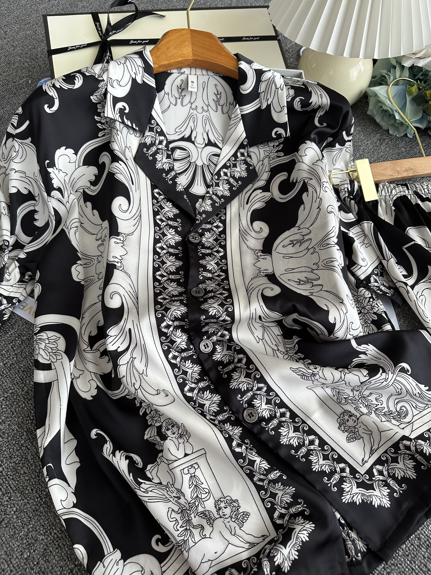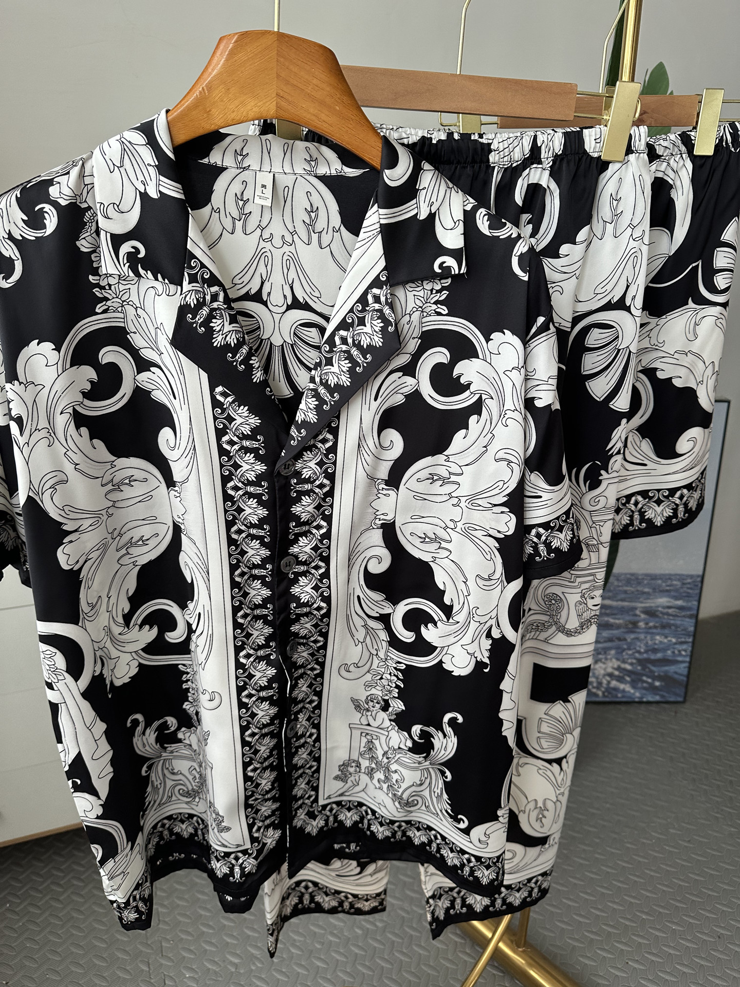유럽과 미국 스타일의 복고풍 남성용 얼음 실크 잠옷 반팔 3피스 세련된 패턴 시뮬레이션 실크 여름 홈웨어 세트스토어 가기