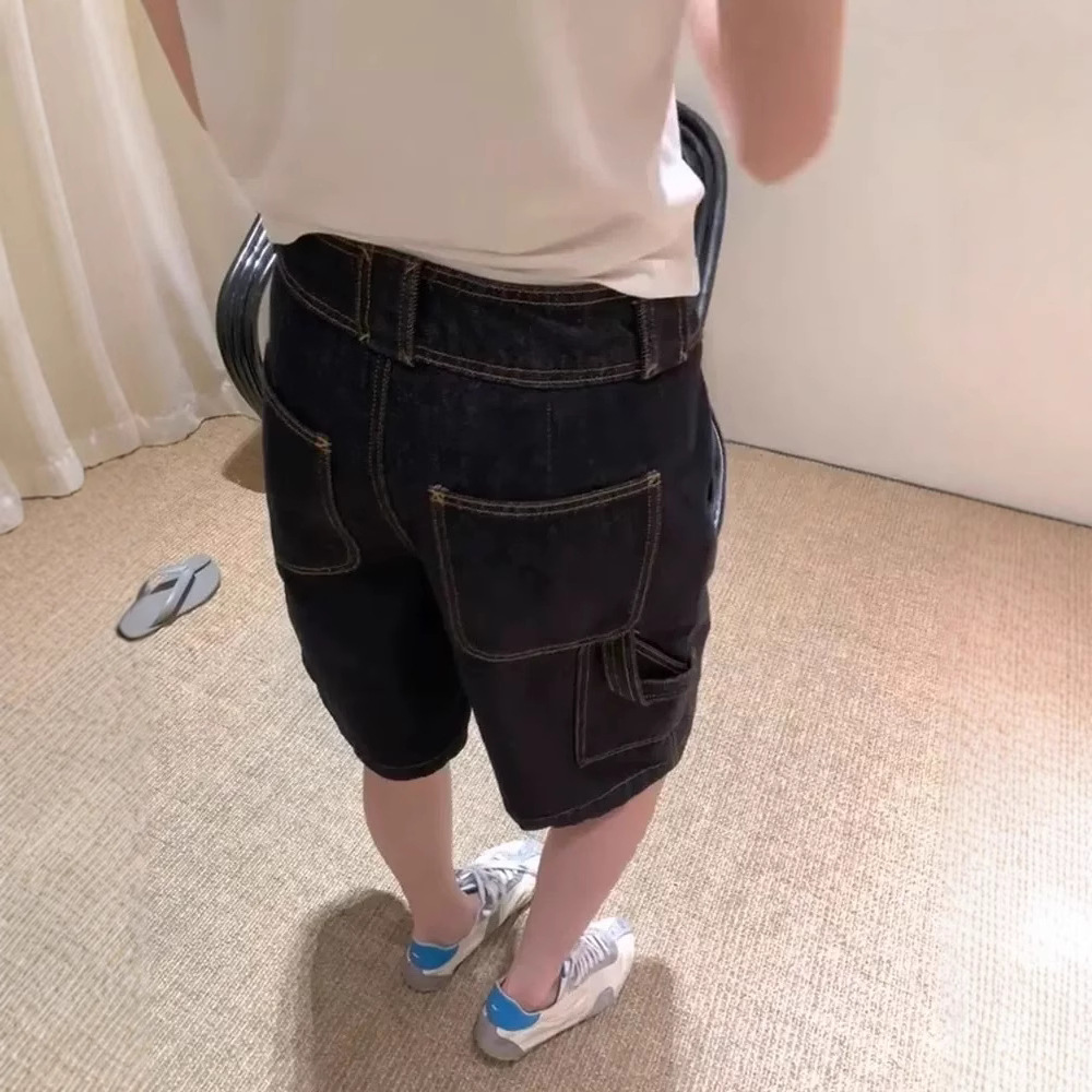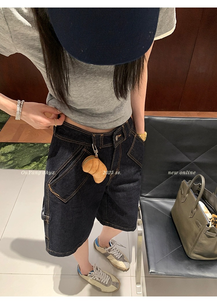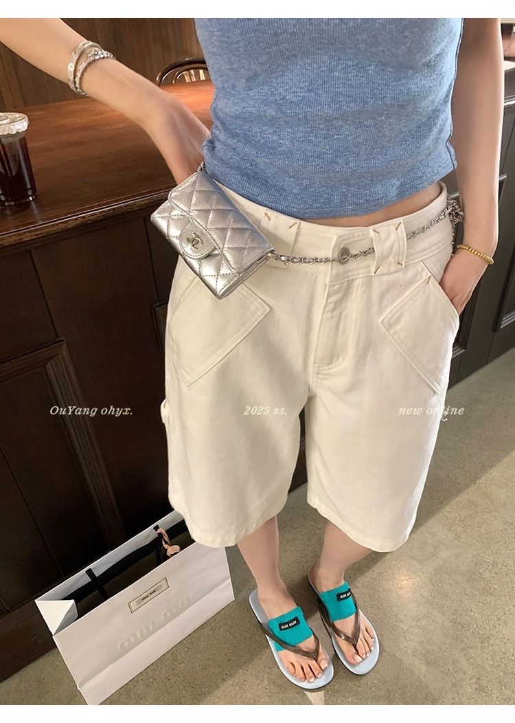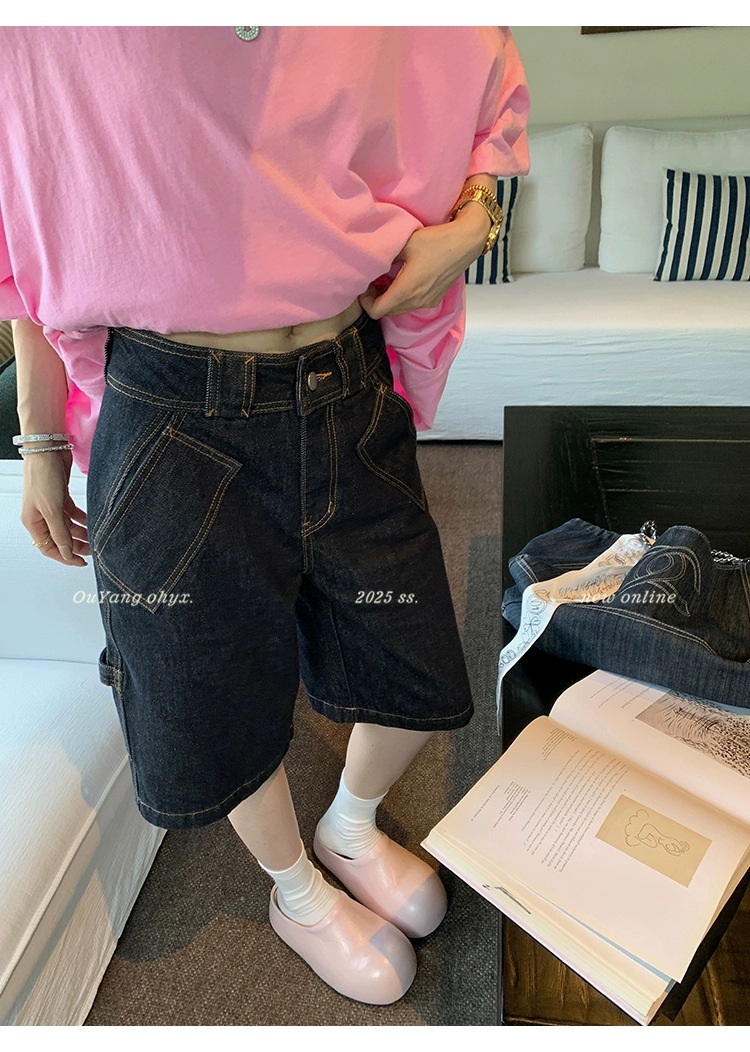 Ouyang 대비 컬러 데님 반바지 여성 여름 얇은 루즈 스트레이트 5부 바지 하이 웨이스트 슬리밍 복고풍 바지스토어 가기
