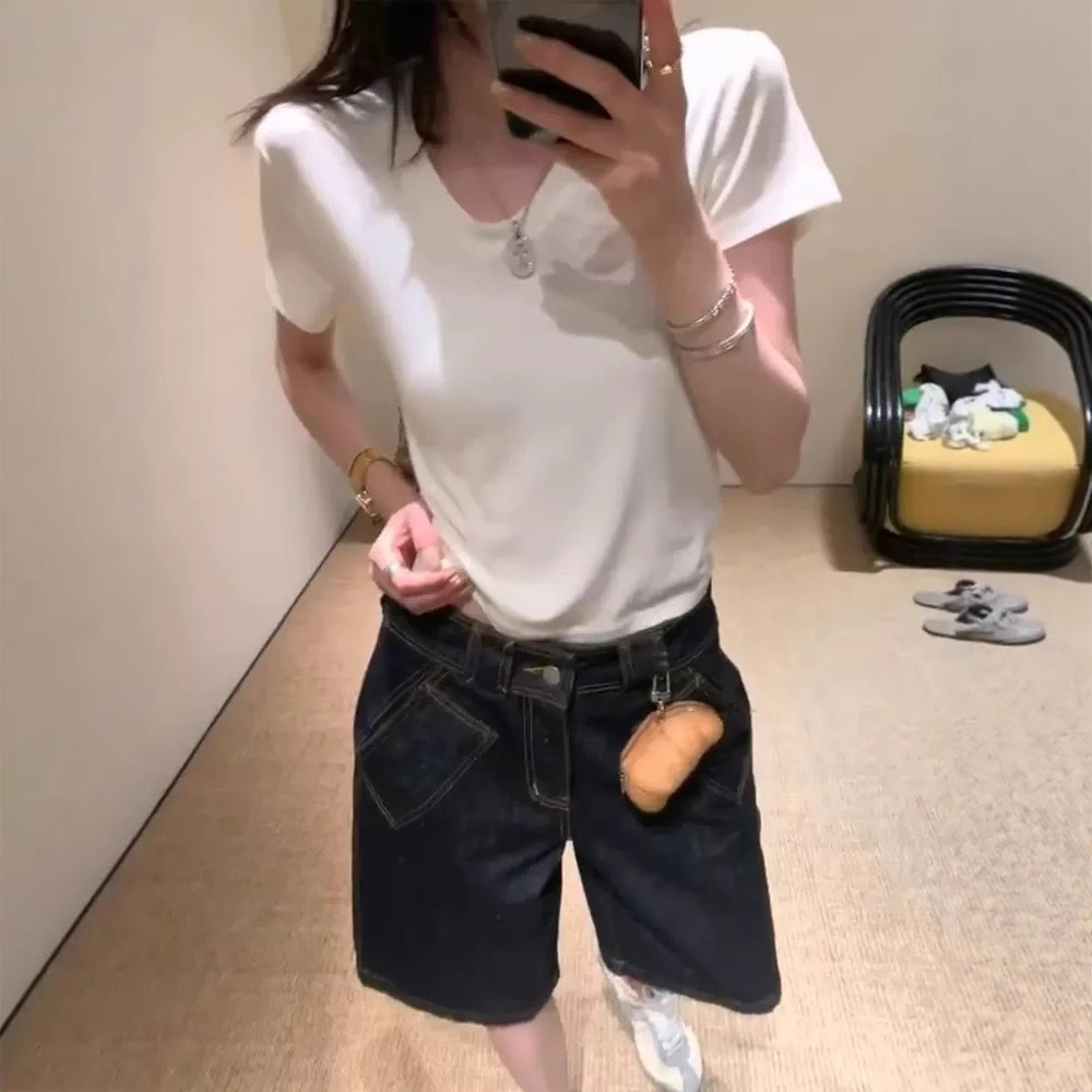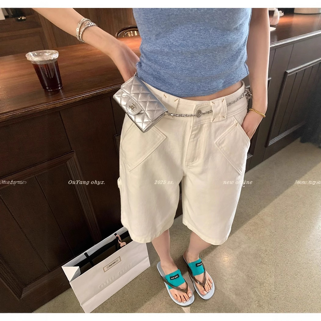 Ouyang 대비 컬러 데님 반바지 여성 여름 얇은 루즈 스트레이트 5부 바지 하이 웨이스트 슬리밍 복고풍 바지