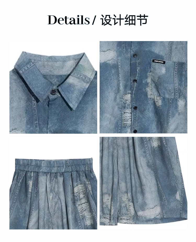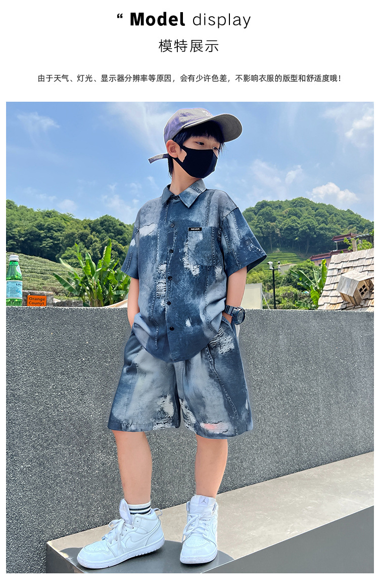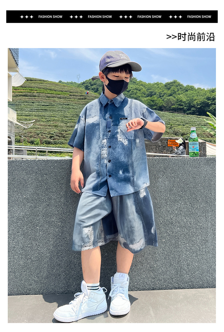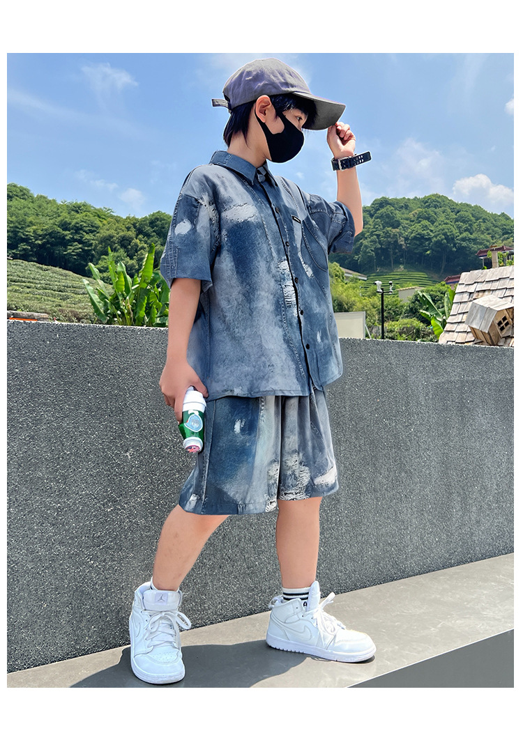 여름 새로운 얼음 실크 데님 셔츠와 바지 정장 2025 어린이 느슨한 캐주얼 소년 얇은 투피스 세트 유행스토어 가기
