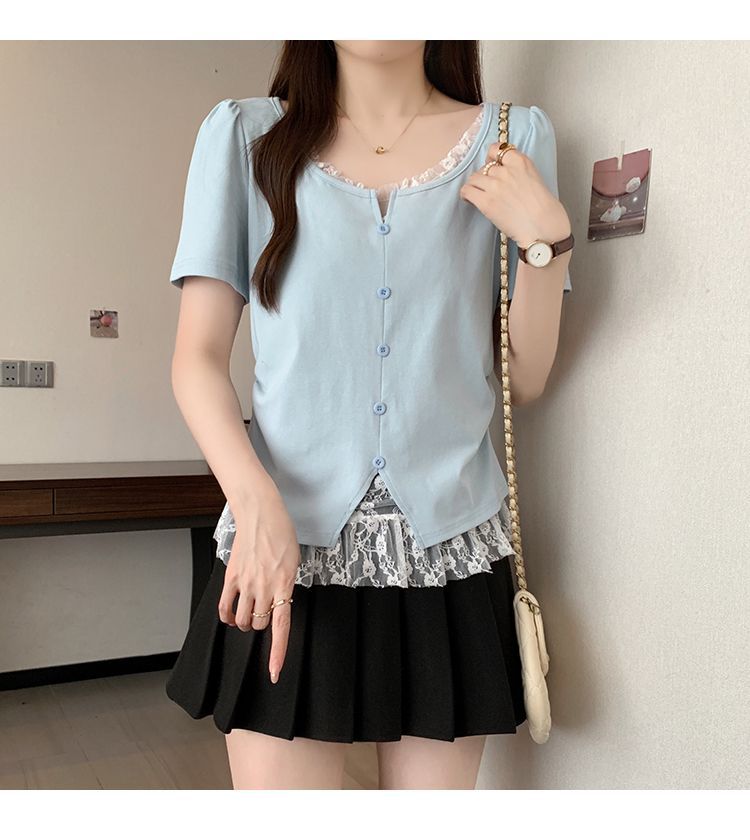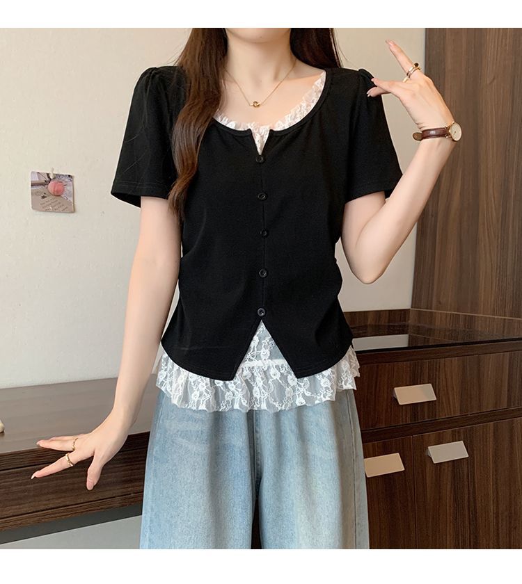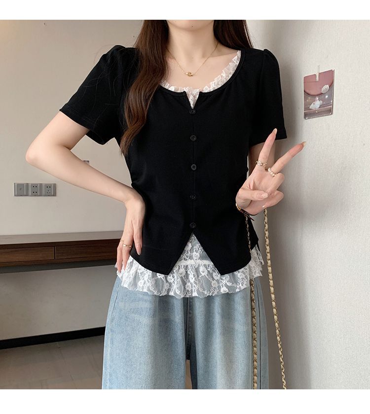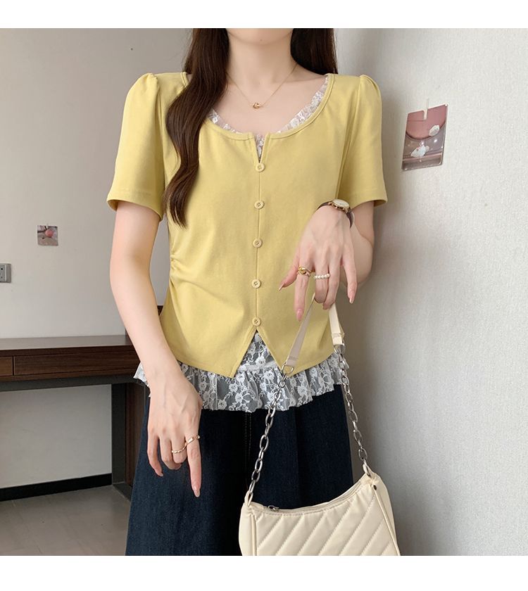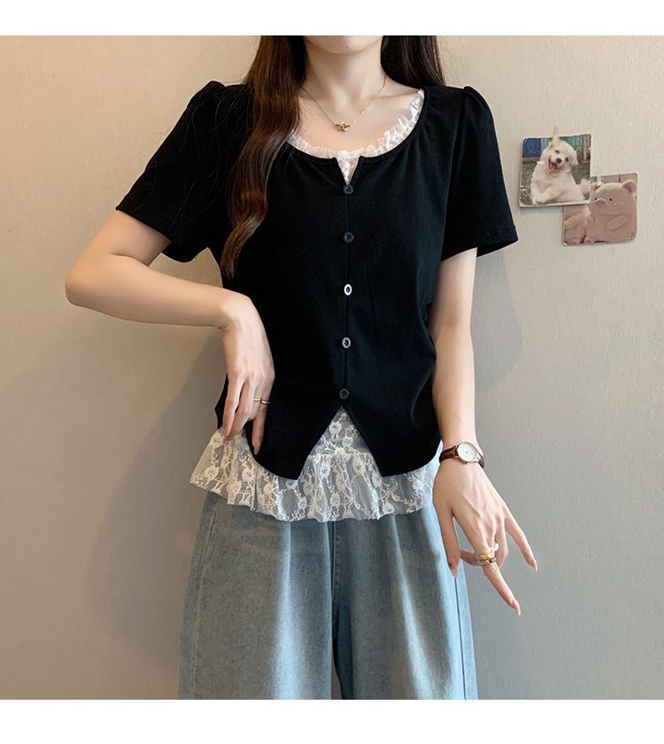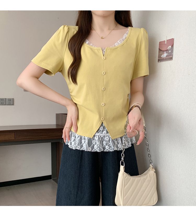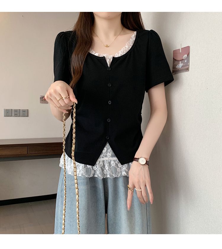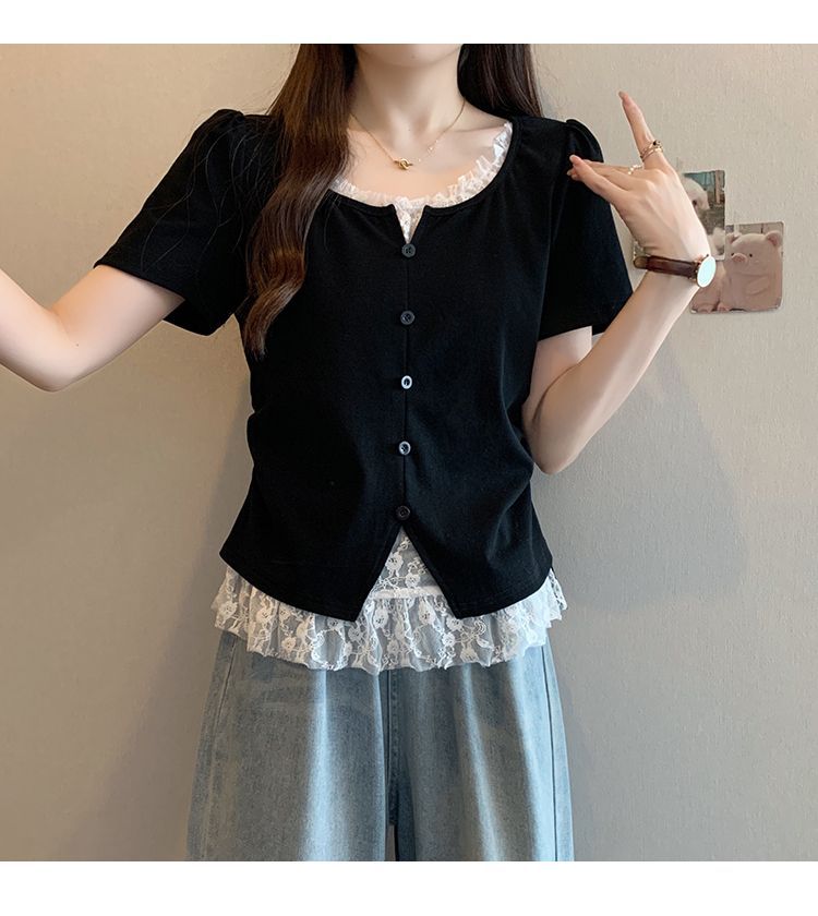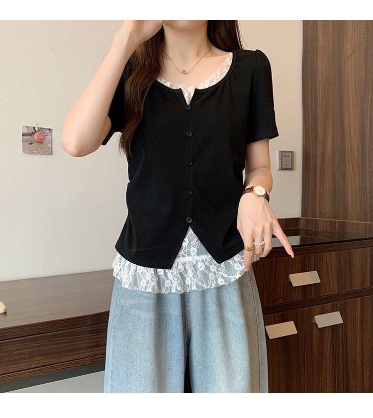 2025 새로운 여름 스타일 거즈 스플 라이스 가짜 투피스 반팔 티셔츠 여성 슬림 라운드 넥 티셔츠 탑스토어 가기