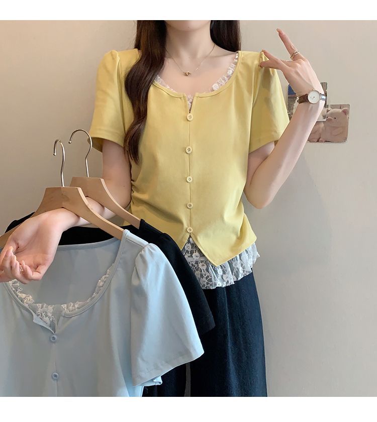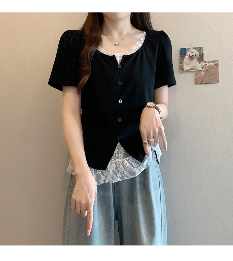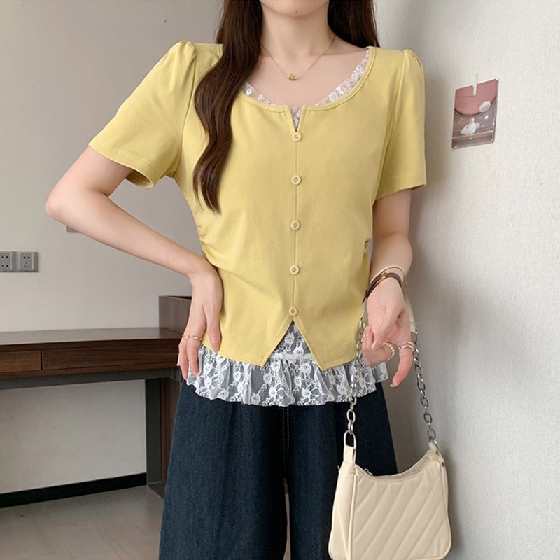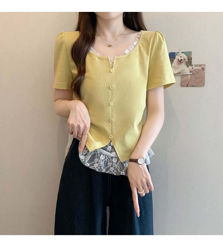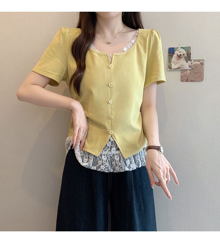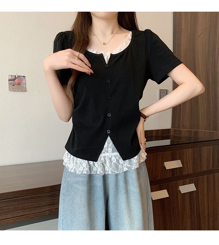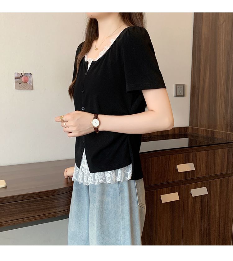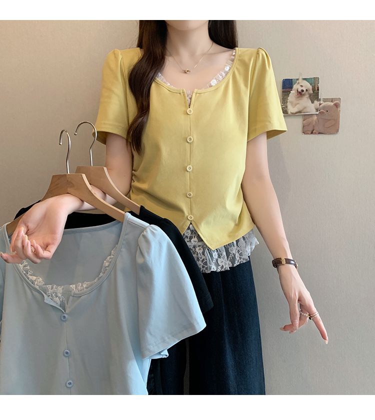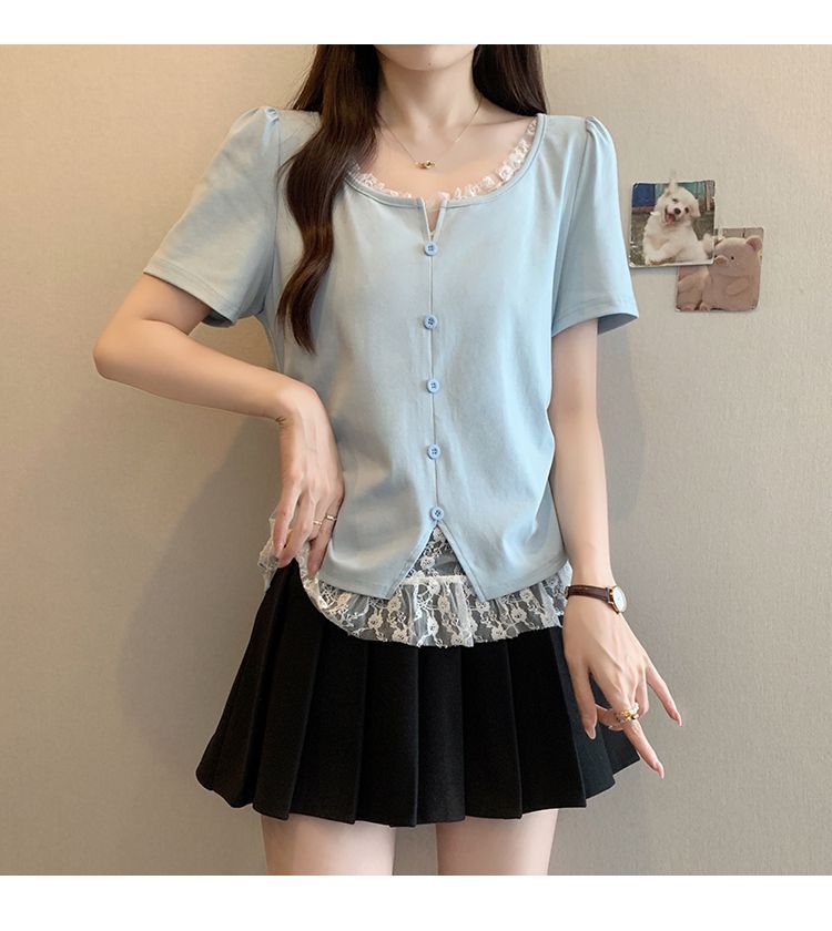 2025 새로운 여름 스타일 거즈 스플 라이스 가짜 투피스 반팔 티셔츠 여성 슬림 라운드 넥 티셔츠 탑스토어 가기
