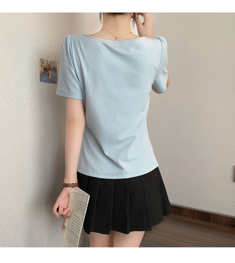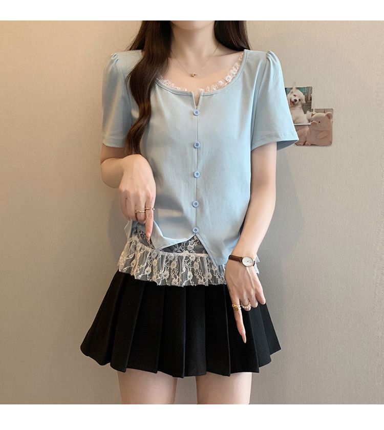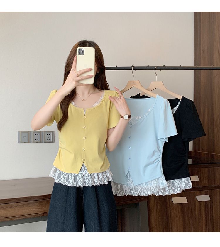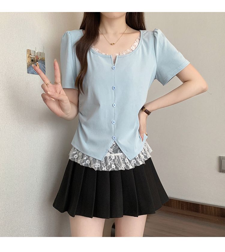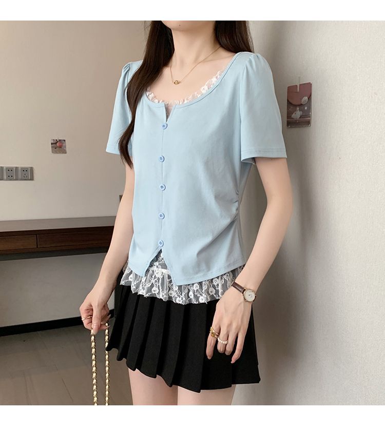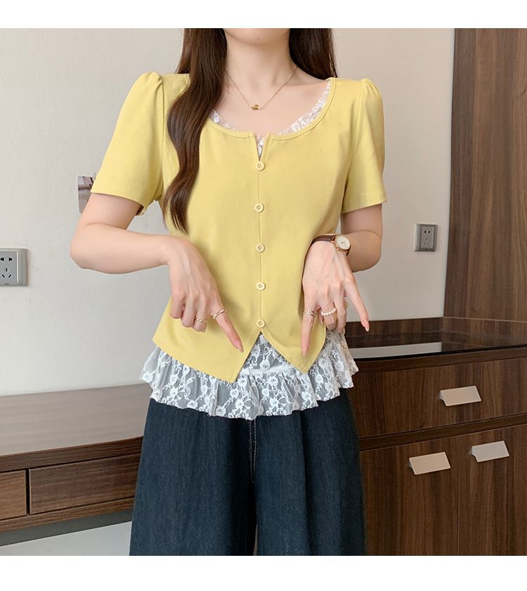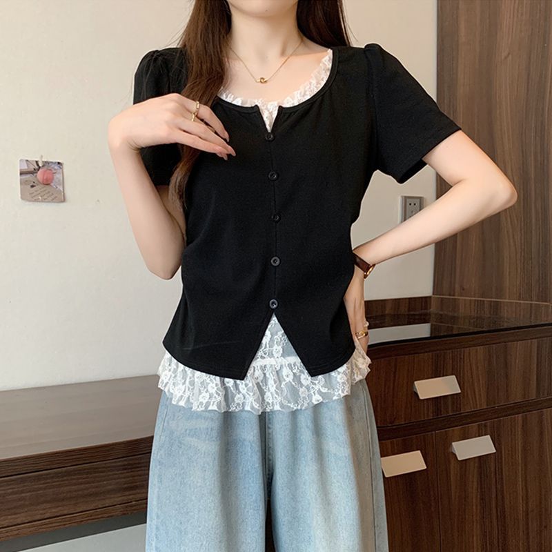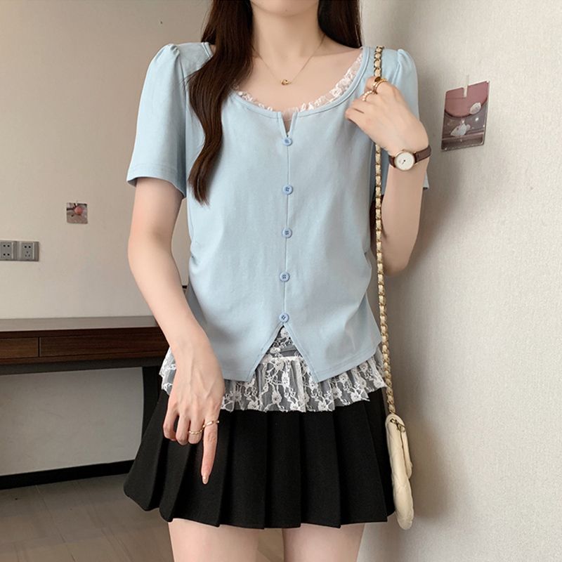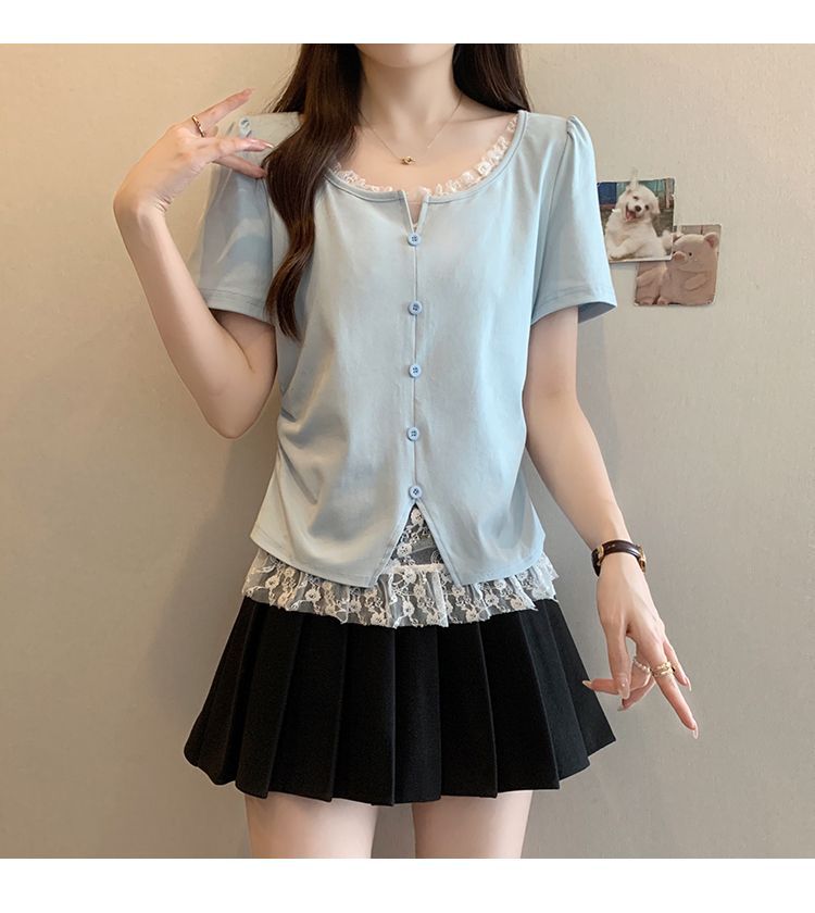 2025 새로운 여름 스타일 거즈 스플 라이스 가짜 투피스 반팔 티셔츠 여성 슬림 라운드 넥 티셔츠 탑스토어 가기