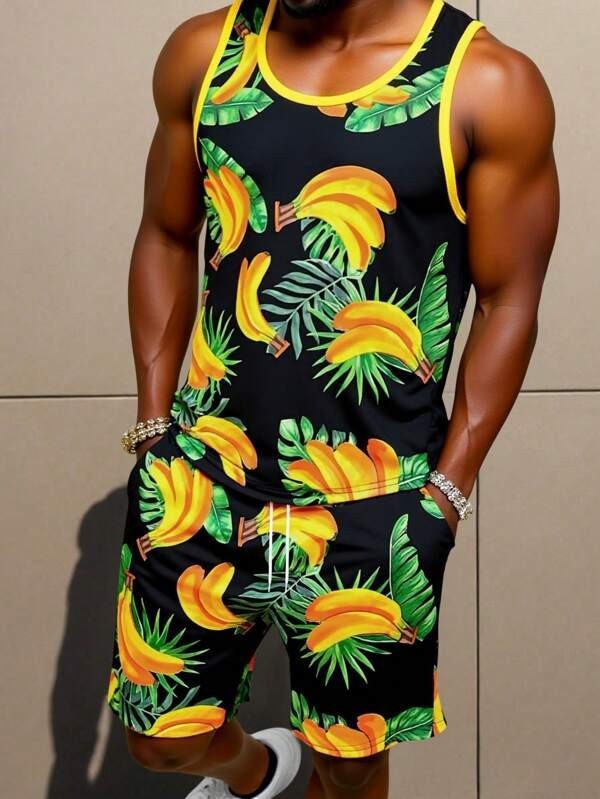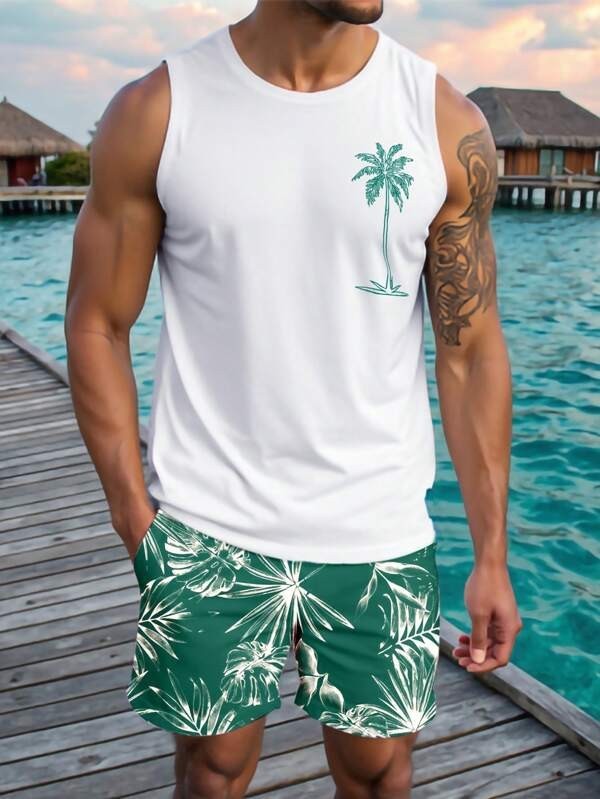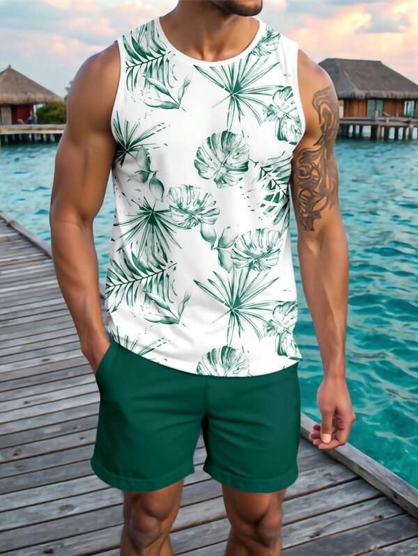 국경 간 독립 스테이션 새로운 3D 모조 면화 타이 염색 하와이 민소매 조끼 포켓 프린트 캐주얼 남성 정장