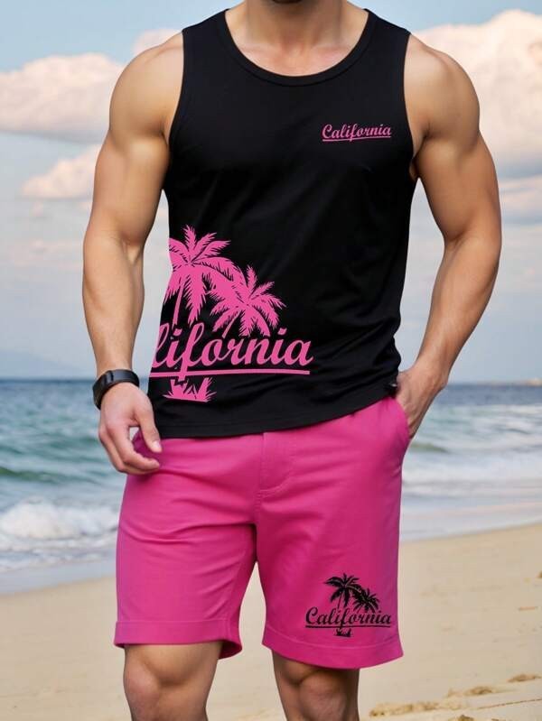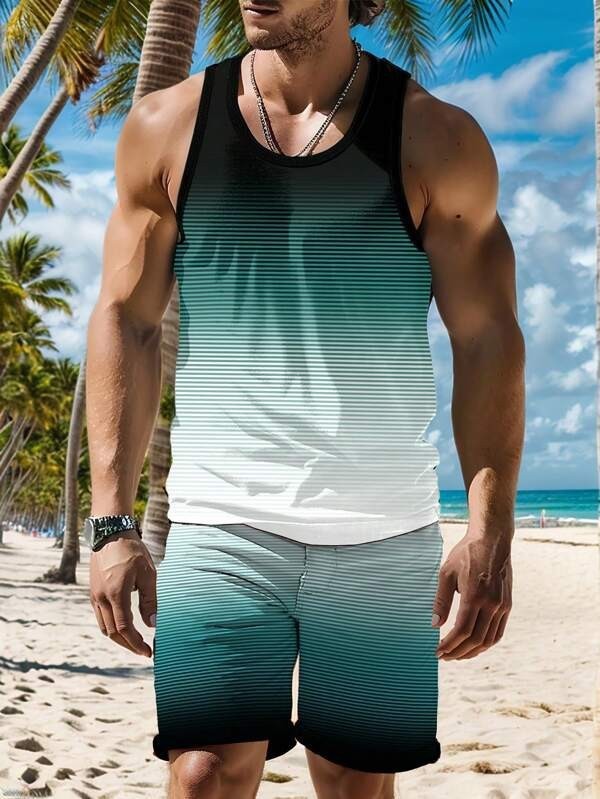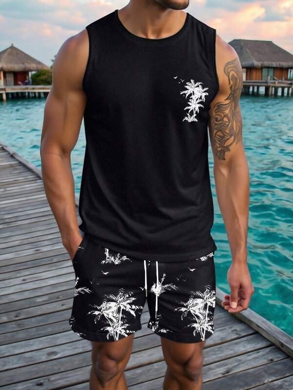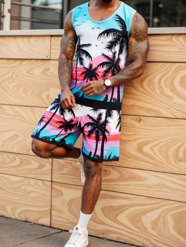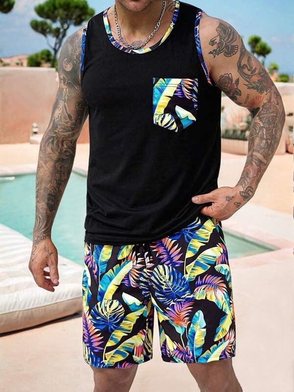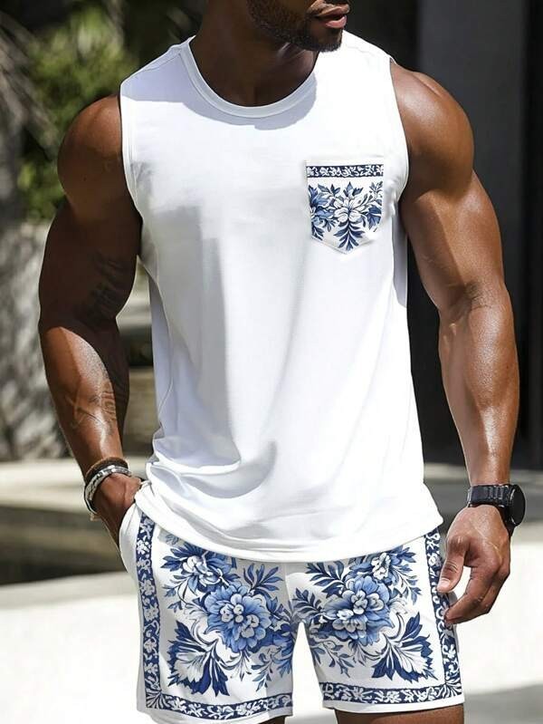 국경 간 독립 스테이션 새로운 3D 모조 면화 타이 염색 하와이 민소매 조끼 포켓 프린트 캐주얼 남성 정장스토어 가기