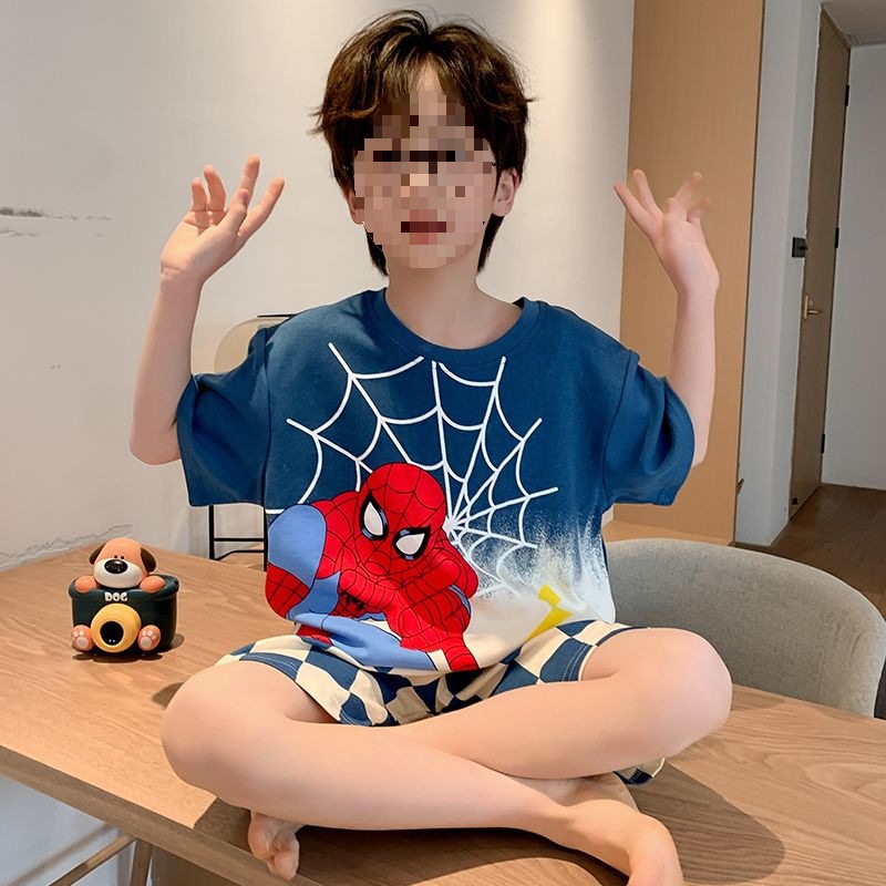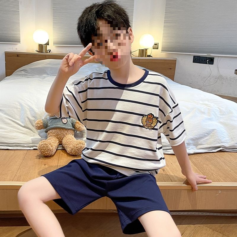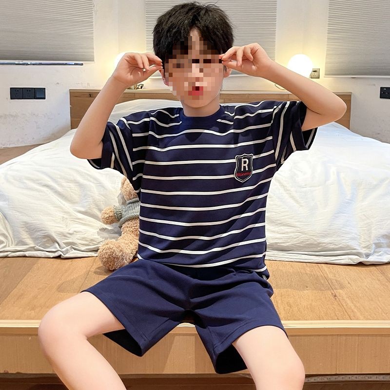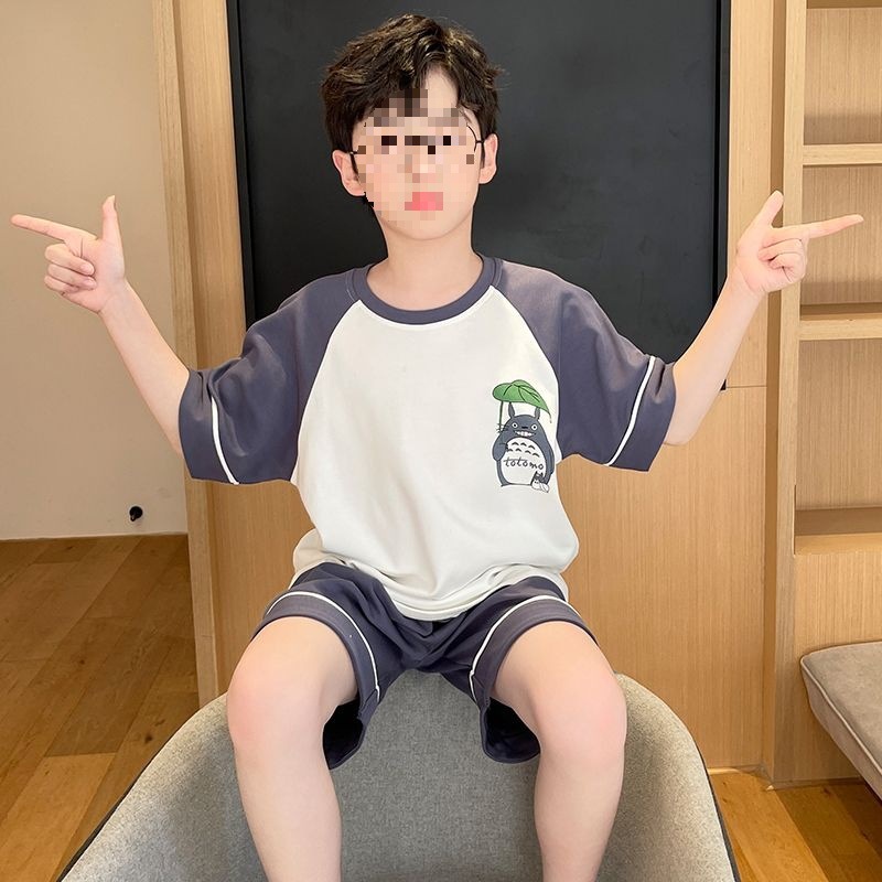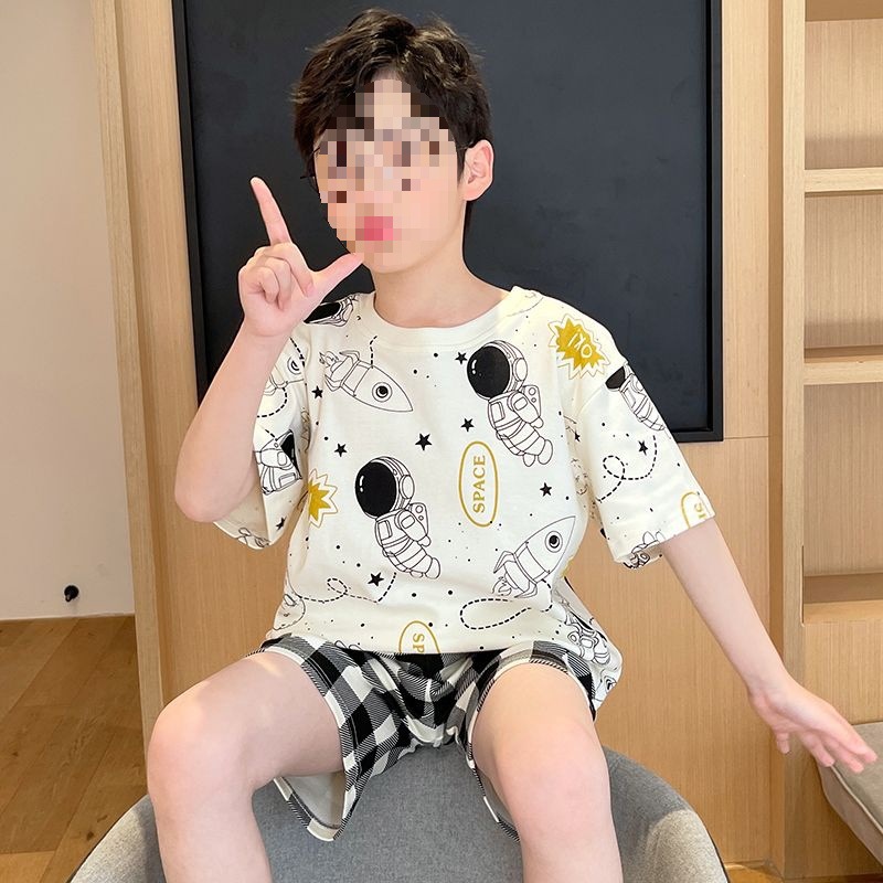 소년 잠옷 어린이 여름 새 시즌 얇은 순면 반팔 양복 어린 소년 세련된 큰 어린이 귀여운 가정 옷