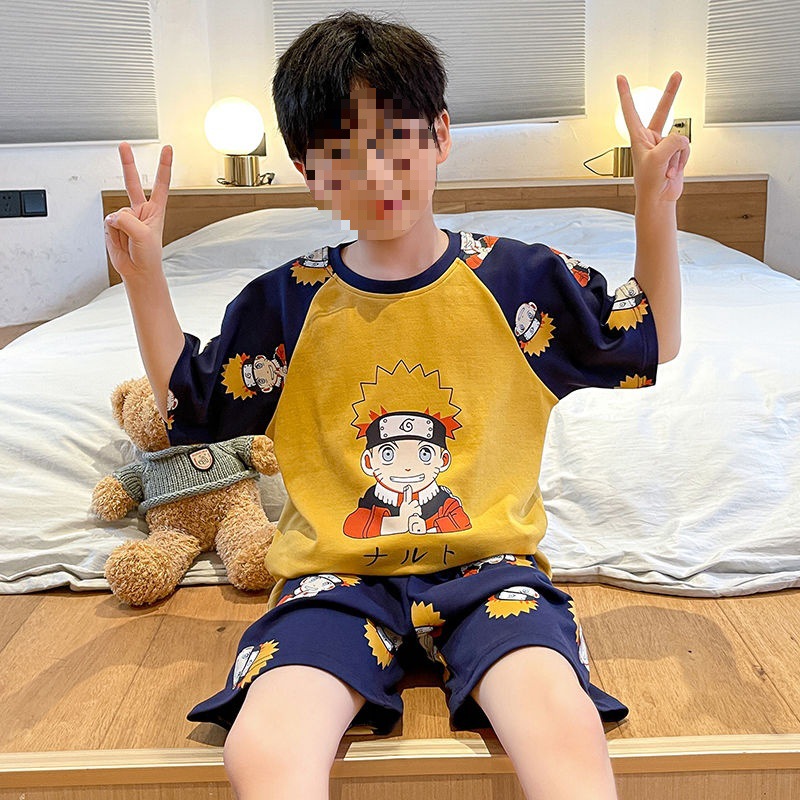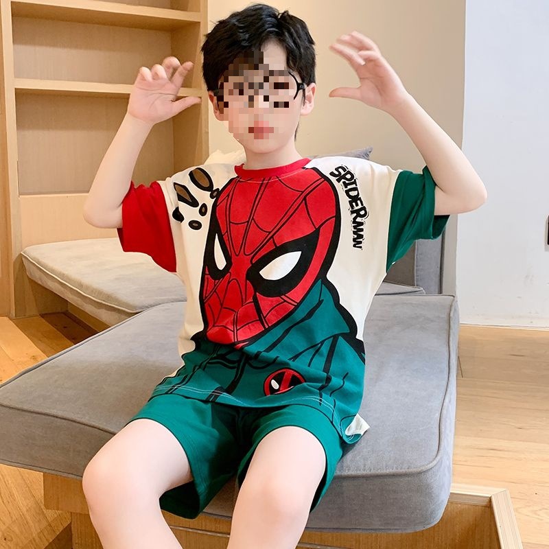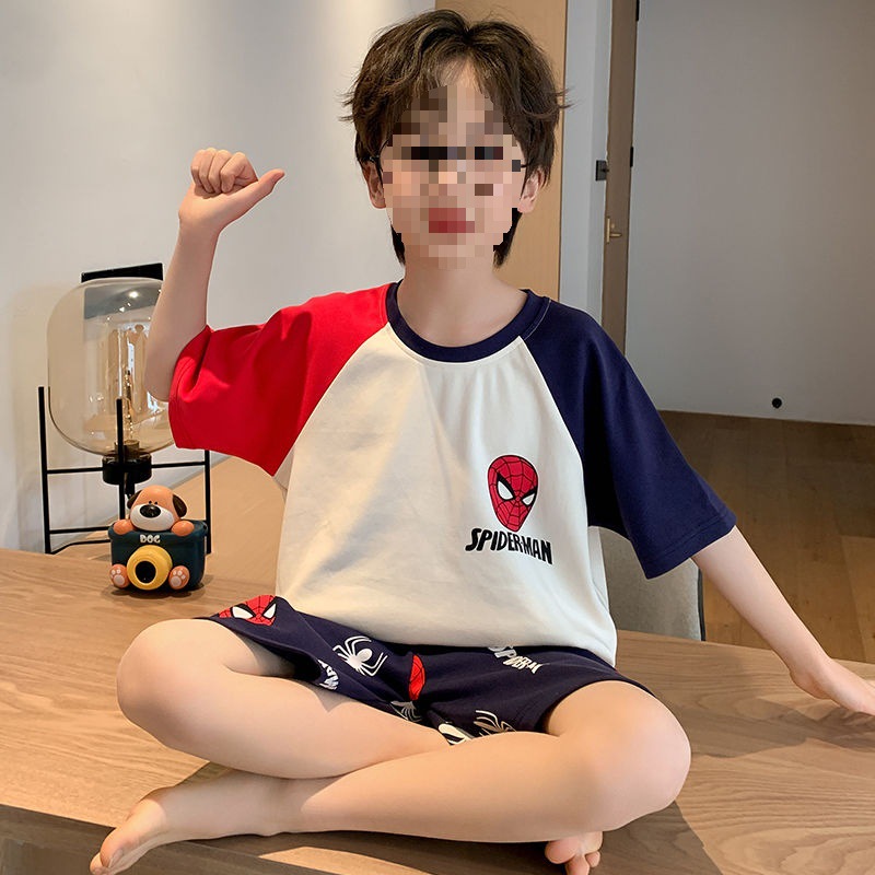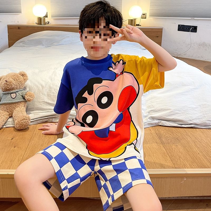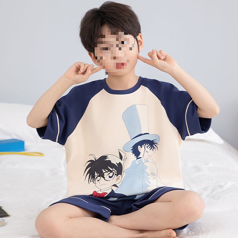 소년 잠옷 어린이 여름 새 시즌 얇은 순면 반팔 양복 어린 소년 세련된 큰 어린이 귀여운 가정 옷