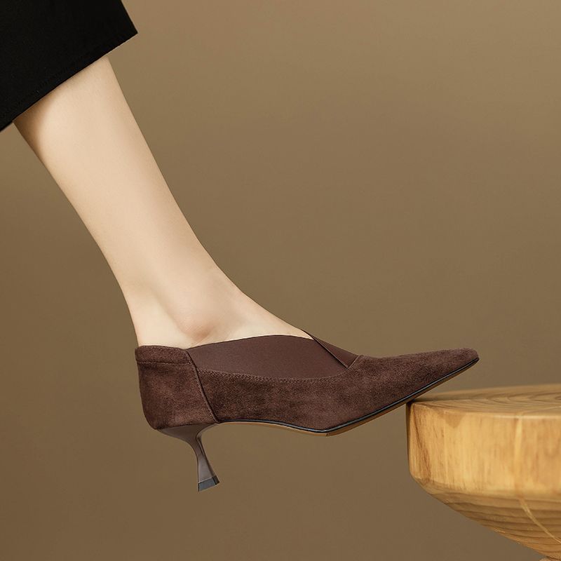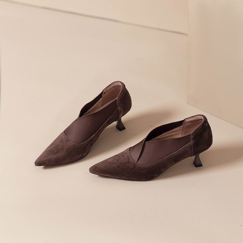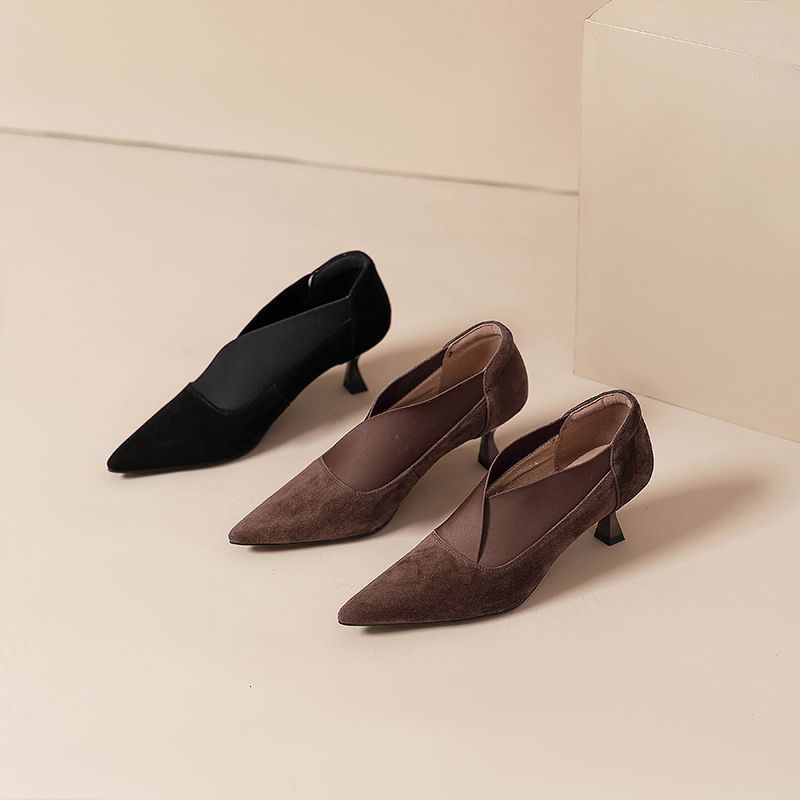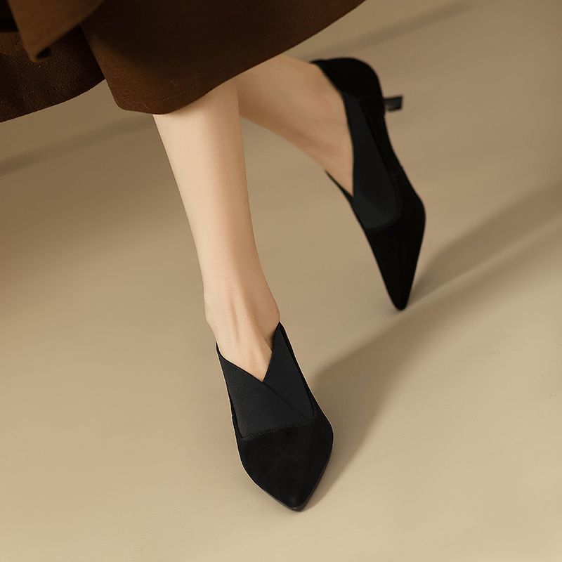 2025 프렌치 포인티드 토 여성용 다용도 슈즈, 봄, 가을 새로운 스타일, 통근용 누드 부츠, V 입 얇은 굽, 천연 가죽 하이힐스토어 가기