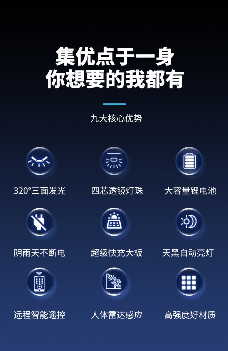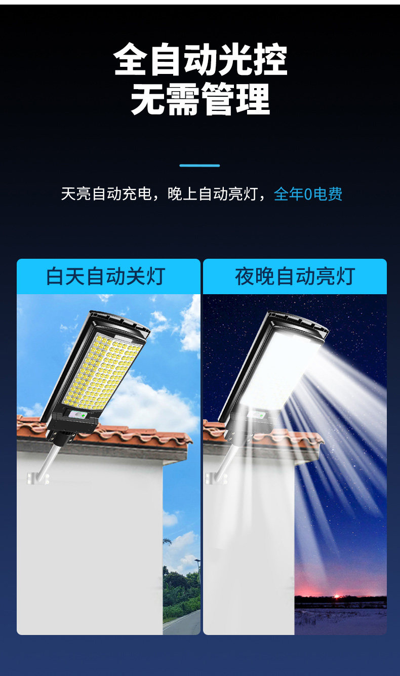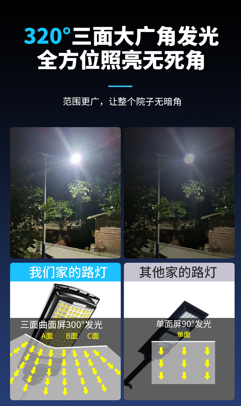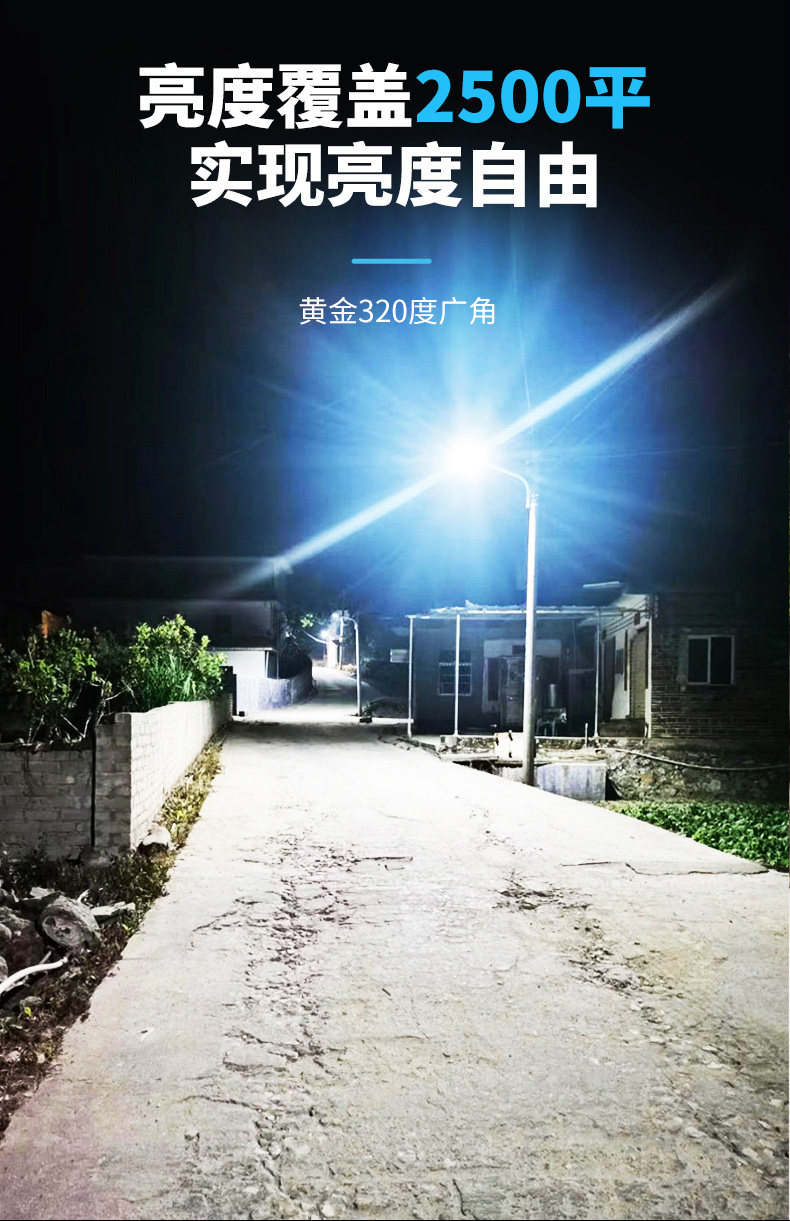 • 곡면 렌즈는 68000W(로드 장착) [1300평방미터]를 밝히며 인체 센서 + 어두울 때 밤새도록 자동으로 켜집니다.