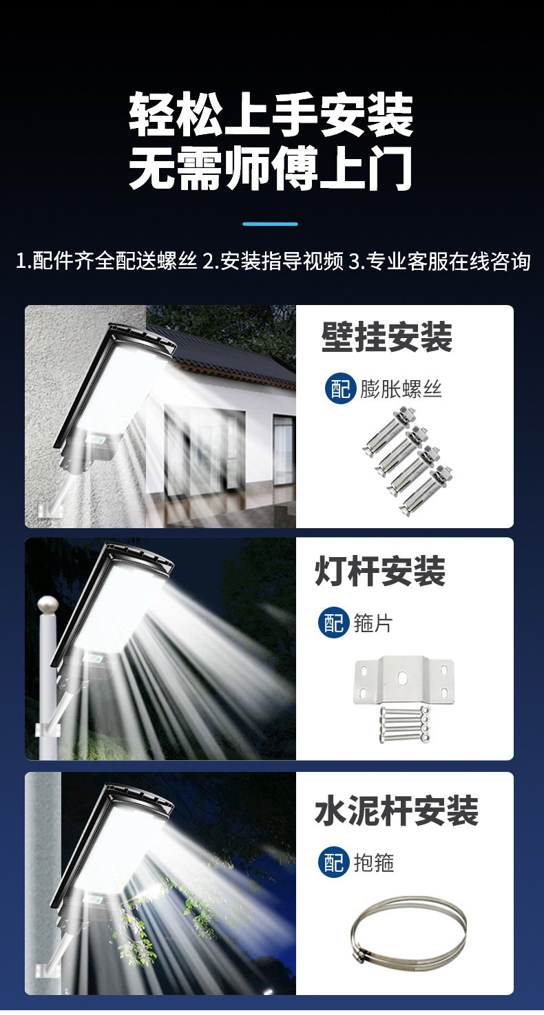 • 곡면 렌즈는 15000W(벽 장착) [700평방미터]를 방출하며 인체 센서가 장착되어 있으며 어두워지면 밤새도록 자동으로 켜집니다.