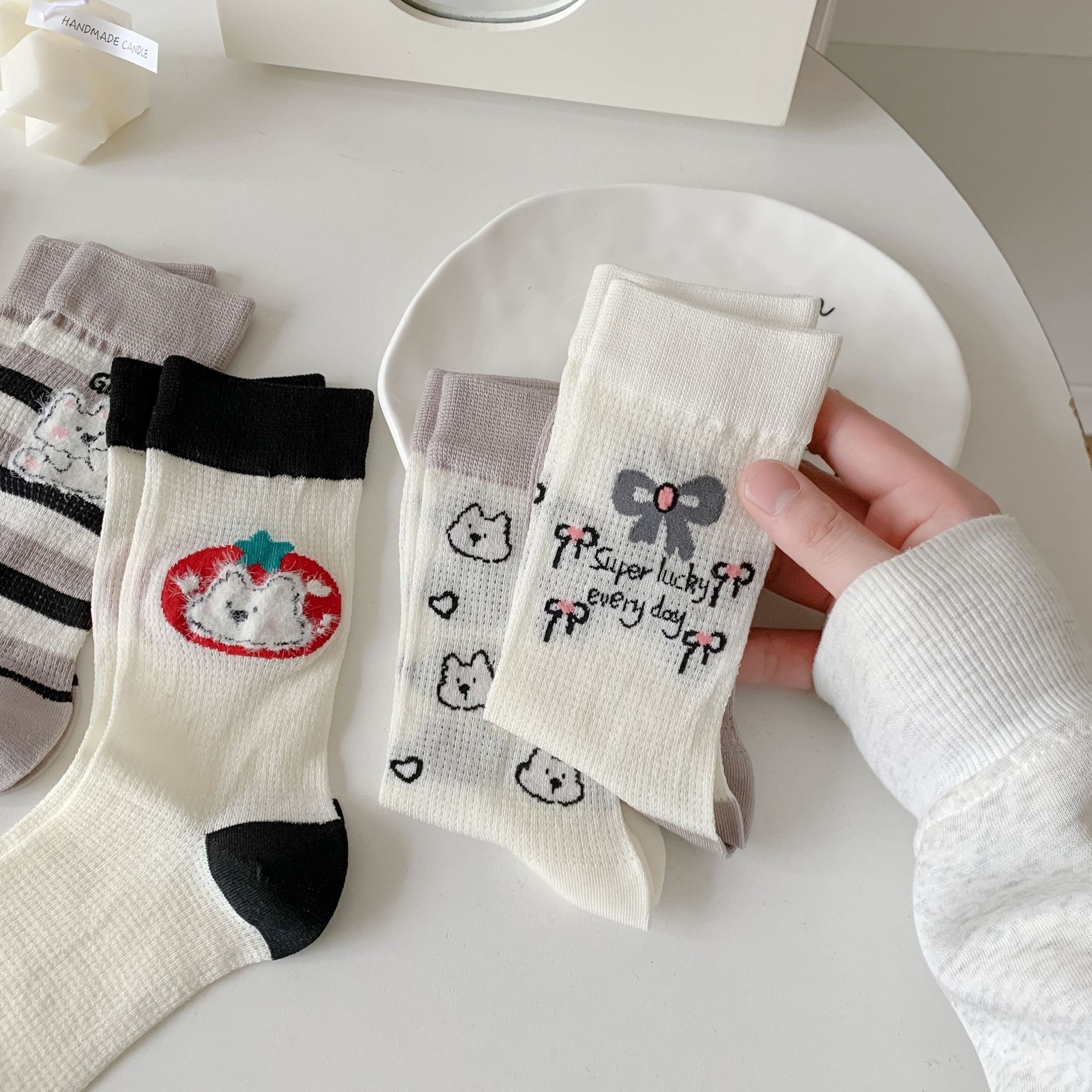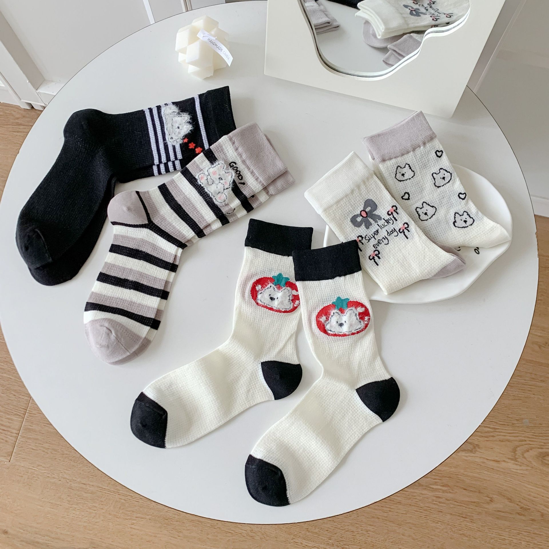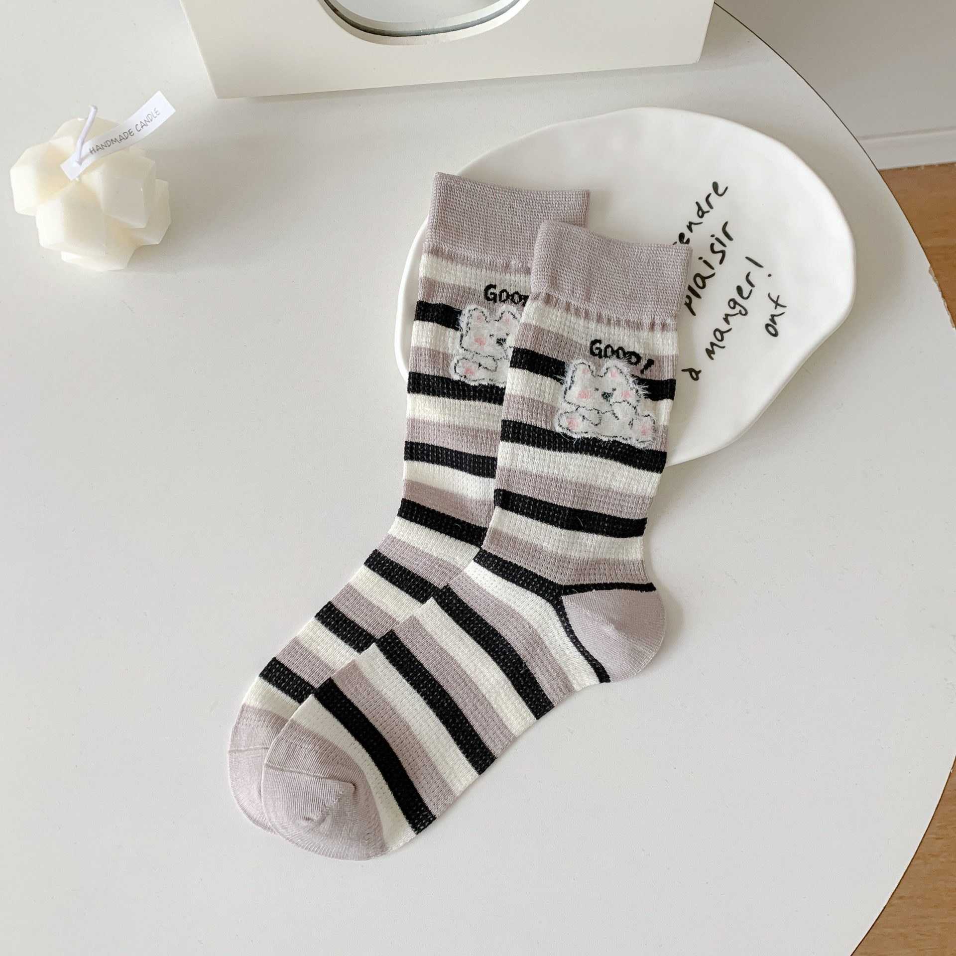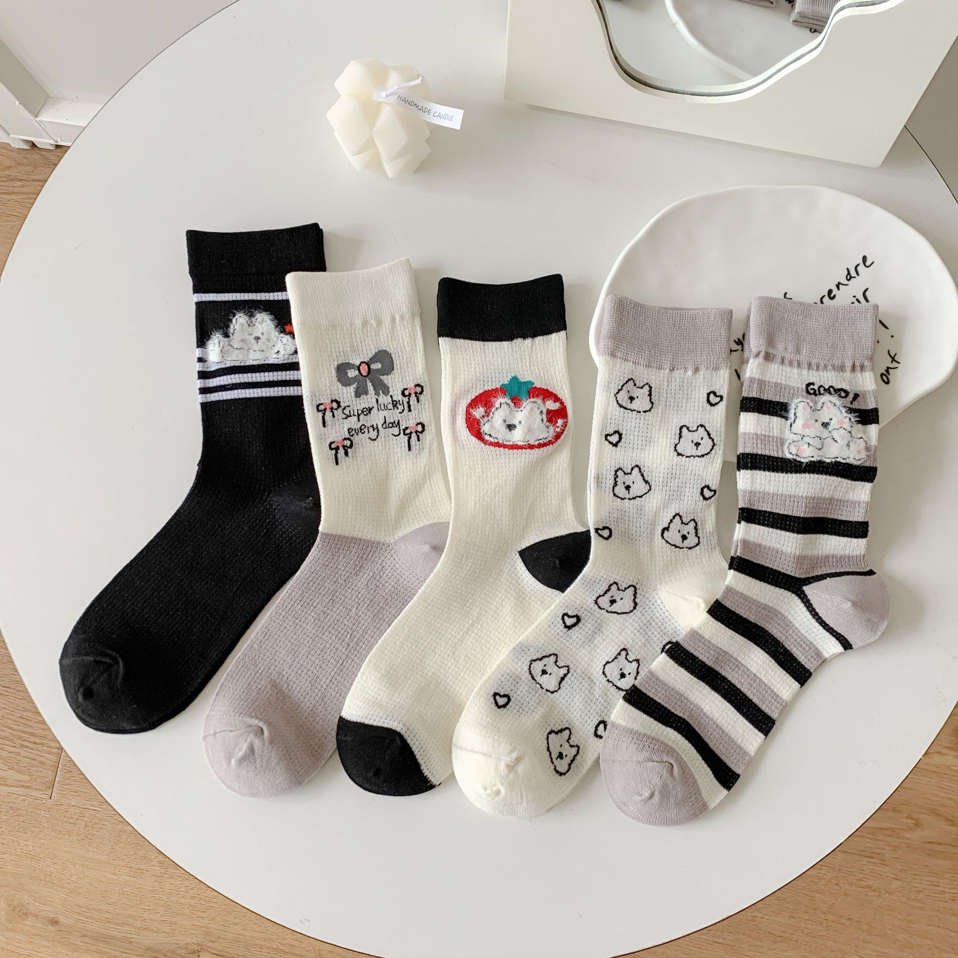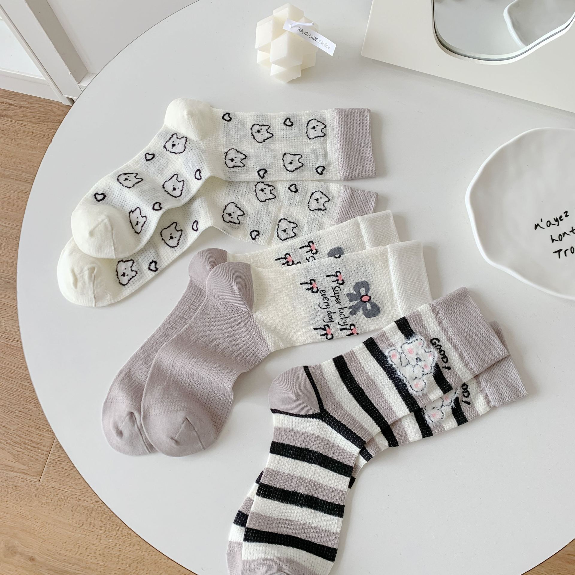 봄과 가을 꽃밭 토끼 귀여운 중목 양말 만화 강아지 줄무늬 리본 패턴 달콤한 모달 여름 여성 양말