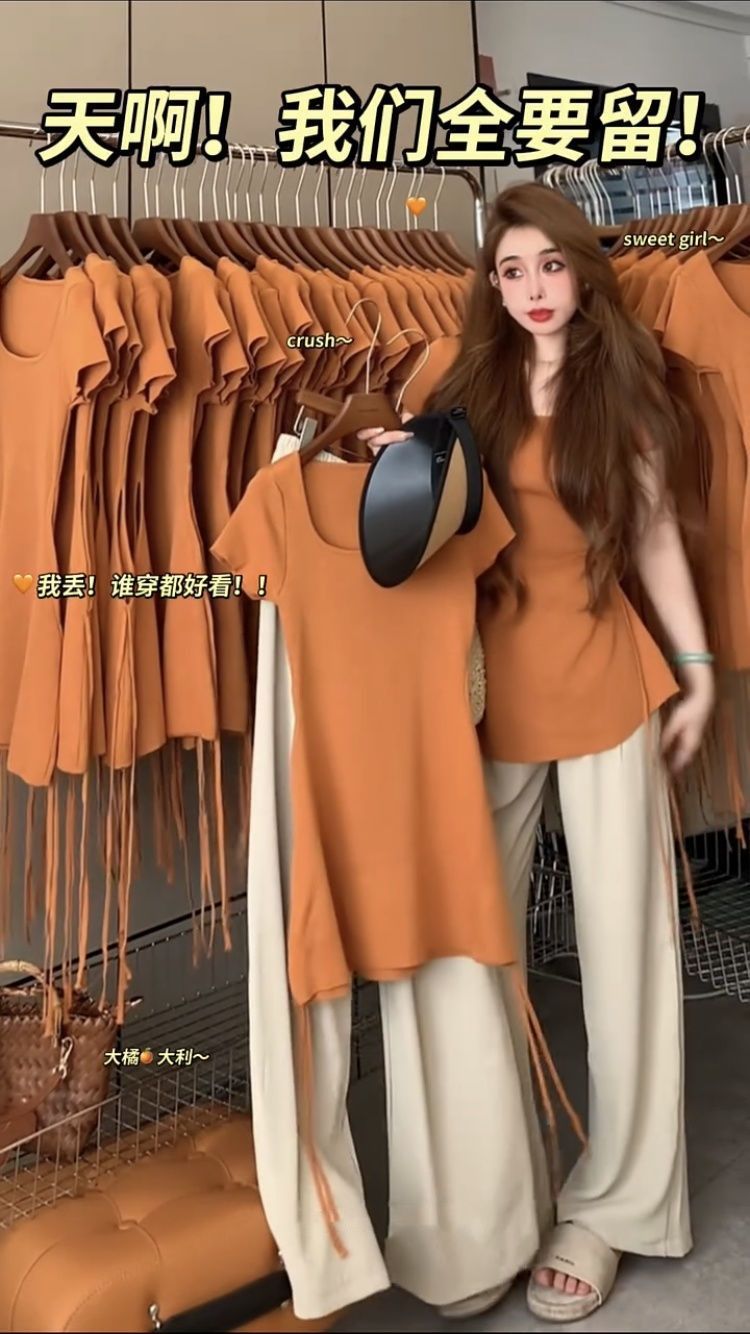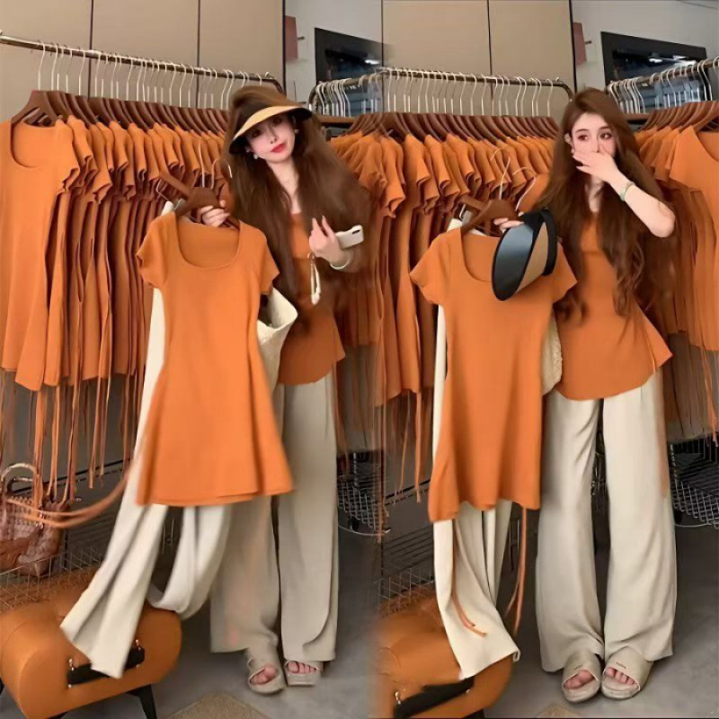 1012 # 여성을 위한 패셔너블한 연령 감소 슈트, 여름 디자인, 스트랩 반소매 탑, 스트레이트 와이드 레그 팬츠, 투피스 세트스토어 가기