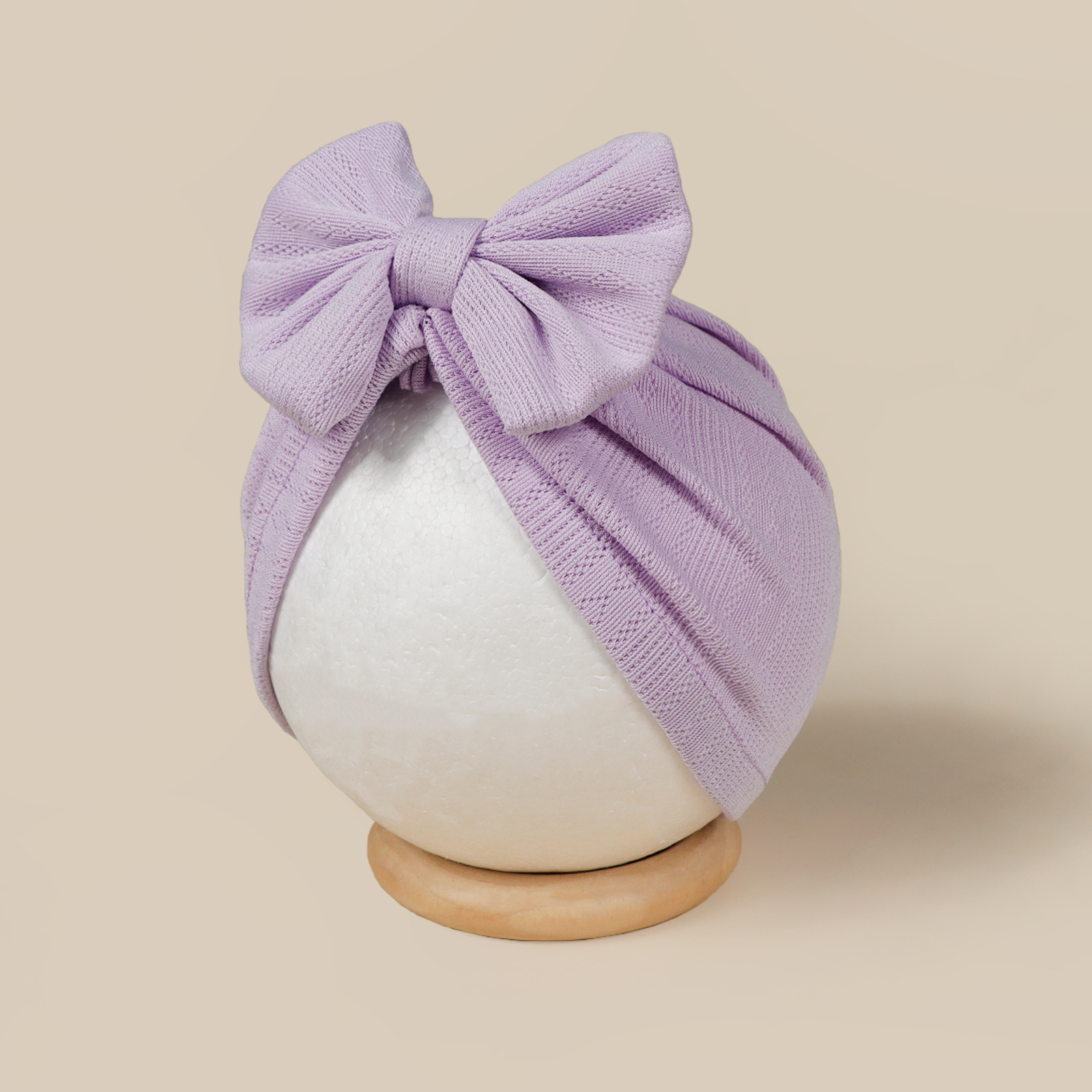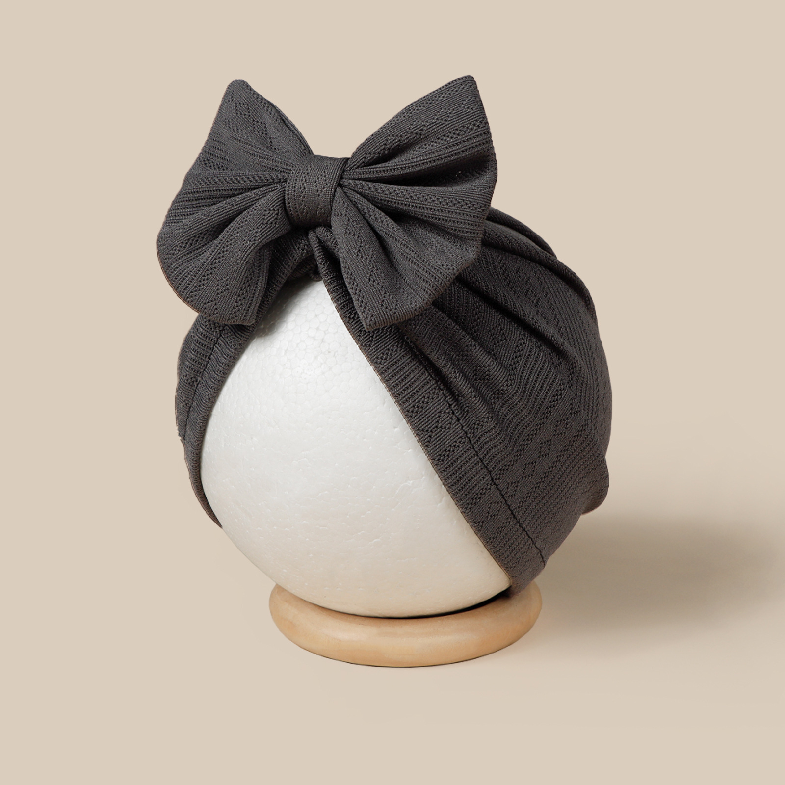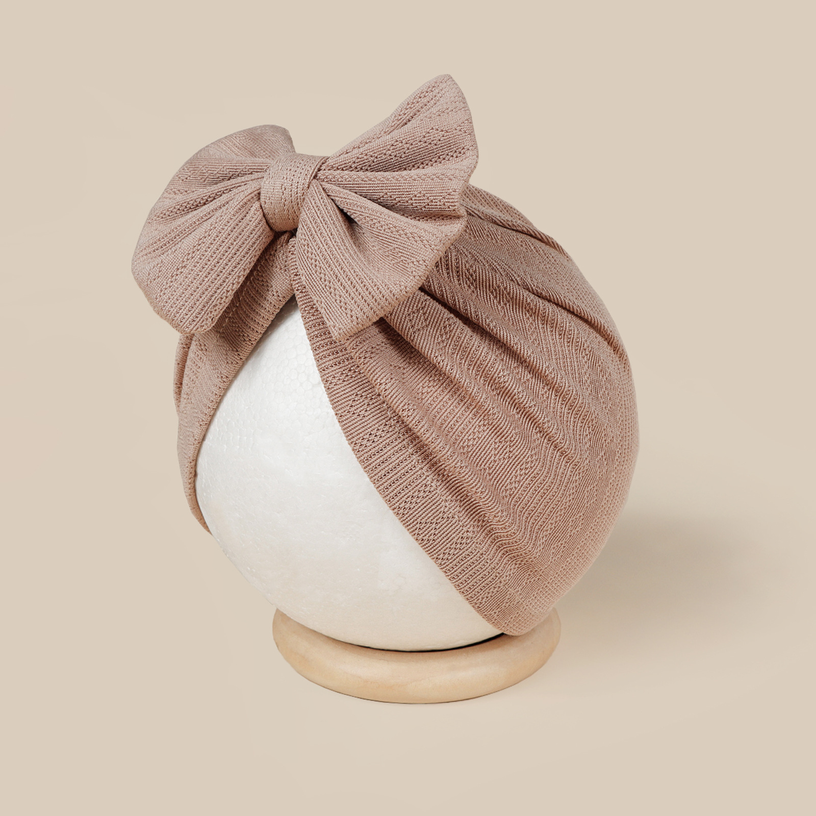 这是一款时尚百搭的婴儿帽,中心位置装饰了一个可爱的大蝴蝶结图案,主要由柔软舒适的提花面料制成。是一款百搭的包头护耳婴儿帽。