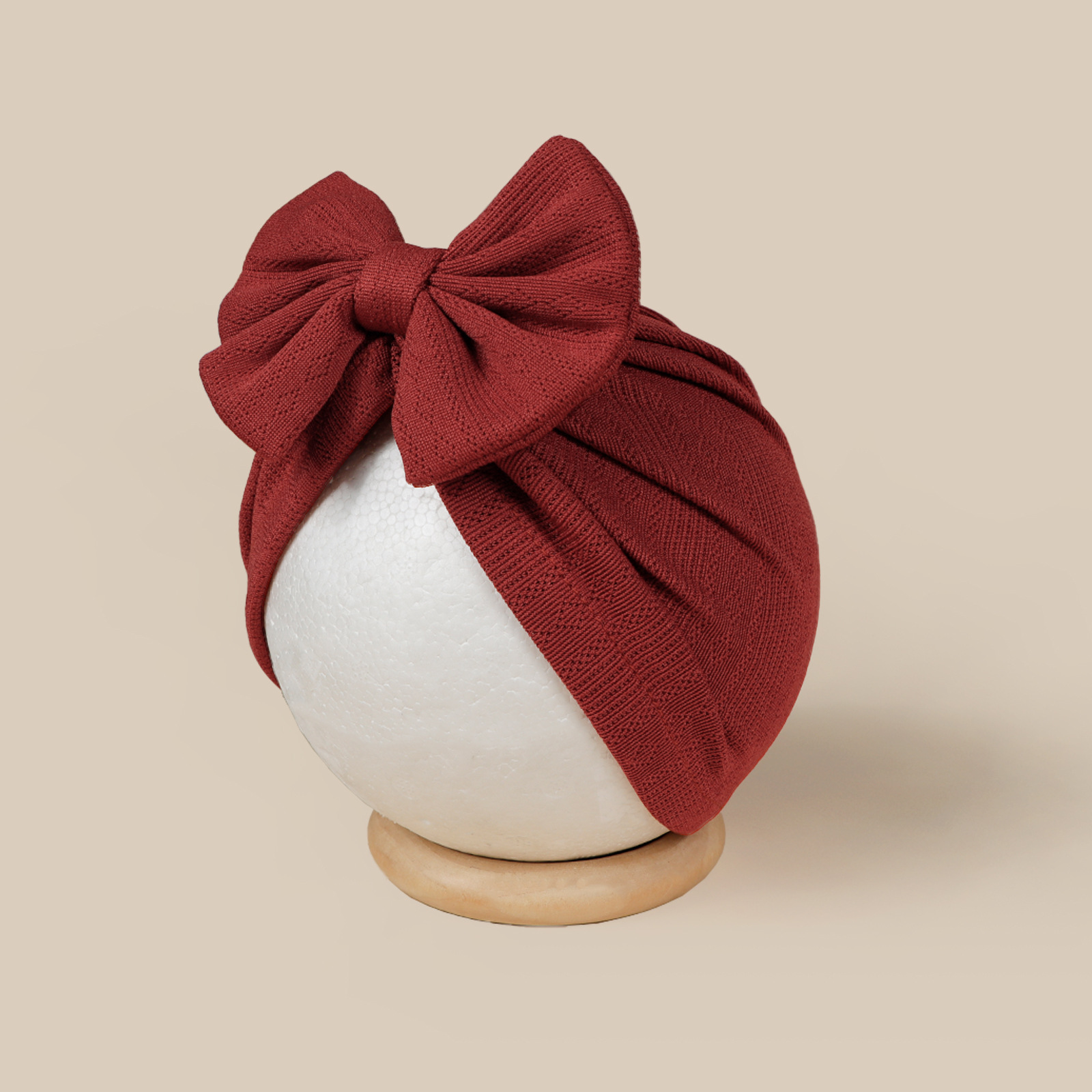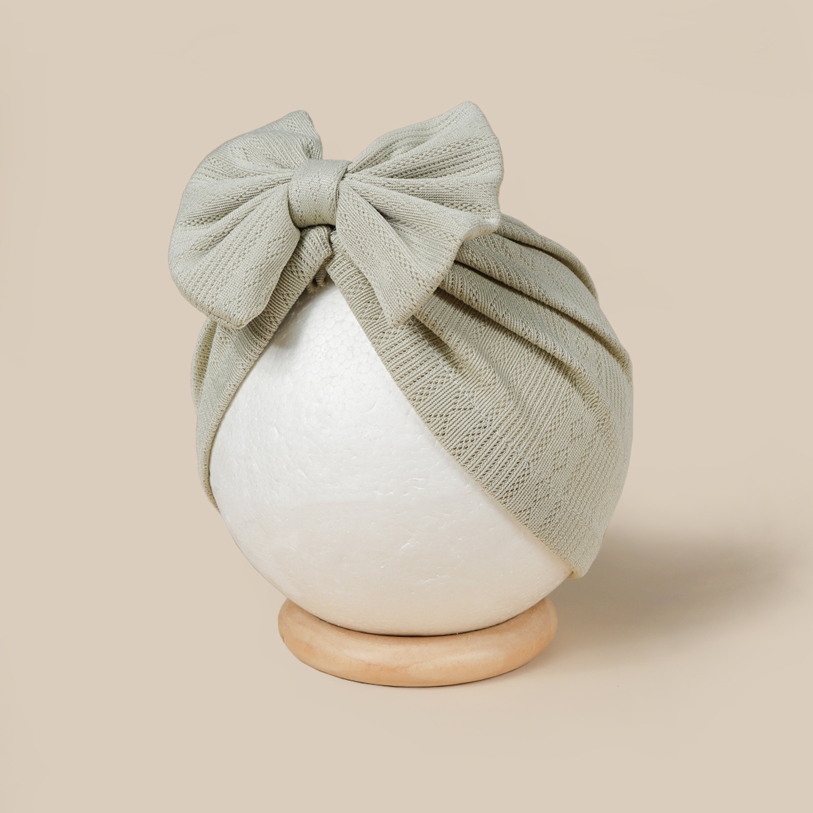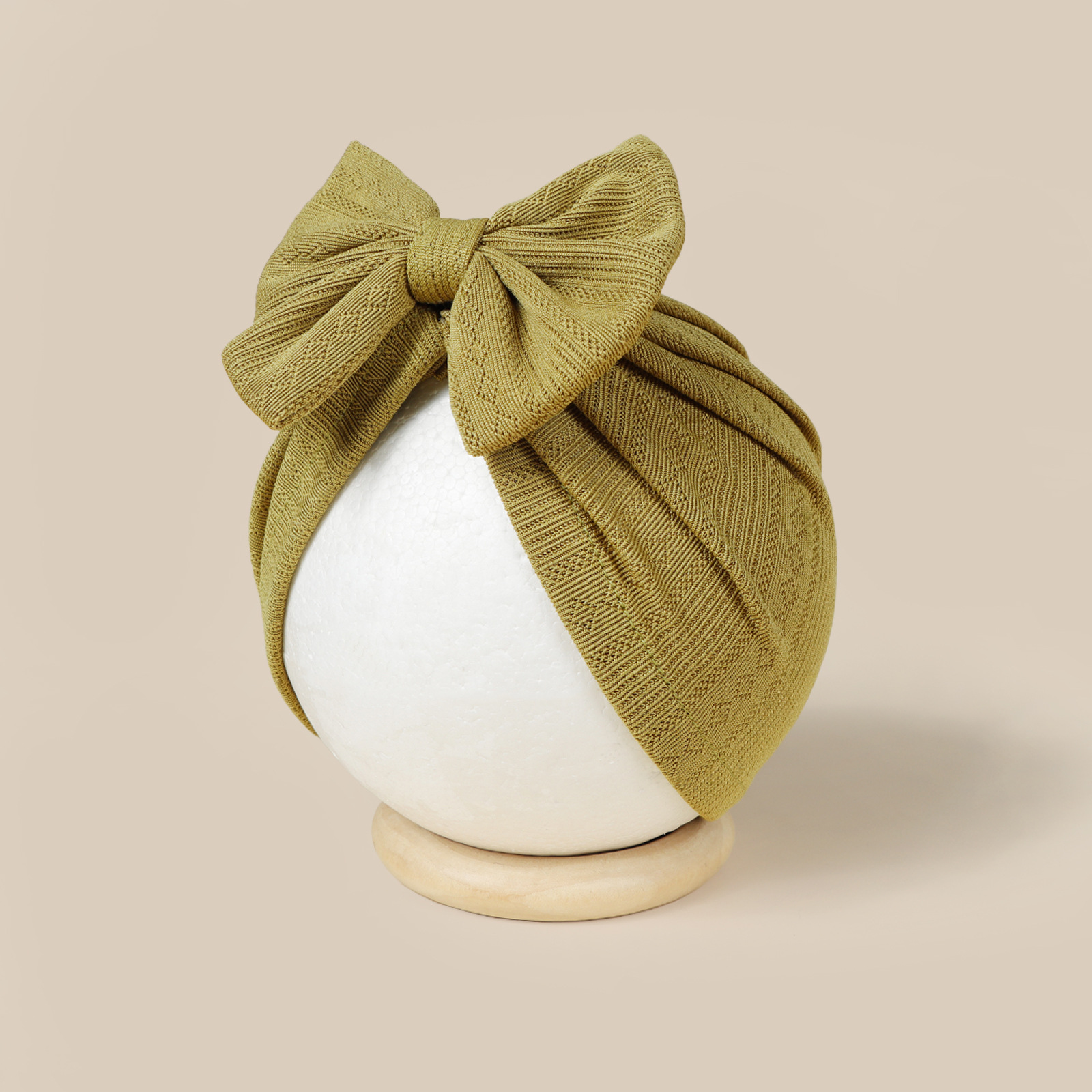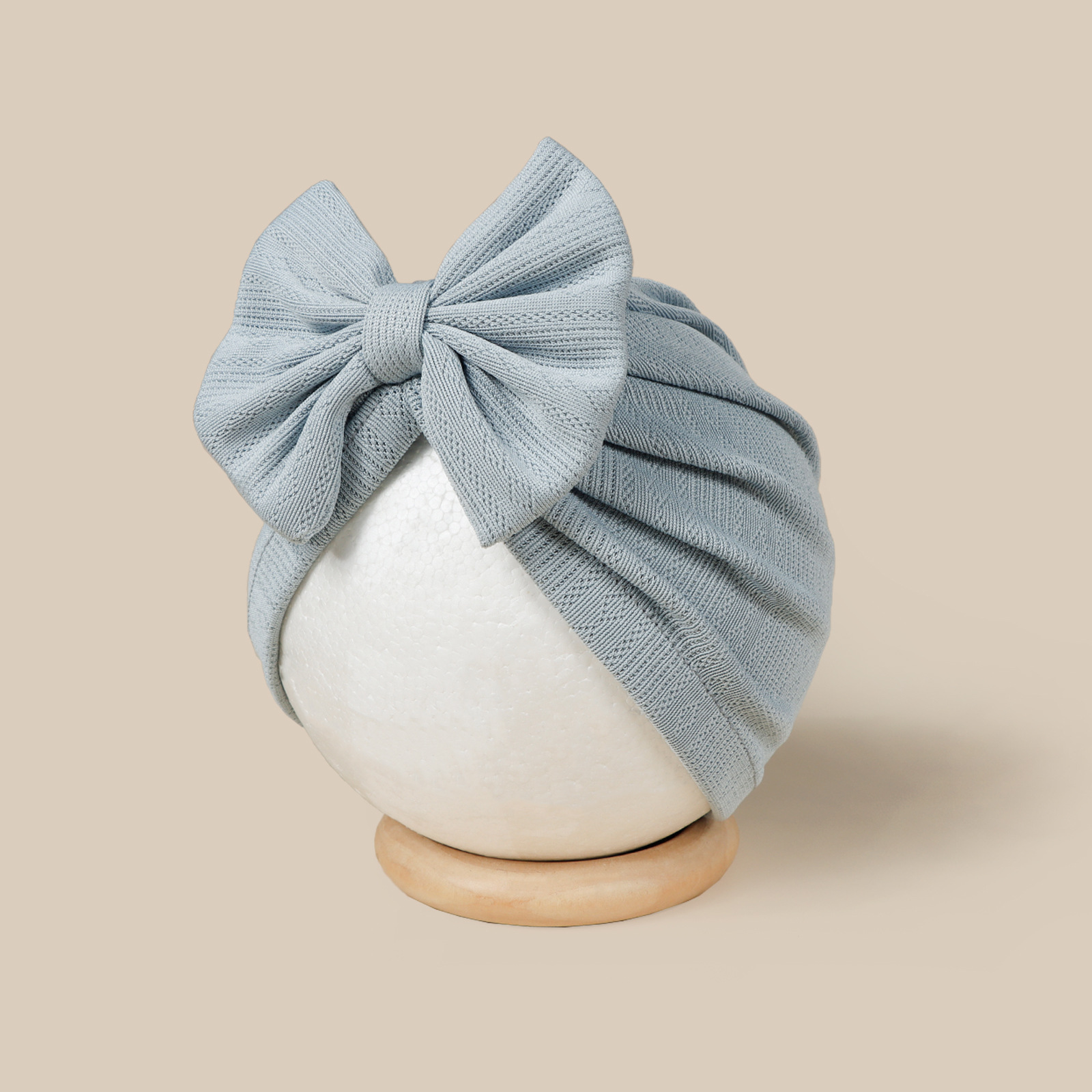 这是一款时尚百搭的婴儿帽,中心位置装饰了一个可爱的大蝴蝶结图案,主要由柔软舒适的提花面料制成。是一款百搭的包头护耳婴儿帽。