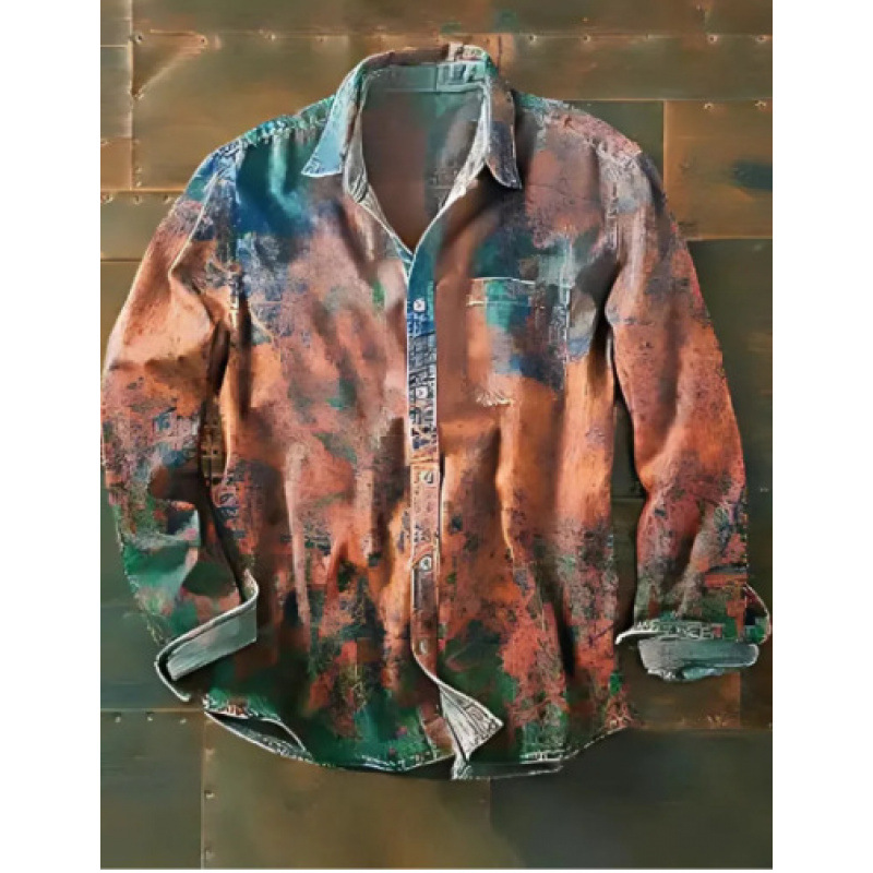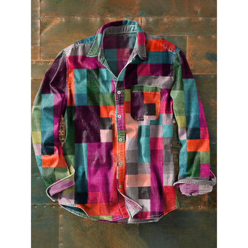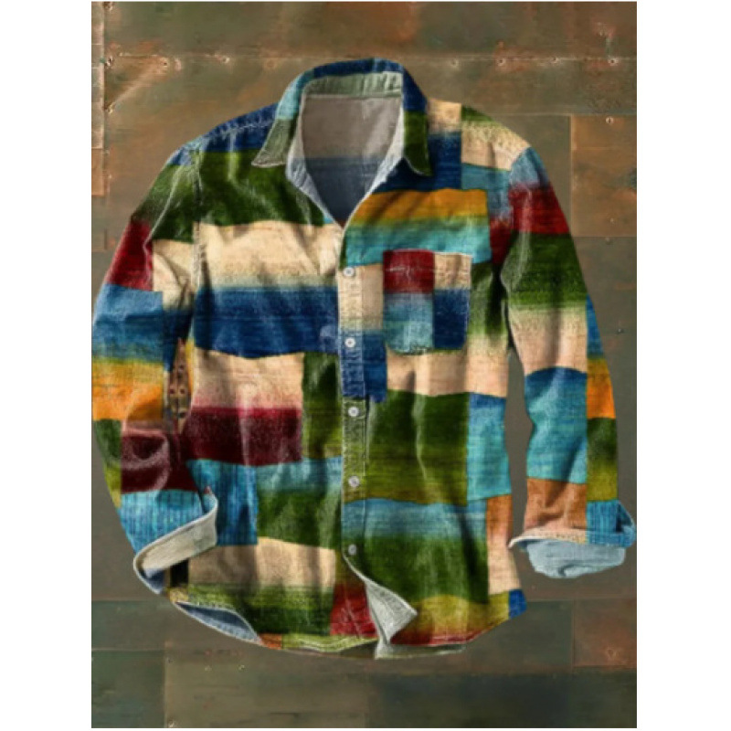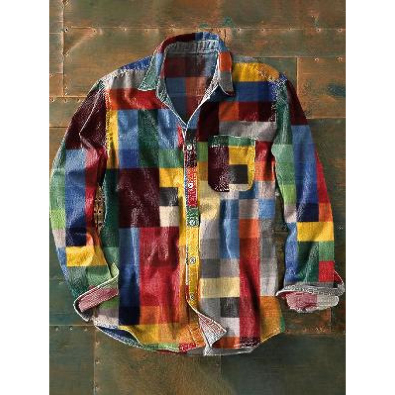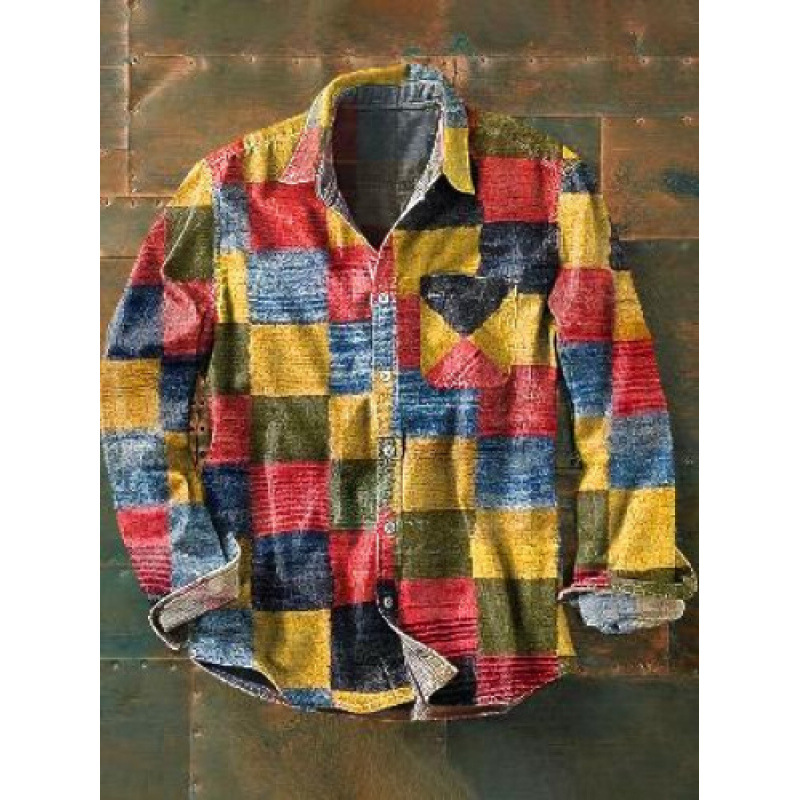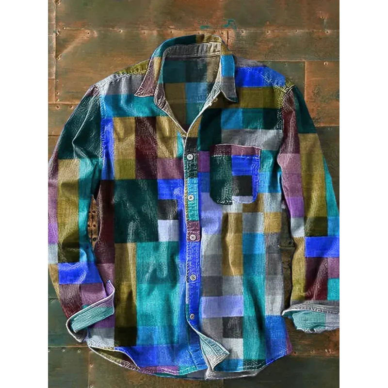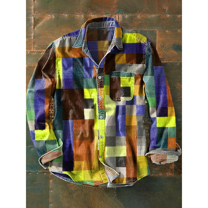 아마존 능직 셔츠 복고풍 리조트 스타일 핫 세일 컬러 블록 프린트 트렌디 남성 긴팔 버튼 탑스토어 가기