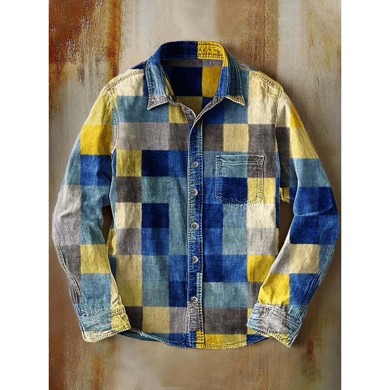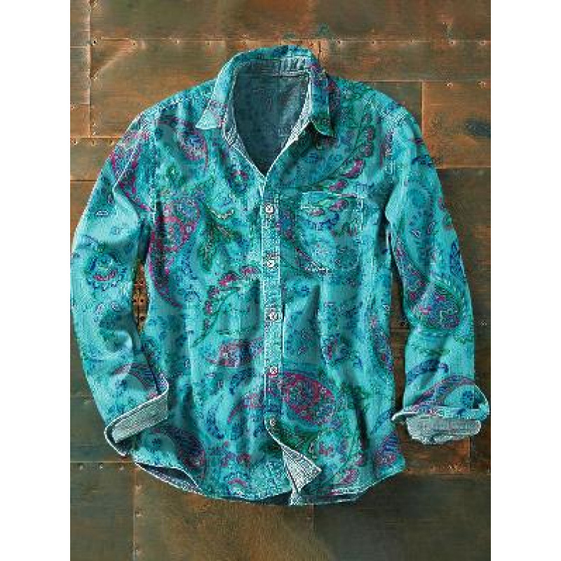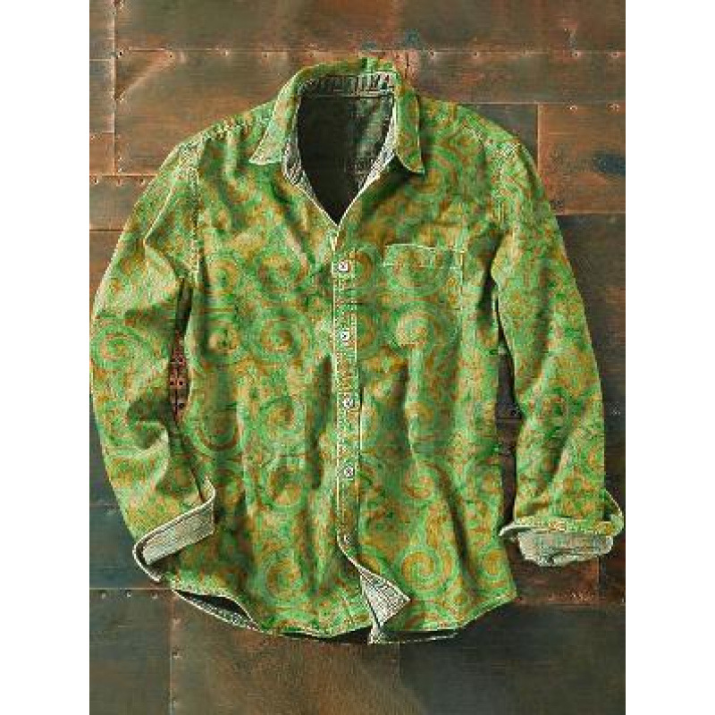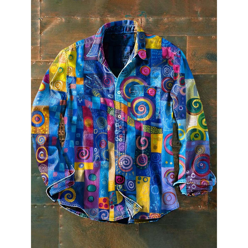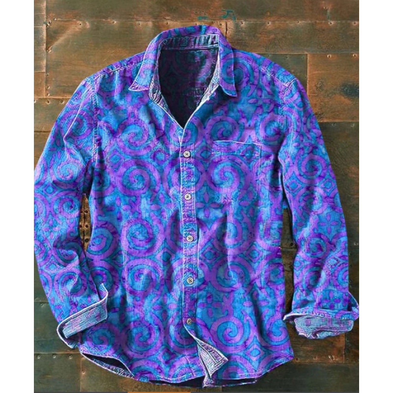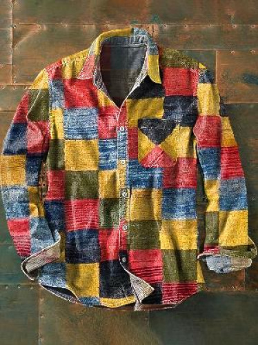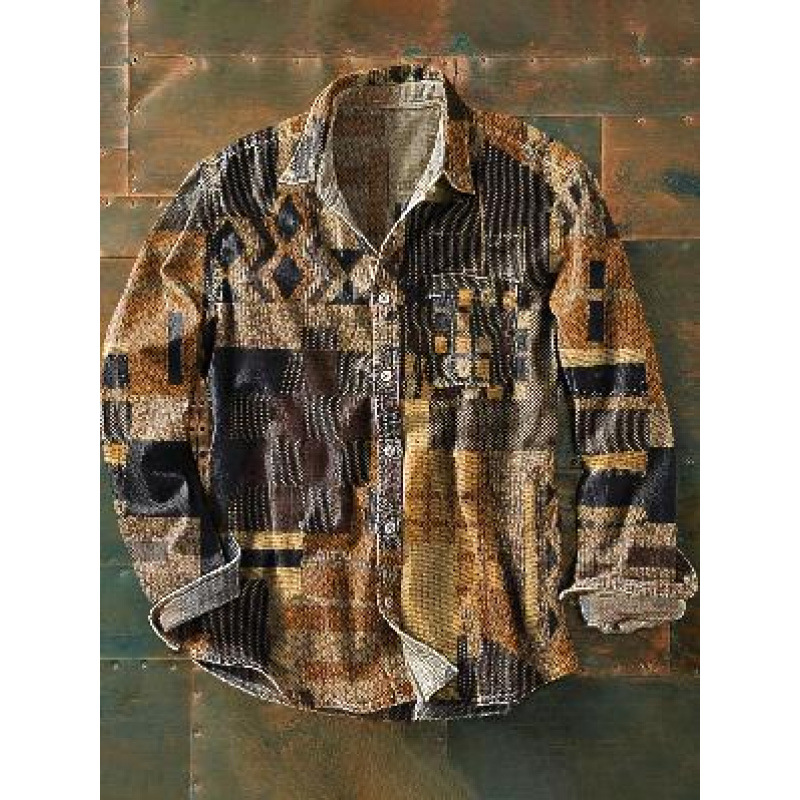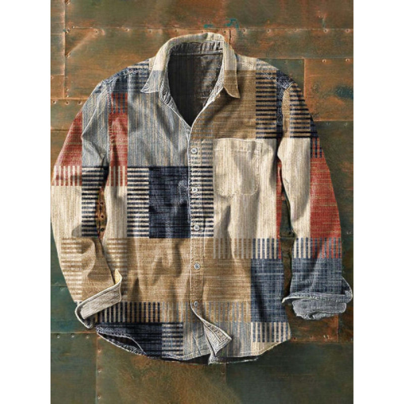 아마존 능직 셔츠 복고풍 리조트 스타일 핫 세일 컬러 블록 프린트 트렌디 남성 긴팔 버튼 탑스토어 가기