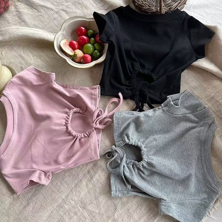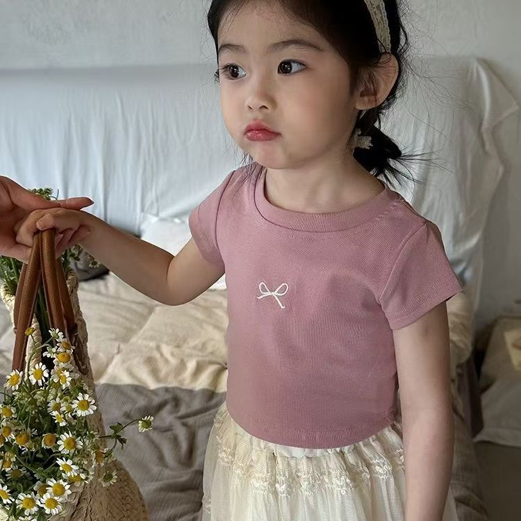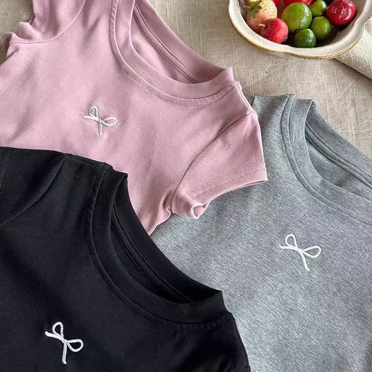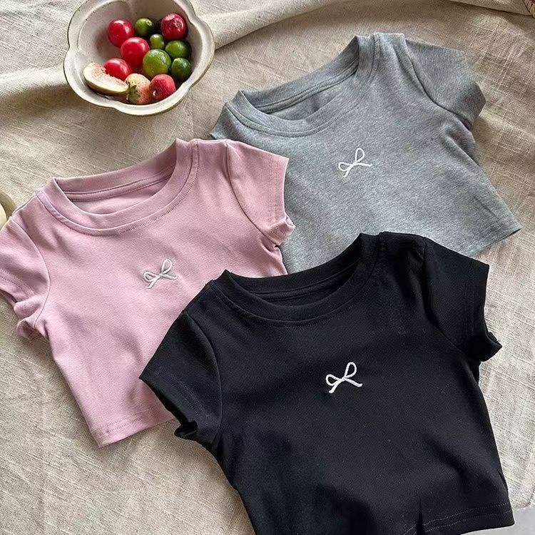 여자 보우 백리스 티셔츠 25 여름 한국 스타일 반팔 탑 순수 코튼 귀여운 서양식 바닥 셔츠 유행