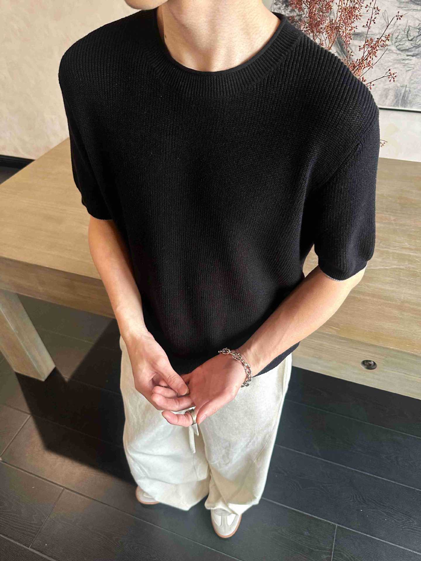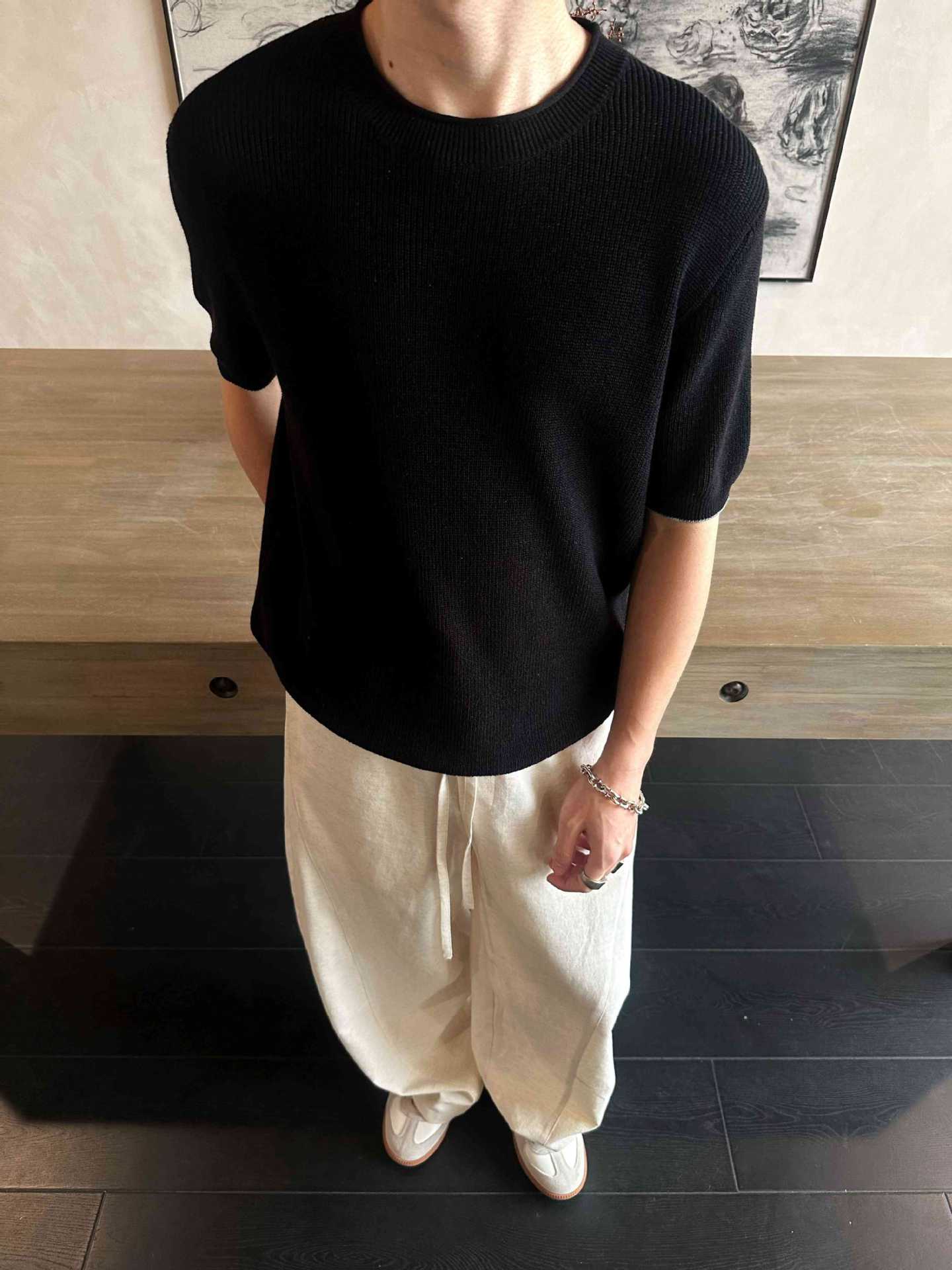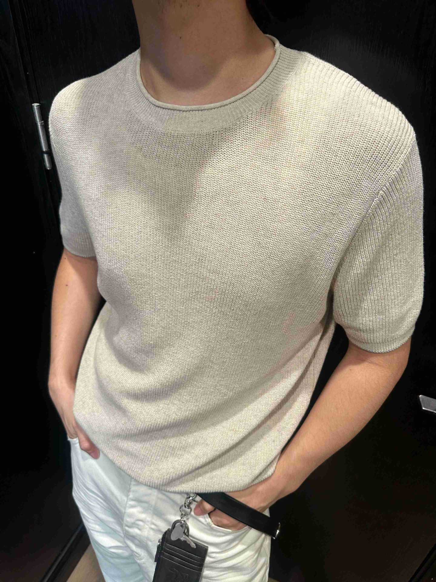 EME 남성 신사 고급 여름 니트 면 린넨 원사 올드 머니 릴렉스 통기성 라운드 넥 반팔 스웨터스토어 가기