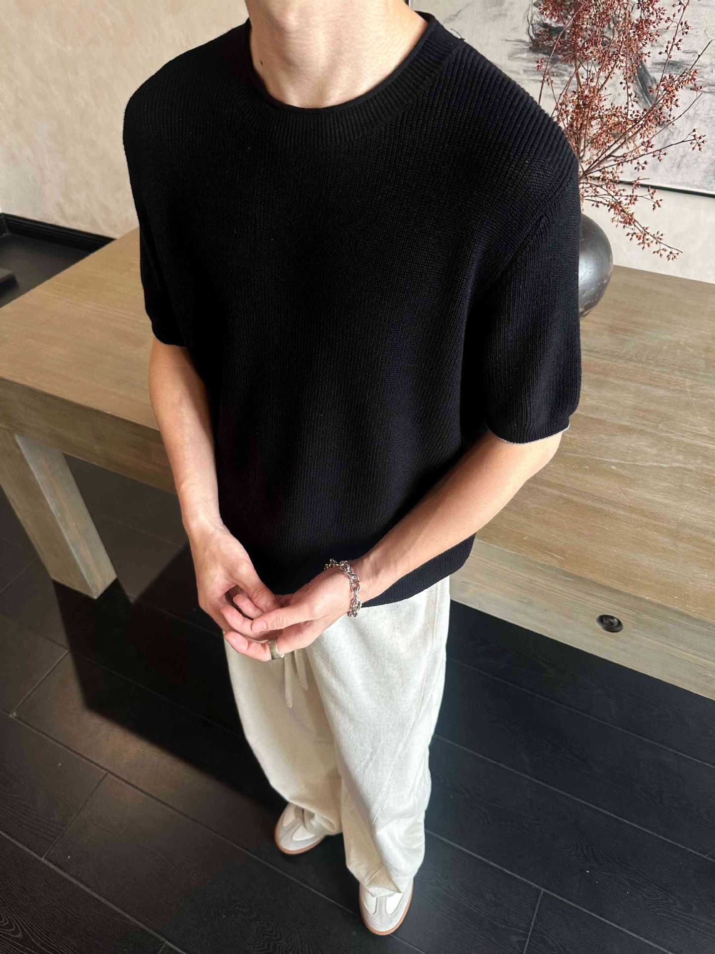 EME 남성 신사 고급 여름 니트 면 린넨 원사 올드 머니 릴렉스 통기성 라운드 넥 반팔 스웨터